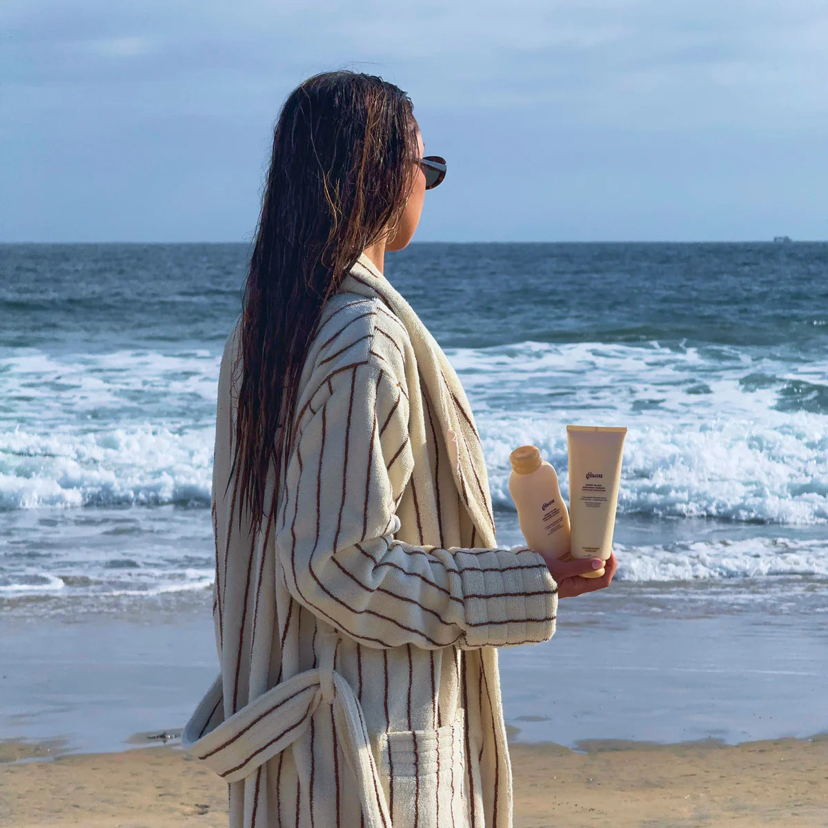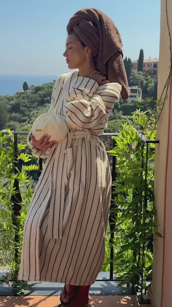 Wrap yourself in the plush, oversized comfort of our brown striped cotton terry robe—crafted in Portugal from 100% organic cotton with deep patch pockets, removable belt, ribbed trims and a shawl collar. While you unwind, let the Honey Gloss Ceramide Therapy Routine* transform your hair. Powered by Mirsalehi Honey, biomimetic ceramides and hyaluronic acid, each step helps deeply nourish, strengthen, smooth and boost shine without weighing hair down. Together, they turn a simple hair wash into a full-body pampering ritual.