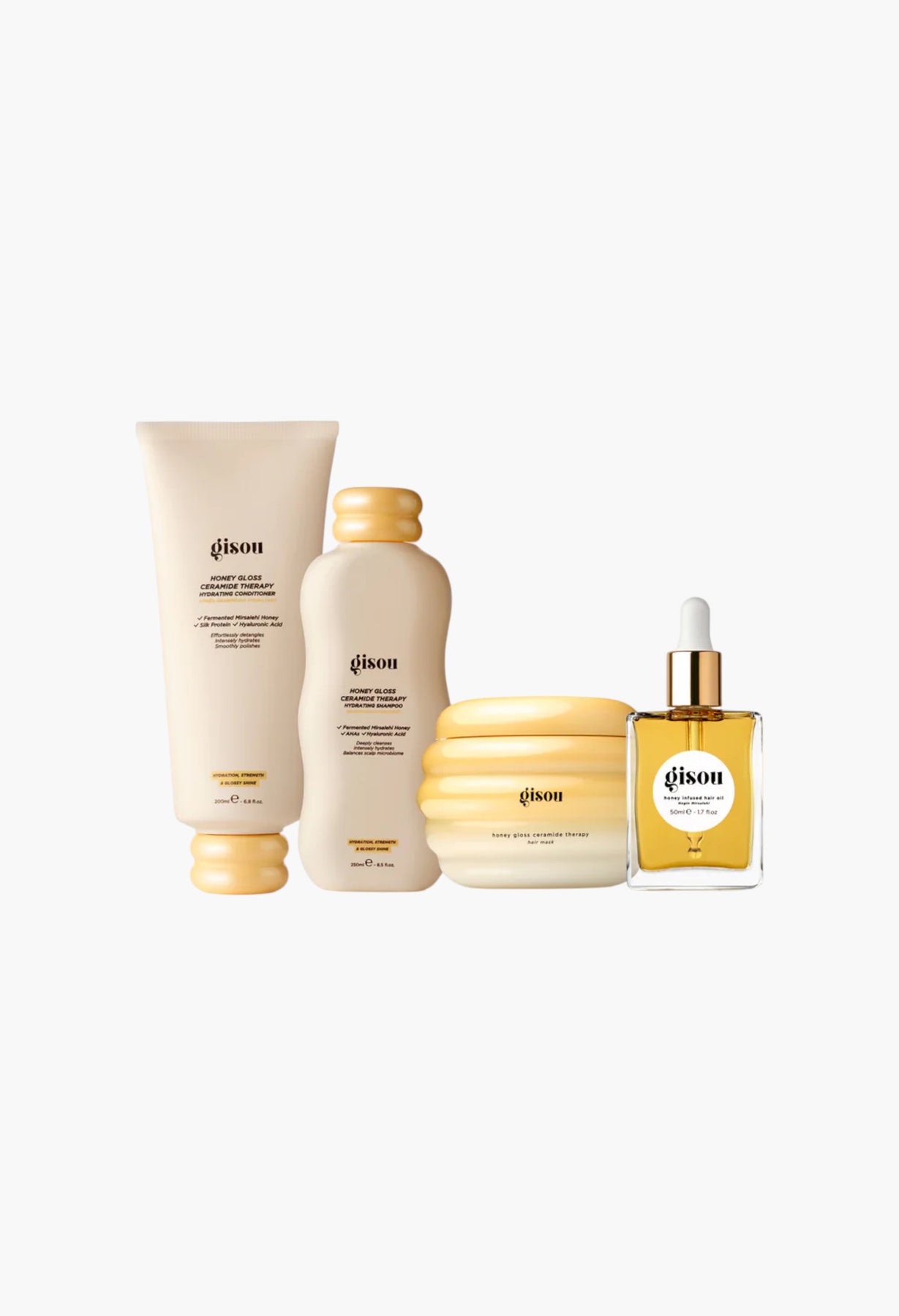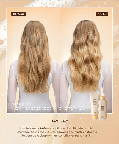 Routine includes Limited Edition Honey Gloss Bath Robe, Honey Gloss Ceramide Therapy Hydrating Shampoo, Honey Gloss Ceramide Therapy Hair Mask 230ml, Honey Gloss Ceramide Therapy Hydrating Conditioner and Honey Infused Hair Oil 50ml.