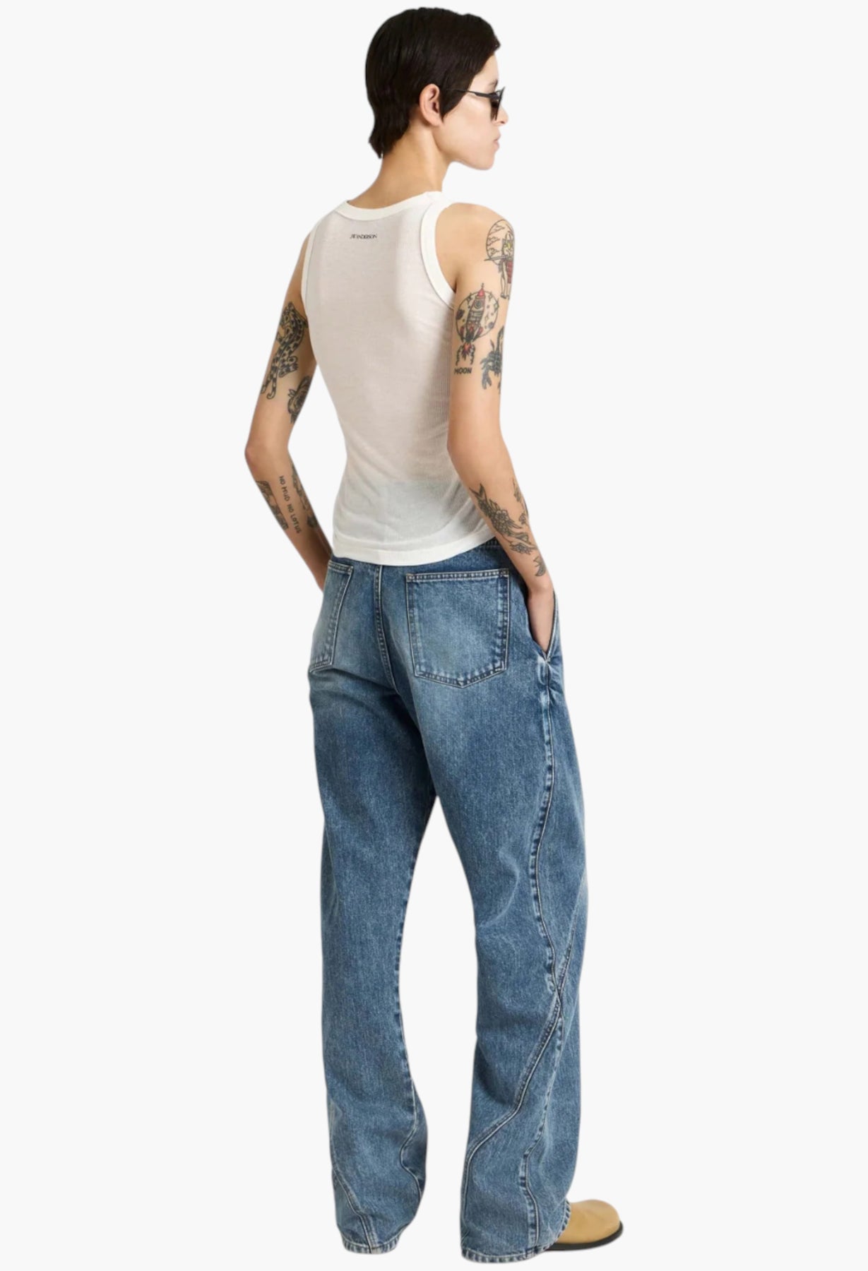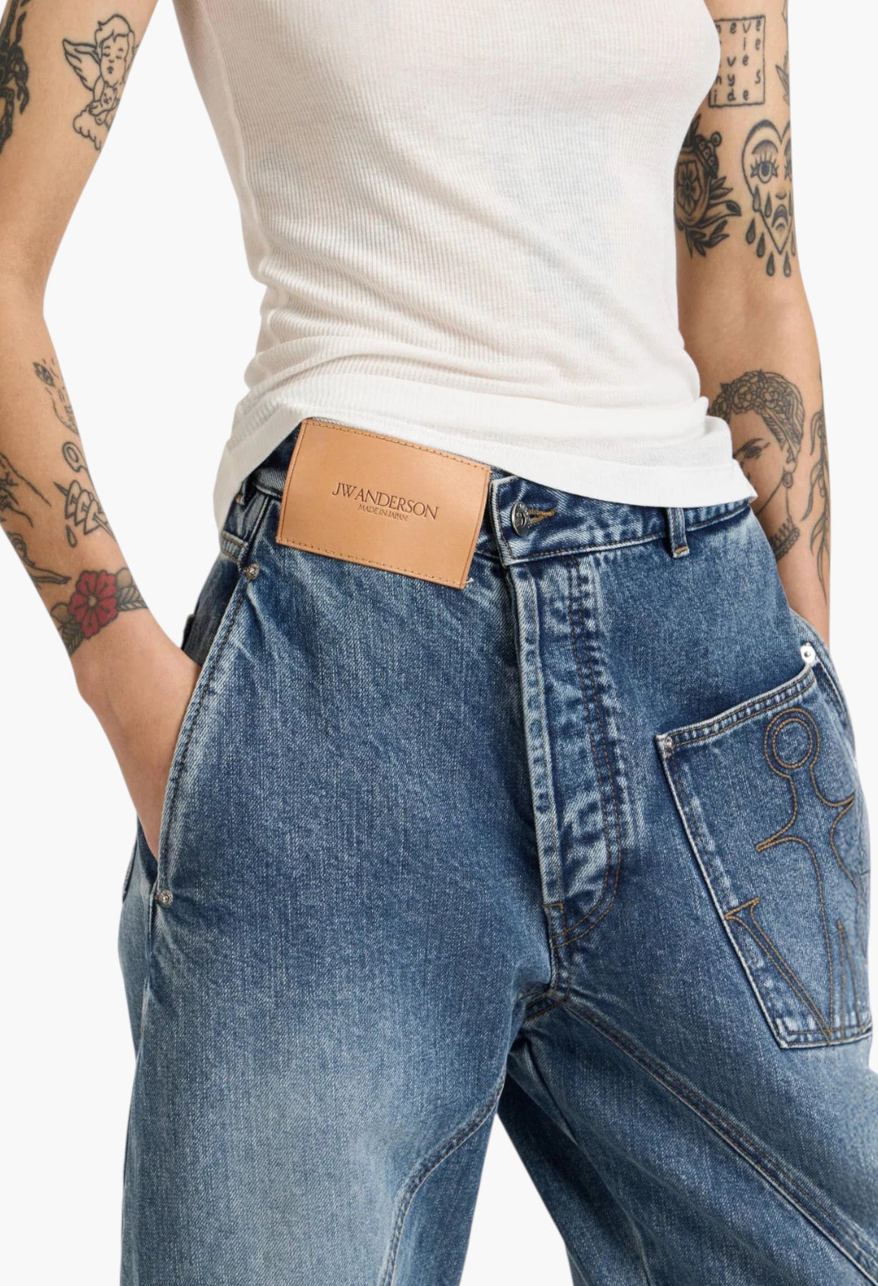 Crafted in Japan, developed in collaboration with expert Japanese denim makers. Twisted workwear denim jeans in mid blue. Features a large leather logo patch and anchor stitched pocket. Finished with engraved metal shank buttons, logo rivets and orange binding.