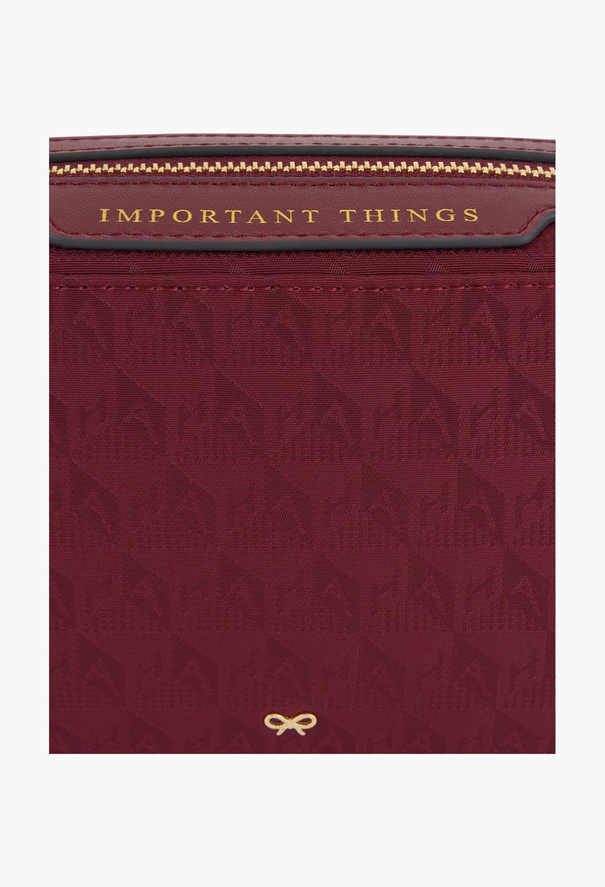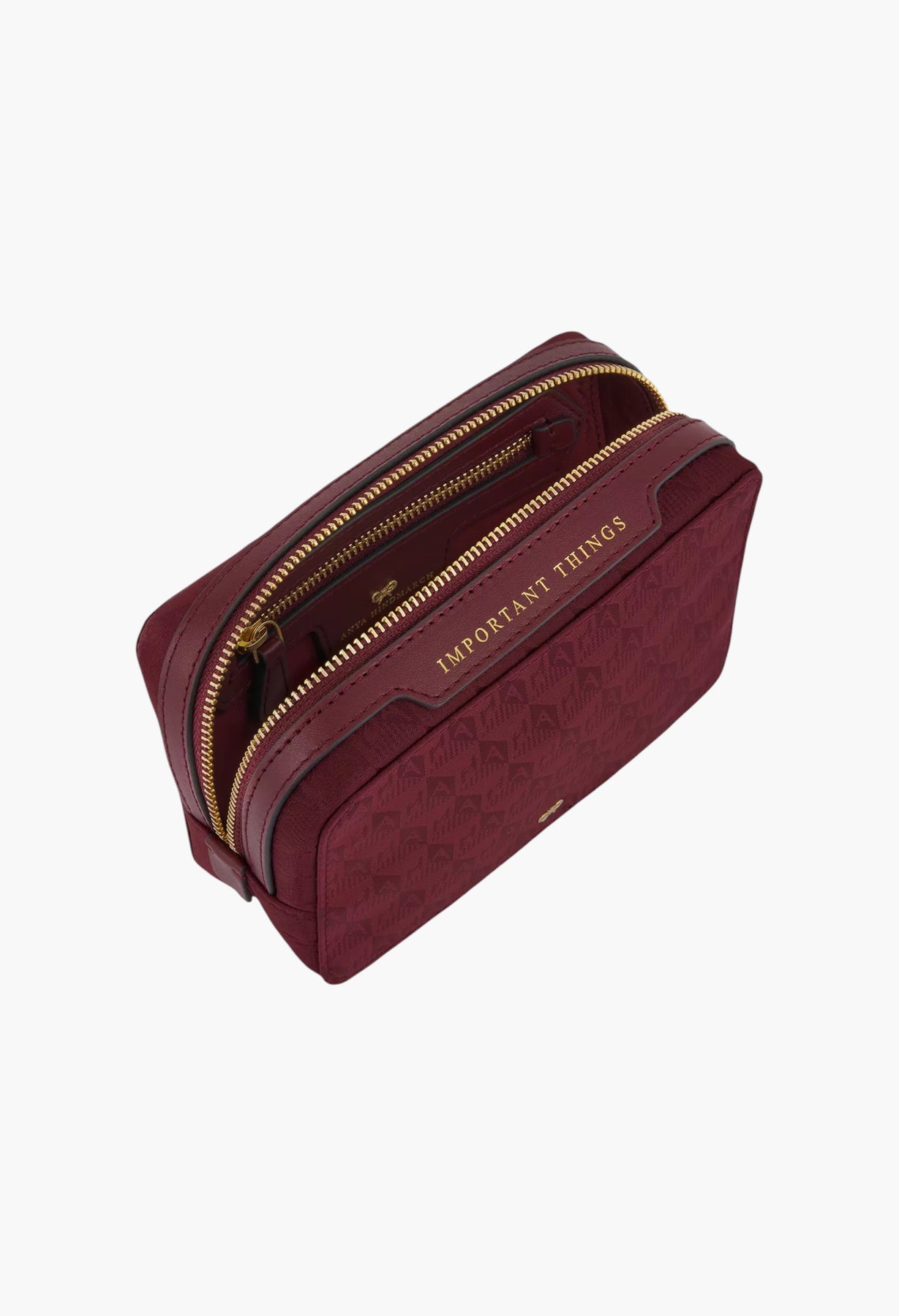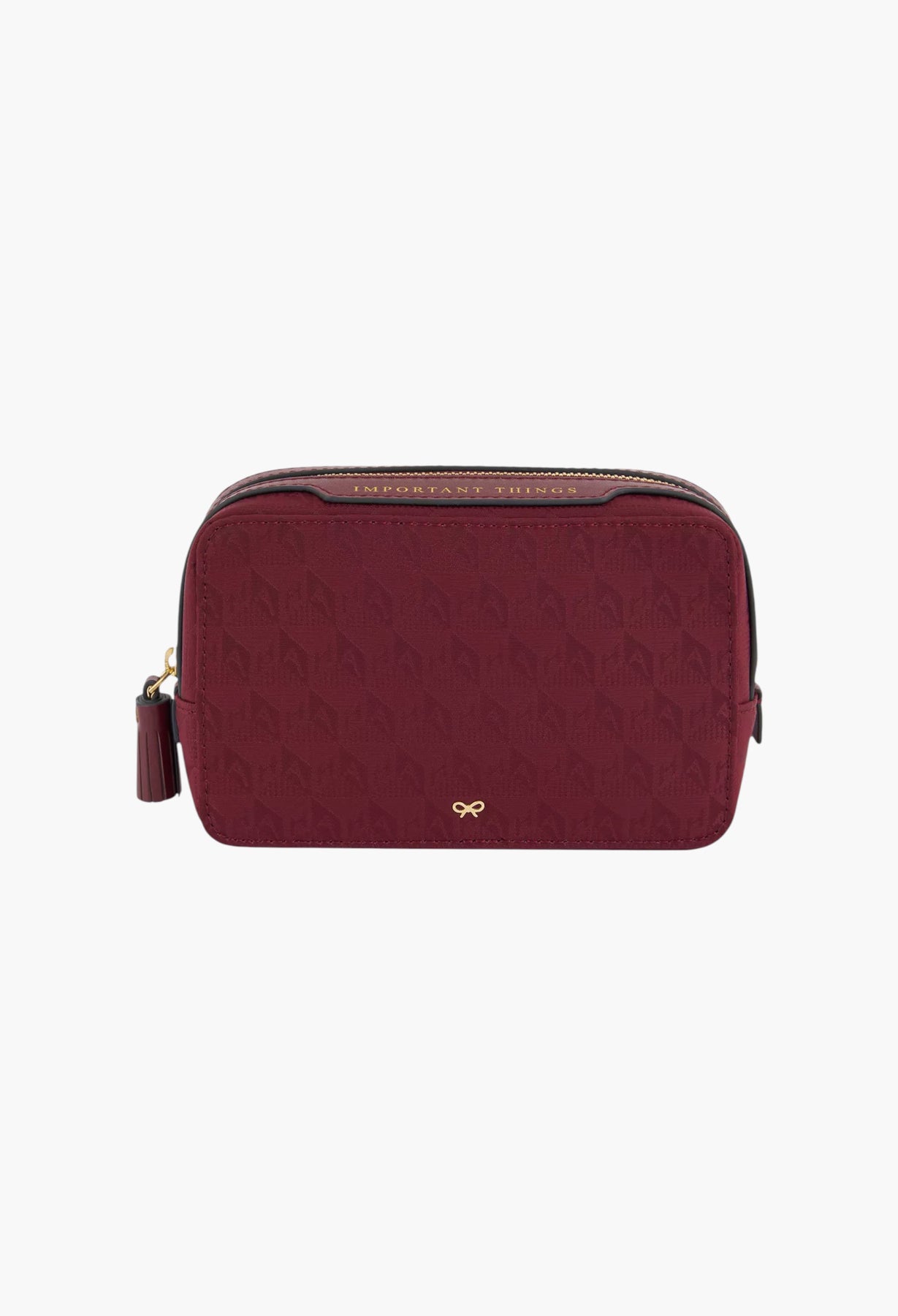 Structured shape, embossed slogan nameplate, gold-toned bow embellishment, patent leather trim, one main compartment, one interior zip pocket, embossed fabric lining, all-over logo jacquard pattern