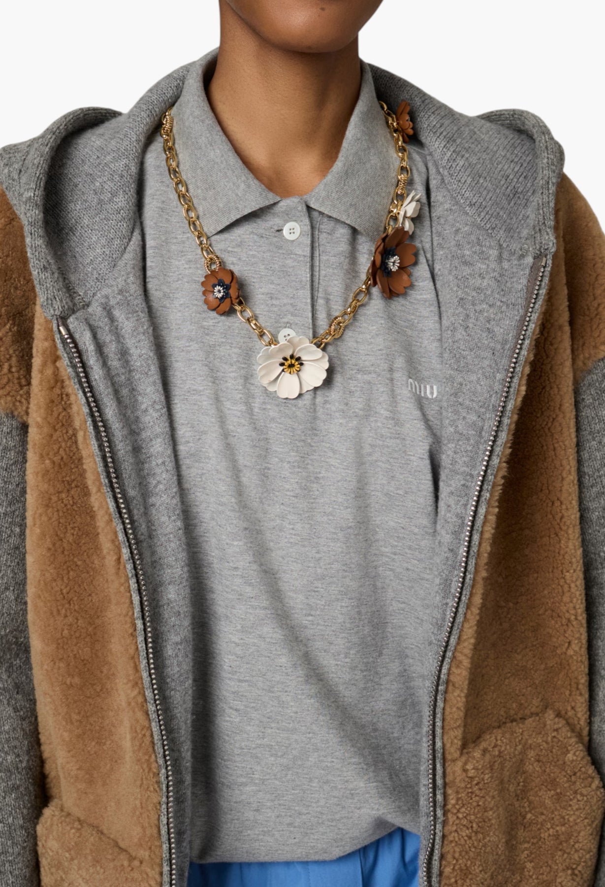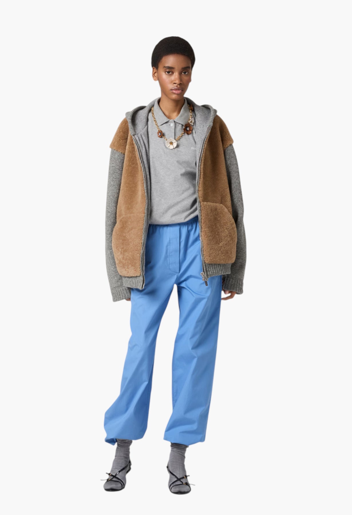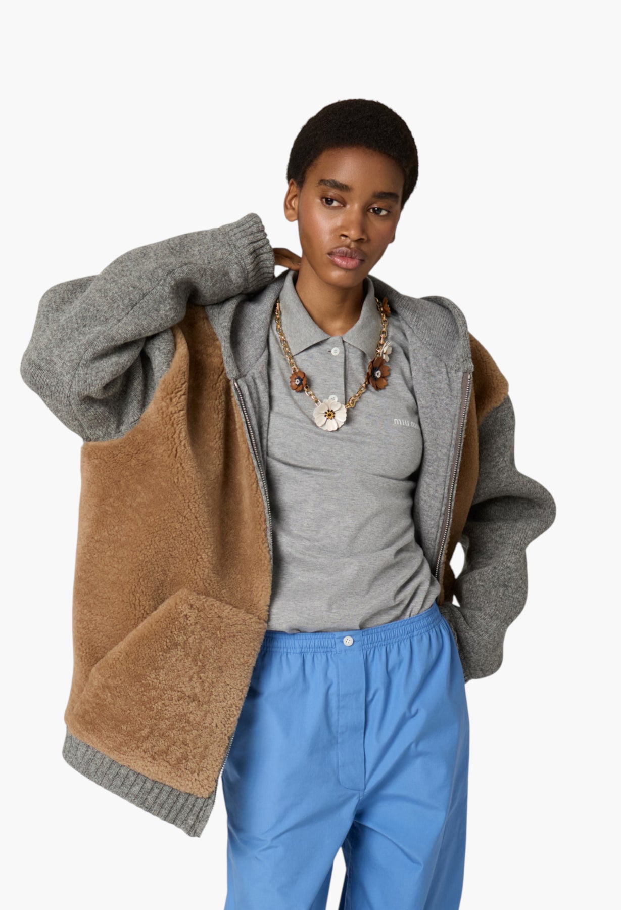 Jersey, an emblematic fabric in the Miu Miu wardrobe, reinterprets the simple character of the polo shirt, playing with menswear classics and highlighting its relaxed and contemporary versatility.