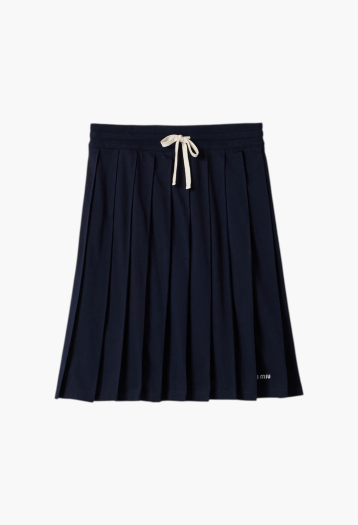 Jersey, an emblematic fabric in the Miu Miu wardrobe, reinterprets the character of the classic pleated skirt through the garment dyeing process, which enhances its relaxed versatility and contemporary femininity.
