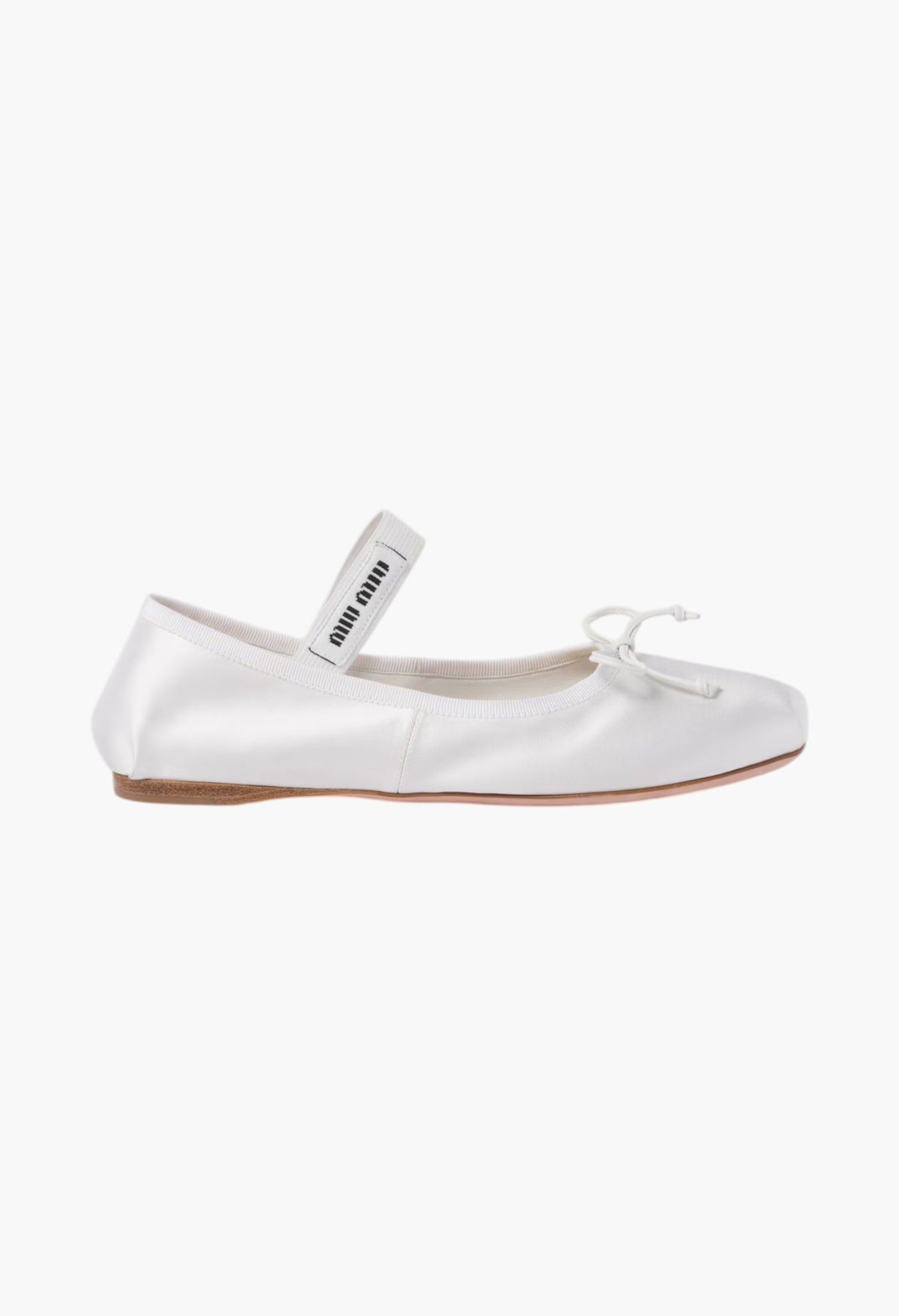 These ballerinas, an iconic and distinctive style of Miu Miu collections presented during the Fall Winter 2022 show, are the original design made of satin and decorated with very feminine details like the bow and the elastic band with logo.