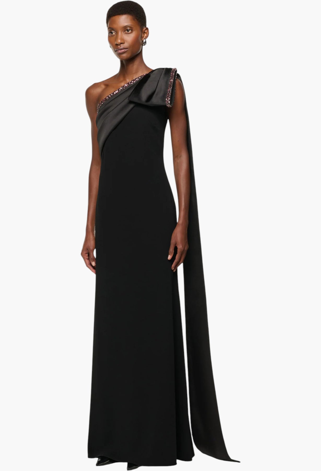 Contrast Crystal Trimmed Bow Satin Crepe Gown