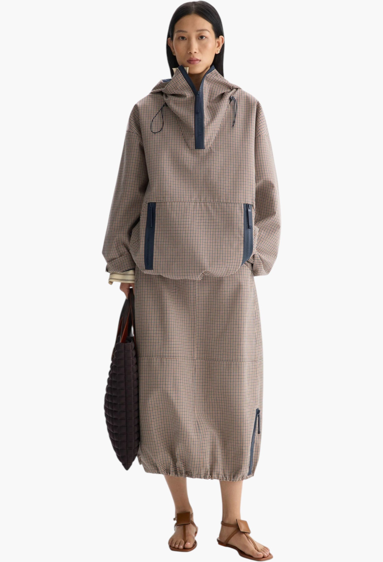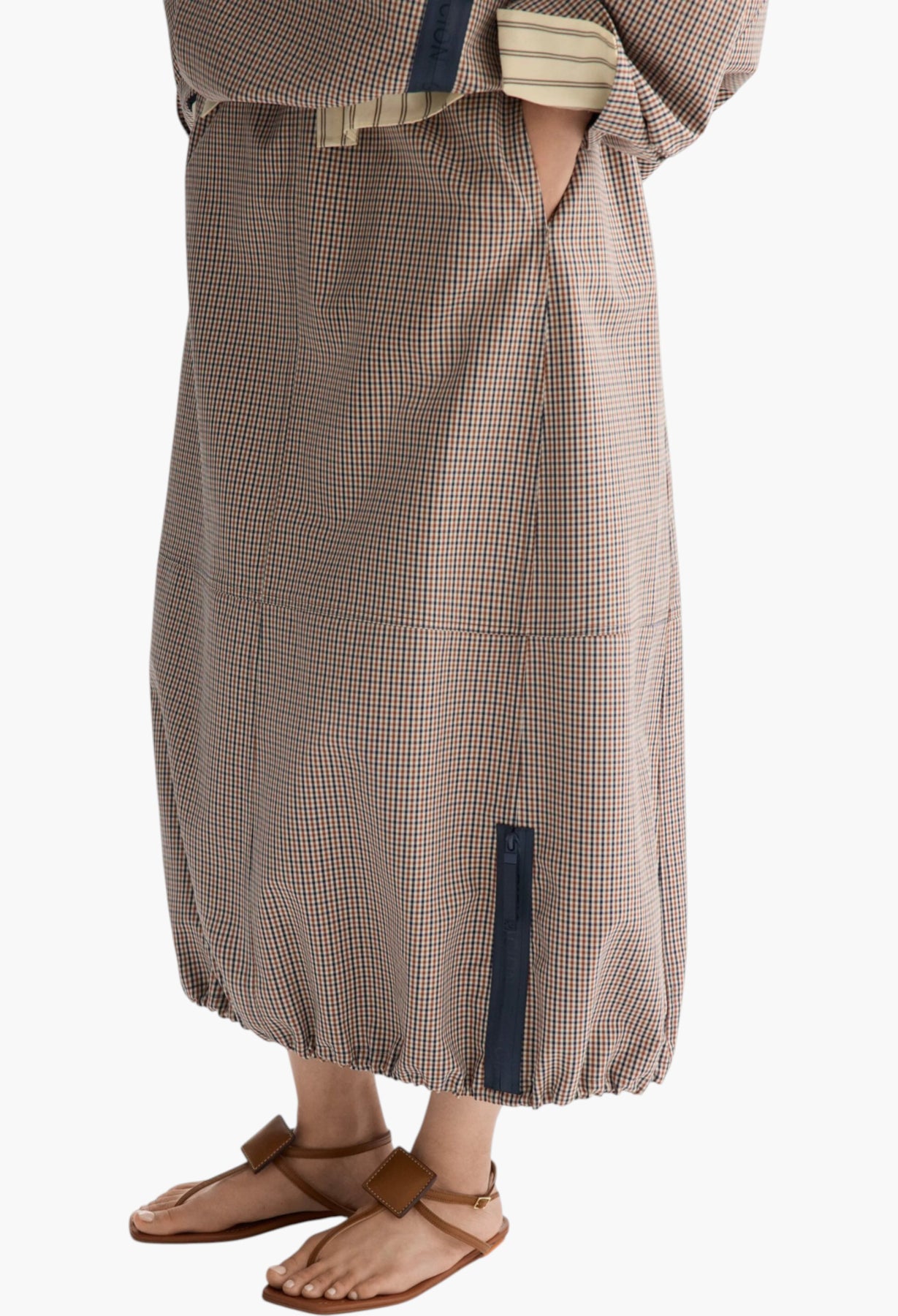 Balloon-fit midi skirt in technical cotton with multicolour chequered print. Adjustable waistband and hem, side pockets and two decorative side personalised heat-sealed zips at the hem. Matching coat sold separately. Model is 174 cm | 5' 8'' and is wearing a size Small.