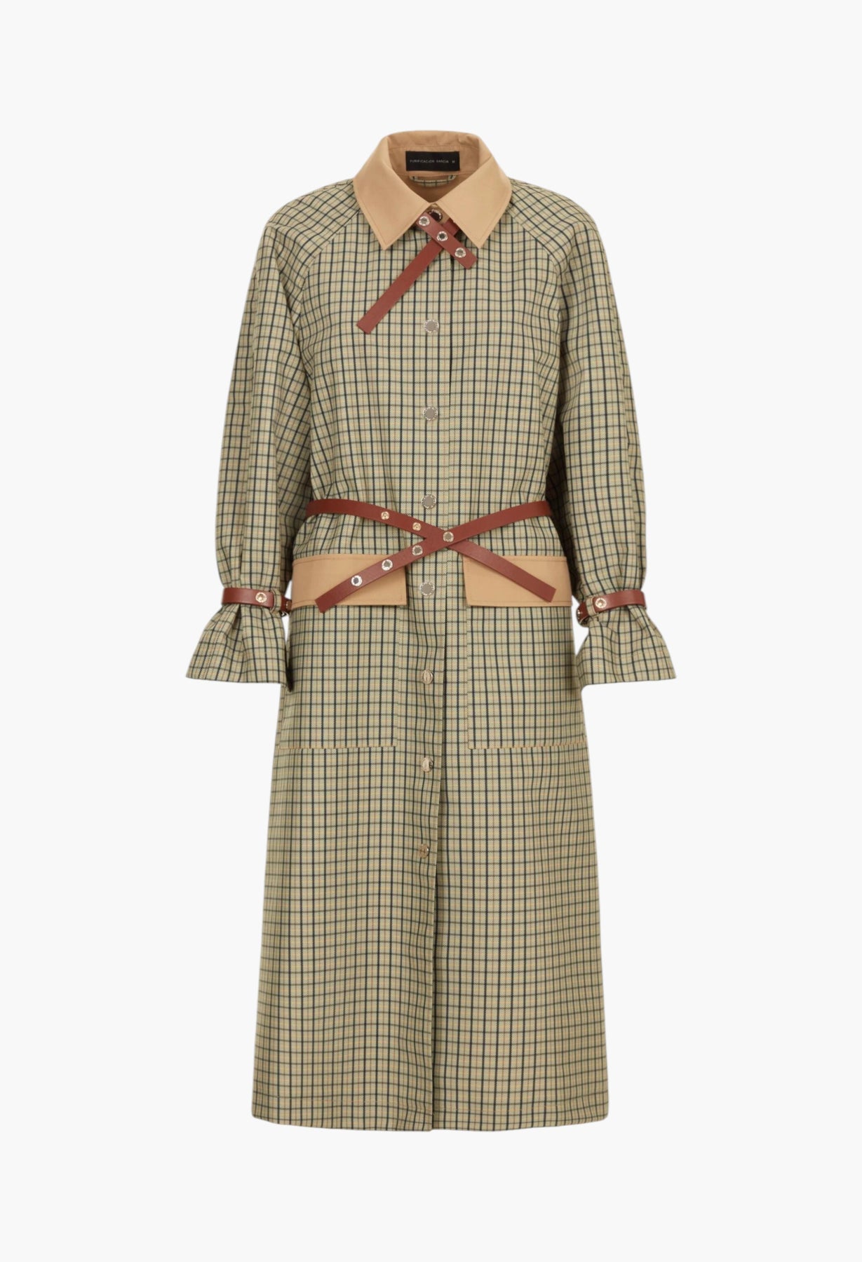 Below-the-knee-length and straight-fit Mackintosh-style trench coat in technical cotton with multicolour chequered print and contrasting plain collar and flaps. Spread collar, personalised metallic snap fastening and two front flap pockets. Raglan sleeves and adjustable faux-leather belts with metallic snaps. Leather patch embossed with Cubo PG at the back. Model is 174 cm | 5' 8'' and is wearing a size Small.