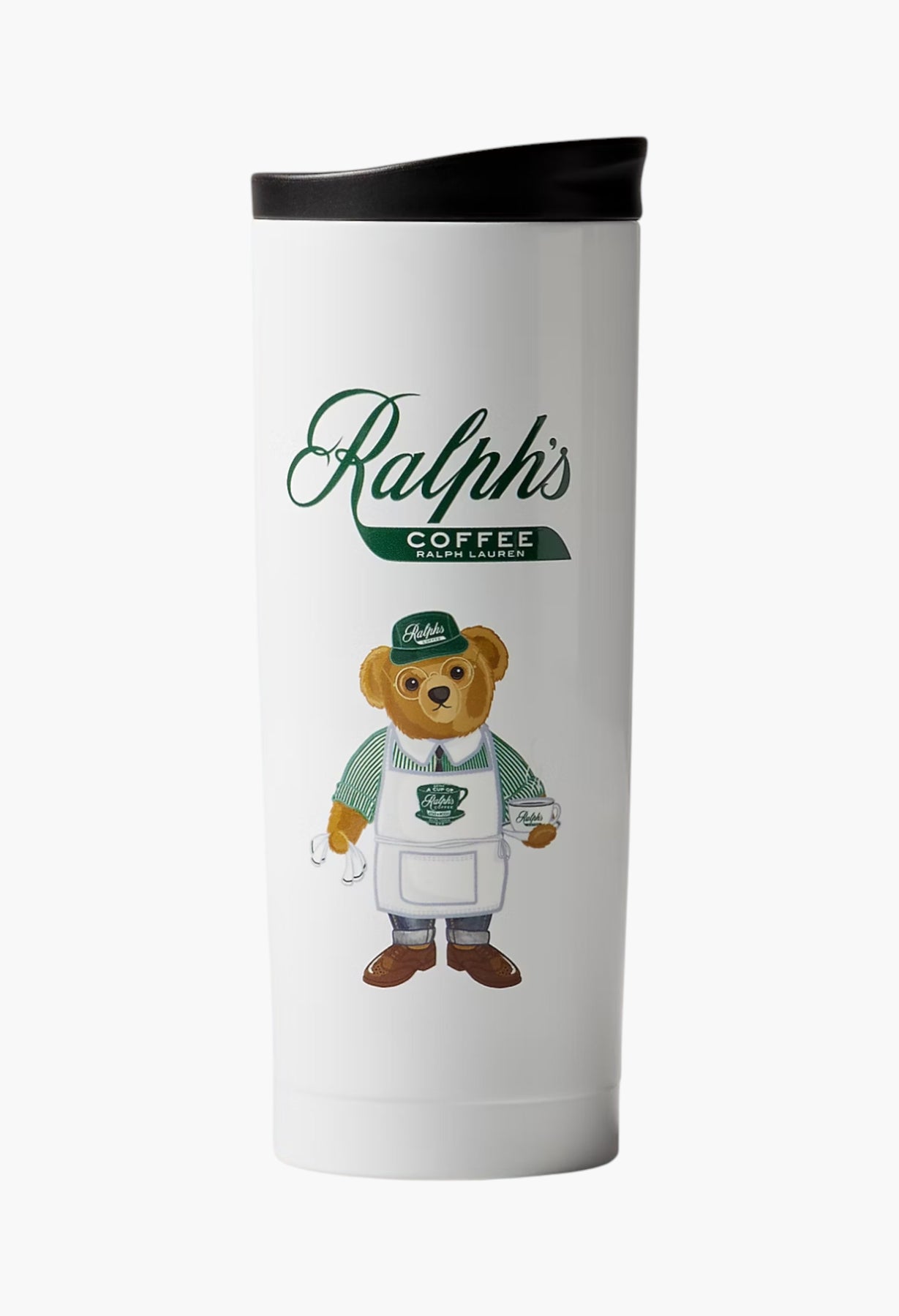 This reusable tumbler is crafted from stainless steel with double-wall insulation. The playful Ralph's Coffee graphic showcases a barista-inspired iteration of our signature Polo Bear.