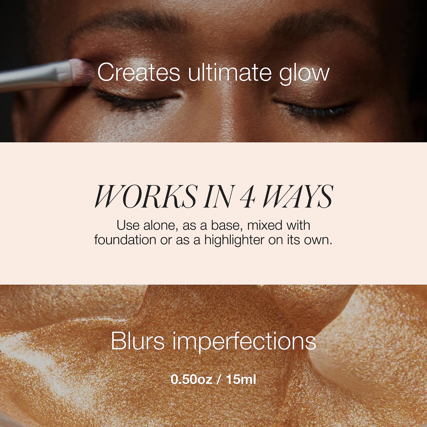 Use on its own for natural radiance, as a first step prior to foundation, mixed with foundation to add dimension and warmth or applied directly to elevated areas of the face to amplify glow. When used on its own or as the first step, warm a small amount of product between fingers and apply a thin layer all over the face, massaging into skin as you would a moisturiser. To use with foundation, mix both products on the back of your hand and then apply.