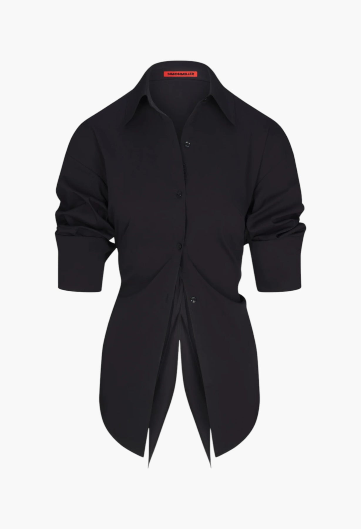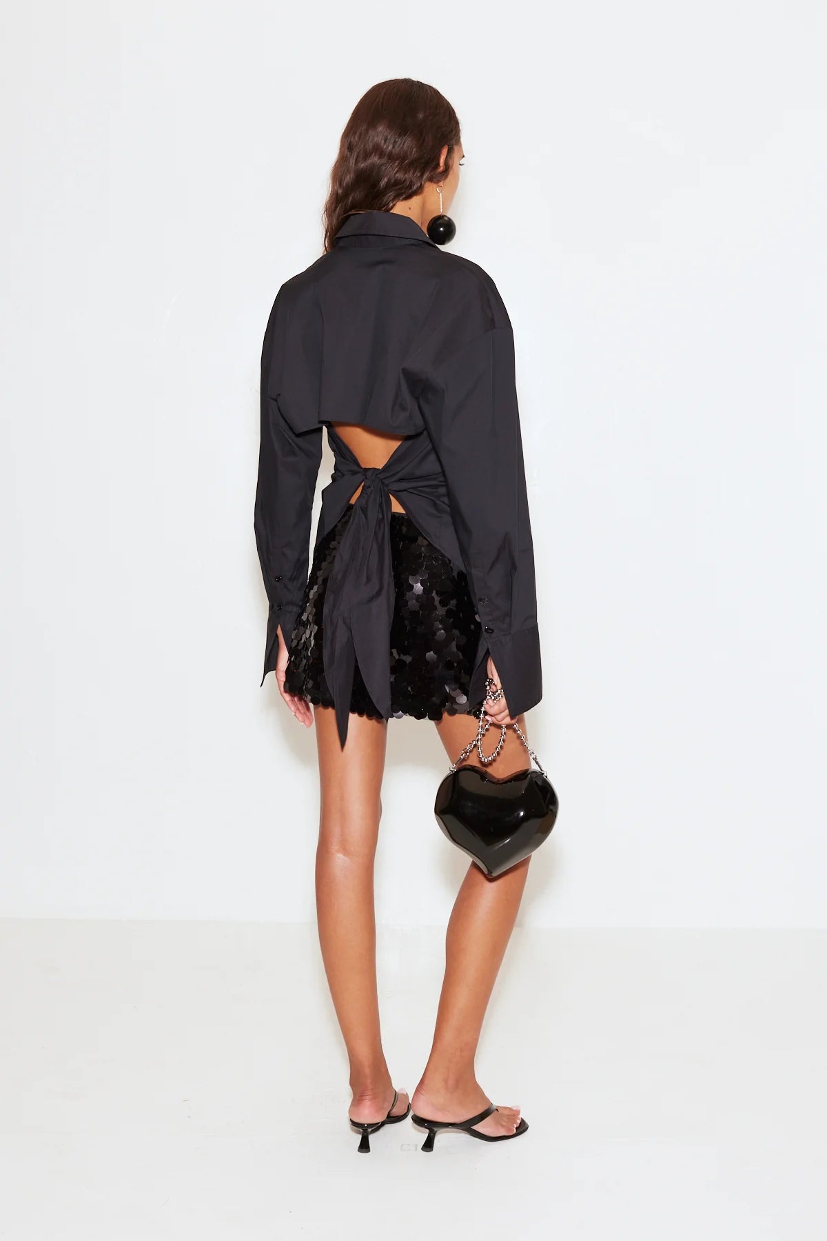Stretch cotton poplin, with cut out back and adjustable tie for fit flexibility. The ultimate versatile piece, dress up or down.