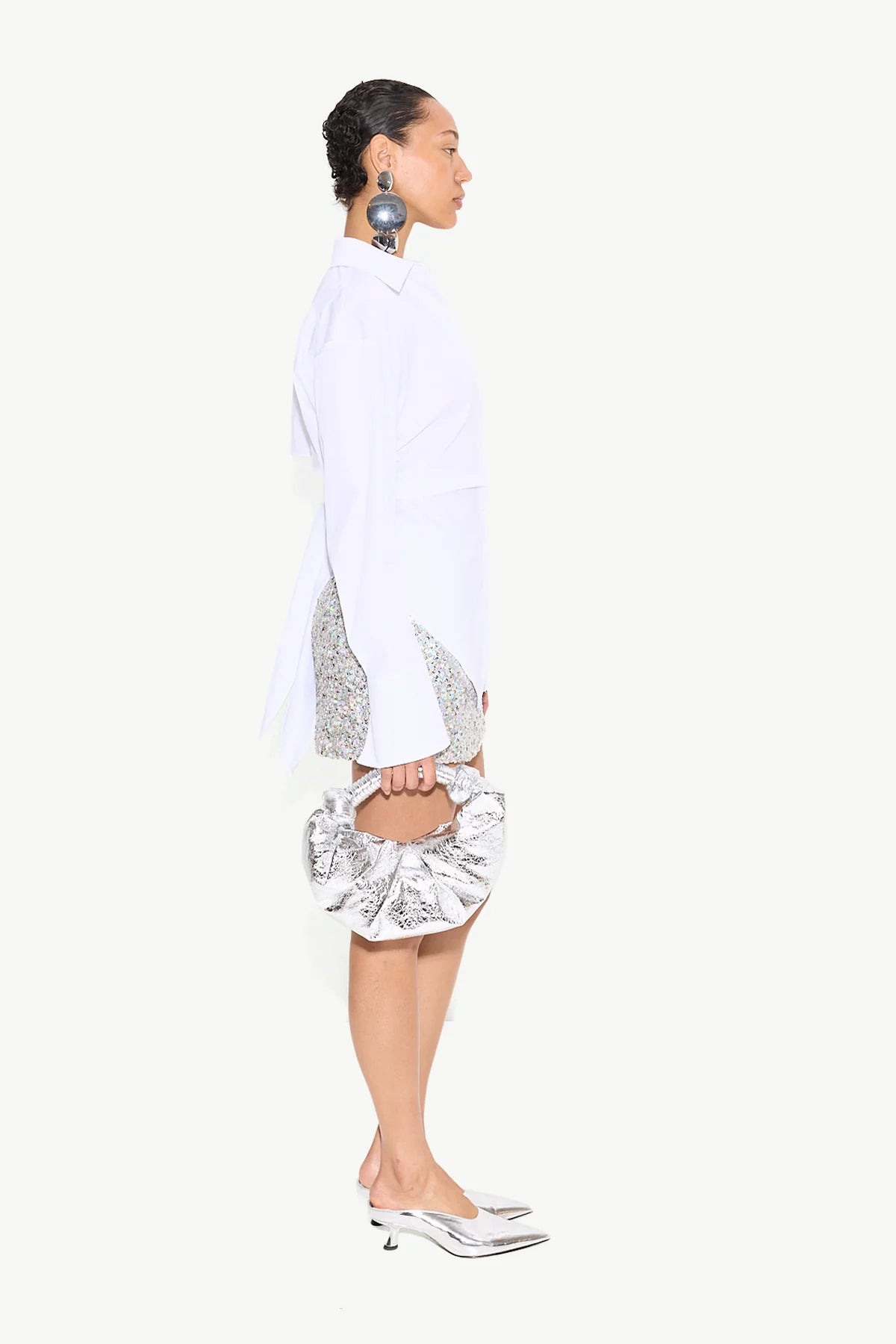 Stretch cotton poplin, with cut out back and adjustable tie for fit flexibility. The ultimate versatile piece, dress up or down.