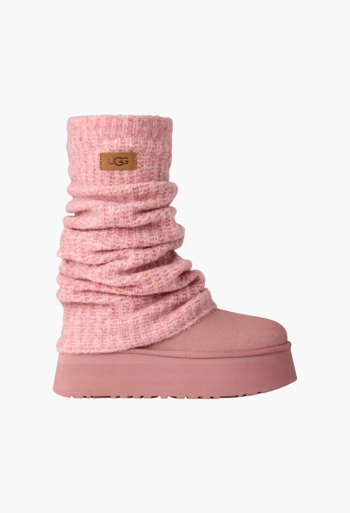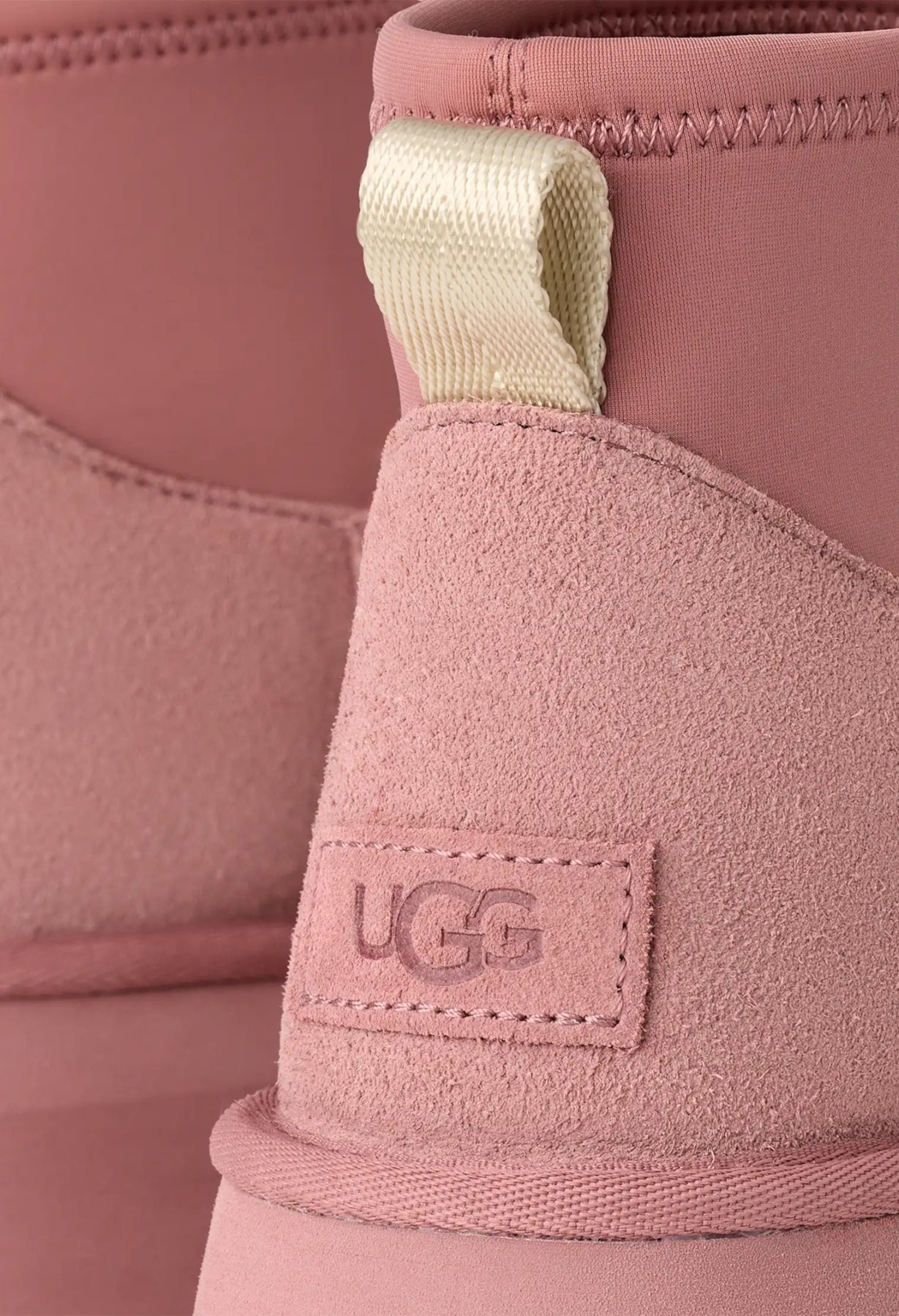 - The UGG® Logo, embossed suede heel label