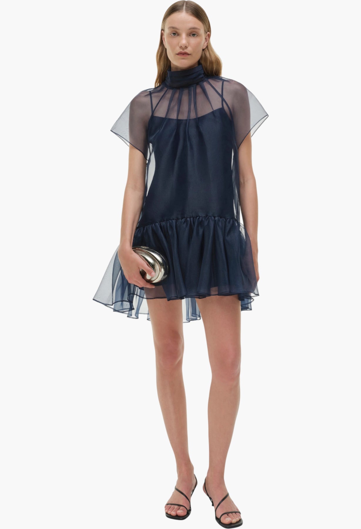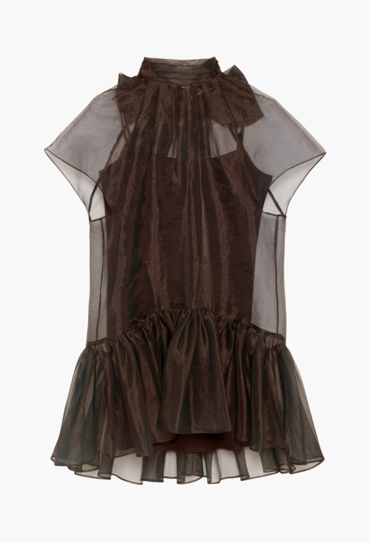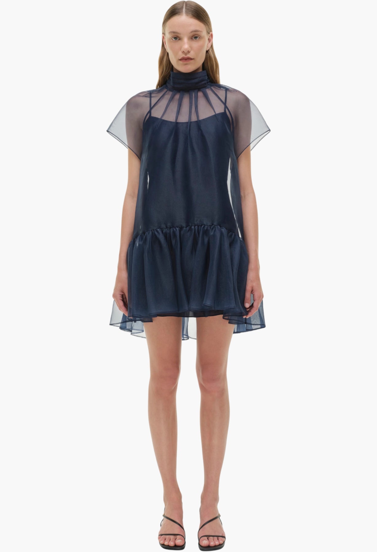 A sheer organza mini dress with an attached slip underlayer, gathered mock neckline, short sleeves, drop waist, and flared skirt.