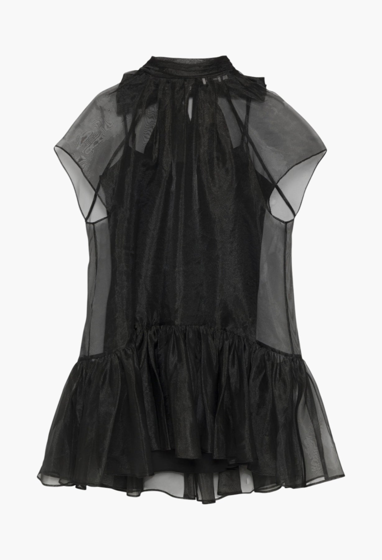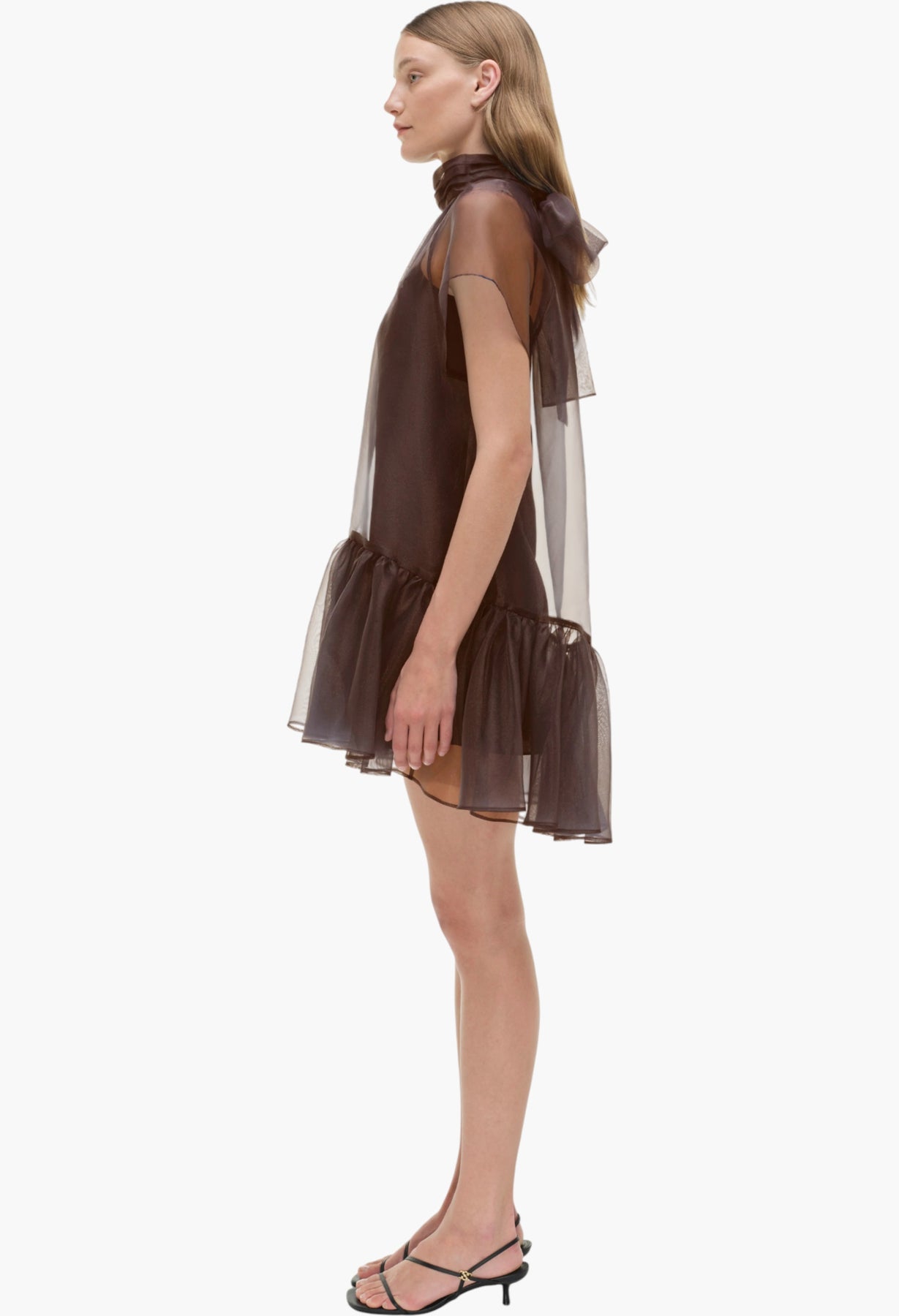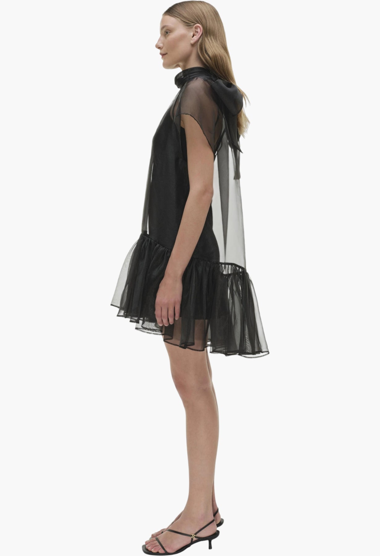 A sheer organza mini dress with an attached slip underlayer, gathered mock neckline, short sleeves, drop waist, and flared skirt.