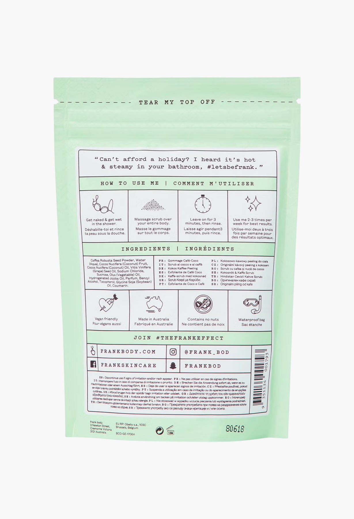Gorgeously glowing skin is only a shower away Meet frank bodys Coconut Coffee Scrub, a bearer of soft, hydrated, radiant skin that smells oh-so fine. Using natural, vegan and cruelty-free ingredients, the scrub utilises roasted coffee grinds and jojoba beads to gently exfoliate away dead and dull skin cells, while promoting collagen production and blood flow. Coconut oil takes the reigns on the hydration front, providing a surge of moisture to thirsty skin that lasts long beyond the bathroom and lets not forget its anti-bacterial properties, which will soothe irritation often associated with dry and patchy skin. The scrubs glow-giving powers come largely from grapeseed oil an oil full of fatty acids and vitamins C, D and E to help fade scarring and marks while tightening and protecting from environmental aggressors. Just when you thought it couldnt get any better, the scrub is free from all sorts of nasties including parabens, sulphates and PEGs