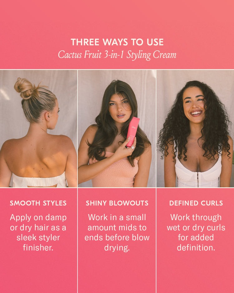 Use our Cactus Fruit 3-in-1 Styling Cream to: 1) Create Smooth Styles: Use a small amount on damp hair and let air dry or on dry hair as a sleek style finisher. 2) Prep shiny blowouts: Work in a small amount mid to ends before blow drying. 3) Define natural curls: Work through wet or dry curls for definition.