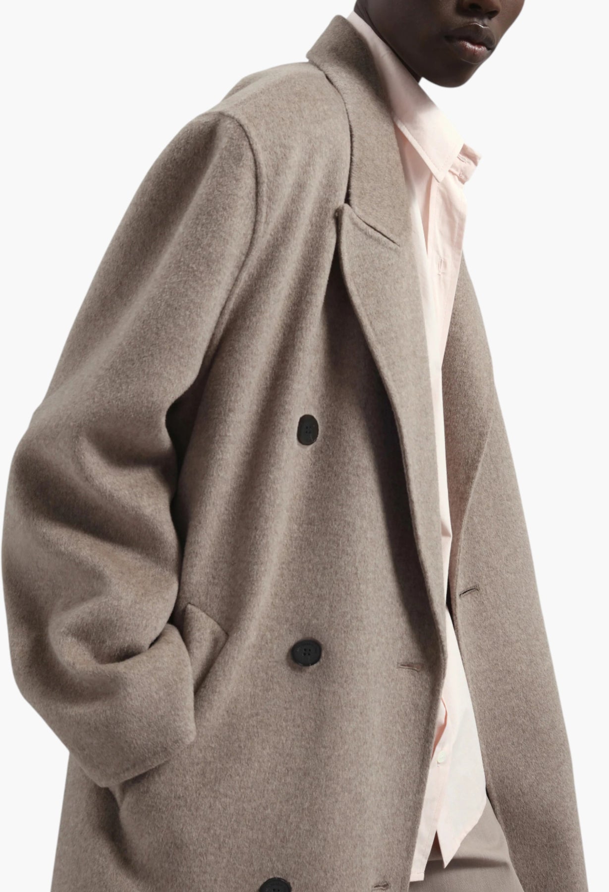 This Double Breasted Coat is crafted from a midweight wool-blend fabric, offering structure, warmth, and an effortlessly refined silhouette.
