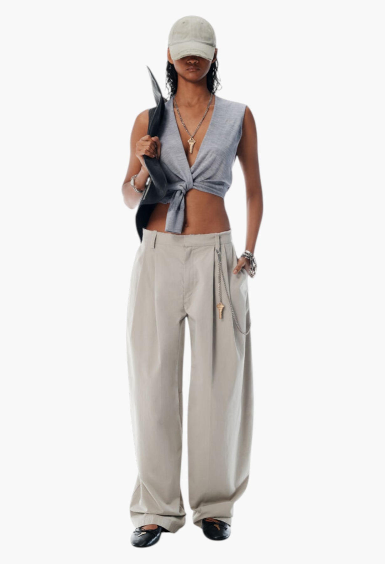 Cut in a mid-rise balloon leg with a double-pleat front and articulated back knee, this wool pant features a cut-off effect waistband. The stone garment wash lends a vintage-effect look, while allover pressed creasing and a stacked leg emphasize the tailored styling. A detachable chain belt completes the trousers.