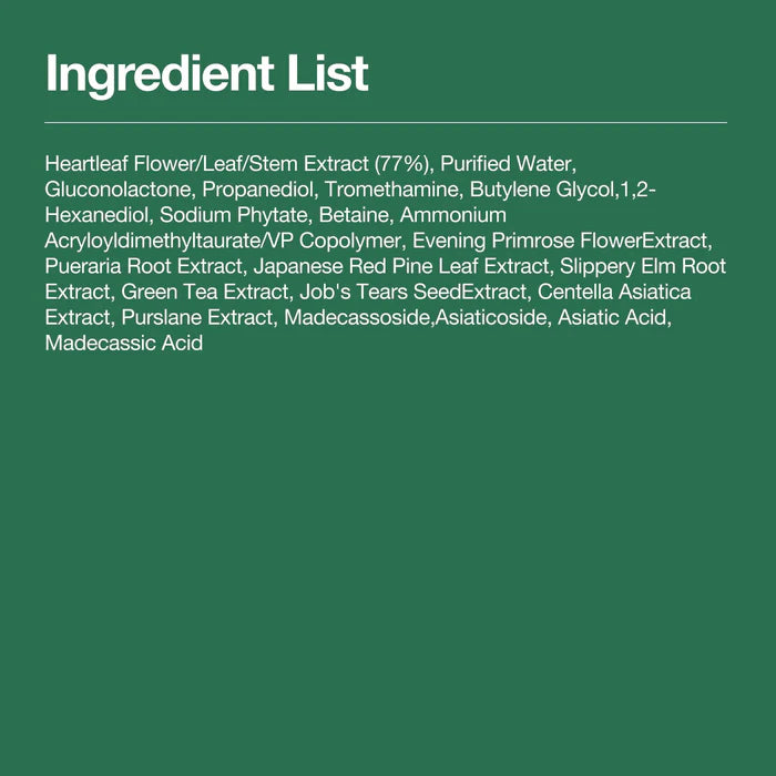 Houttuynia Cordata Extract (77%), Water, Gluconolactone, Propanediol, Tromethamine, Butylene Glycol, 1,2-Hexanediol, Betaine, Ammonium Acryloyldimethyltaurate/VP Copolymer, Ulmus Davidiana Root Extract, Pueraria Lobata Root Extract, Pinus Palustris Leaf Extract, Oenothera Biennis (Evening Primrose) Flower Extract, Camellia Sinensis Leaf Extract, Coix Lacryma-Jobi Ma-Yuen Seed Extract, Portulaca Oleracea Extract, Centella Asiatica Extract, Madecassoside, Asiatic Acid, Asiaticoside, Madecassic Acid, Sodium Phytate.