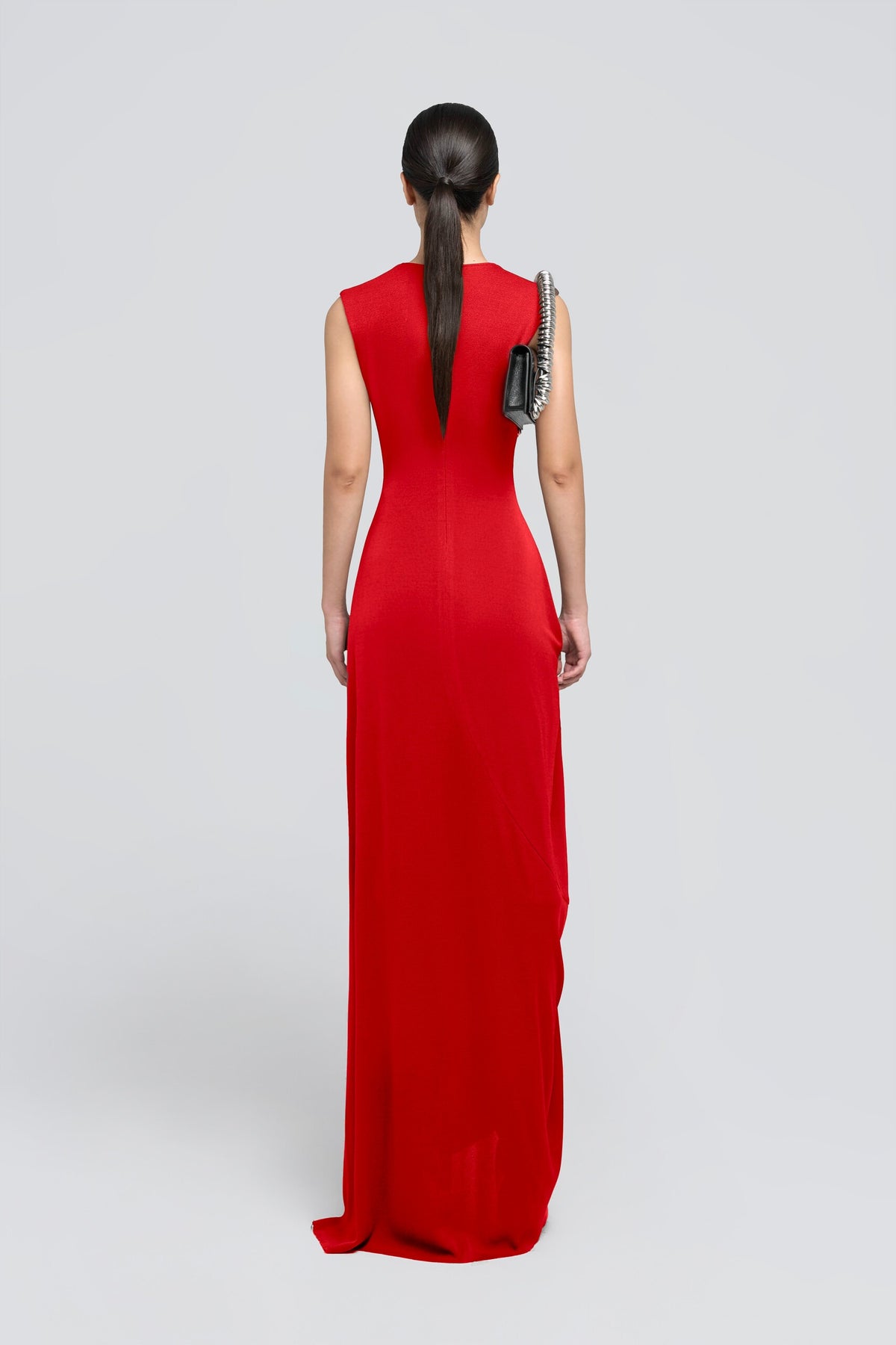 Sleeveless Interlock Knit dress with oval-cut neck, symmetric draped details and metal buttons