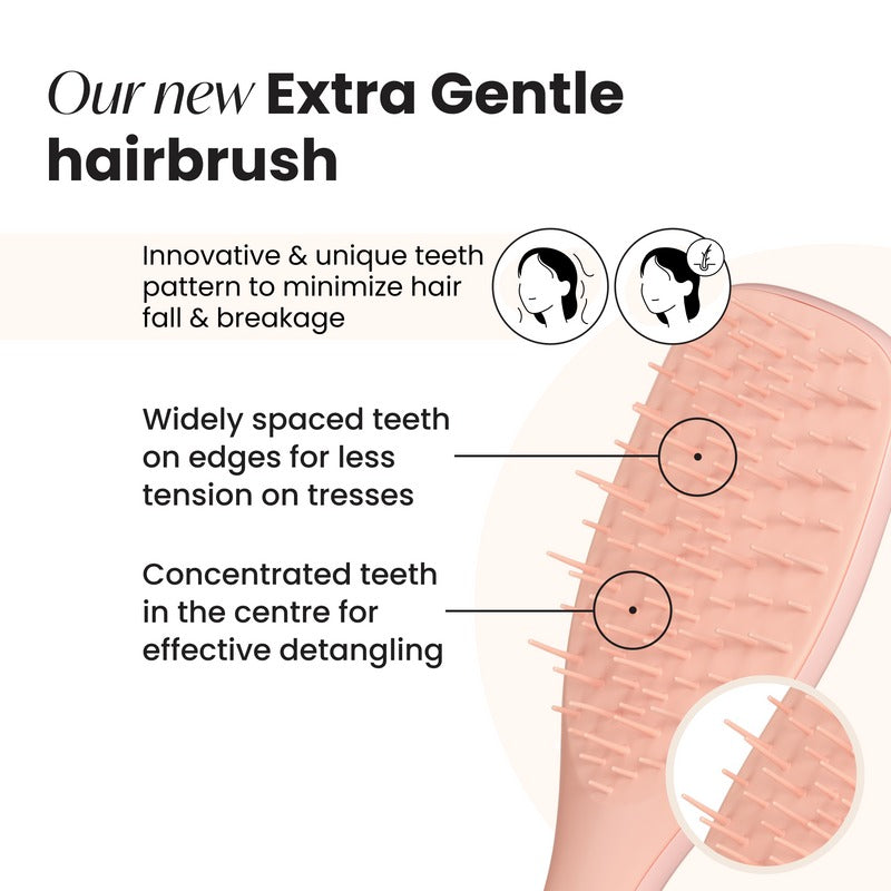 Have a lot of hair fall or locks prone to breakage, and worry about brushing your hair? The Ultimate Detangler Extra Gentle is the hairbrush for you.The innovative and unique wide-spaced teeth pattern is extra gentle on delicate hair, and it’s designed to minimize breakage and hair fall. There are fewer teeth at the edges of the brush to minimize tension on hair, and in the centre, the teeth are more concentrated giving effortless detangling that’s extra-gentle.