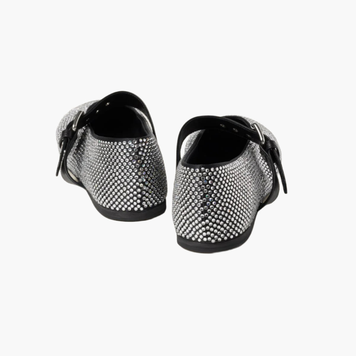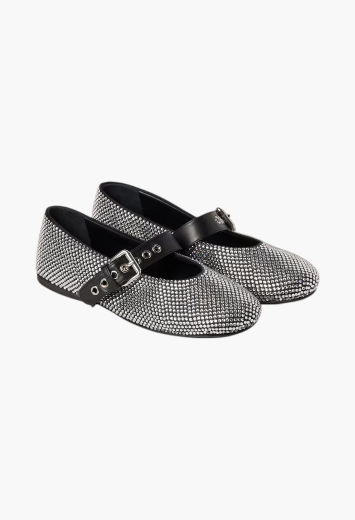 The classic style of ballerina flats meets the sparkle of artificial crystals to create a shoe with a refined appearance and subtle shimmer. The Miu Miu logo completes the design with an iconic note.