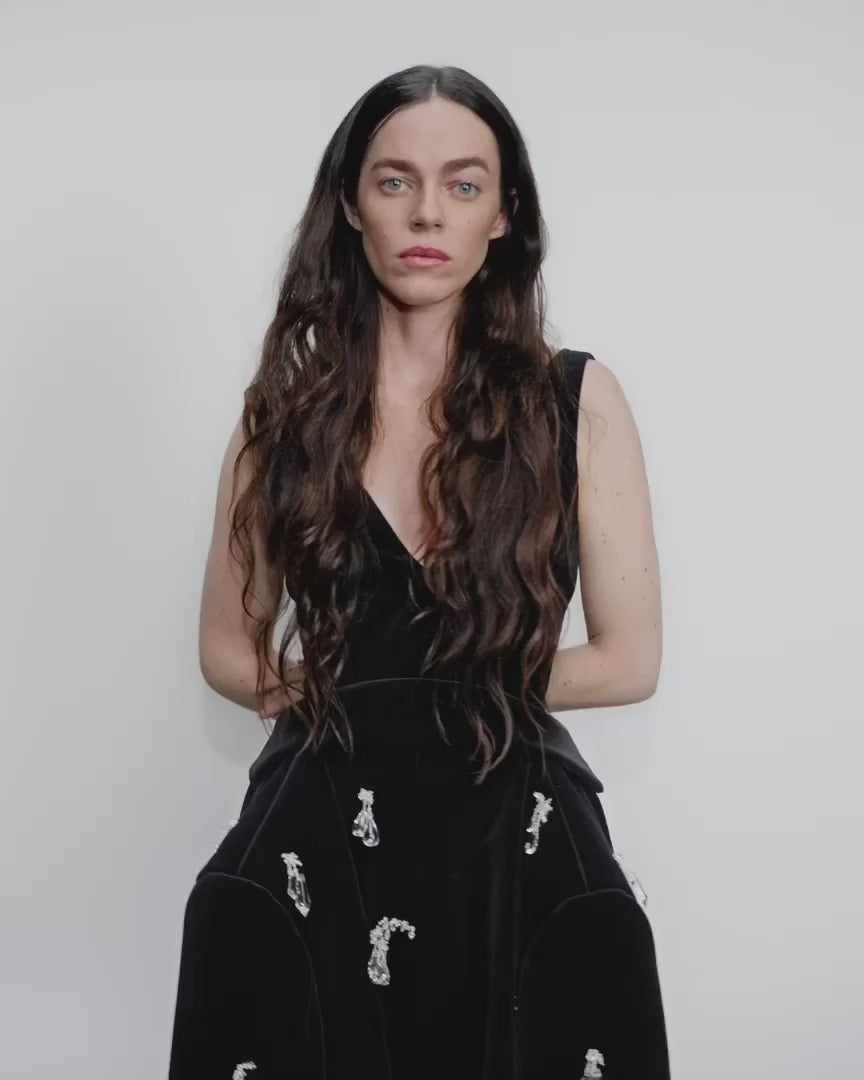 Structured dress in black velvet. Features a fully lined construction, sculpted from a traditional tailored jacket. Finished with chandelier crystal detailing and horn buttons.
