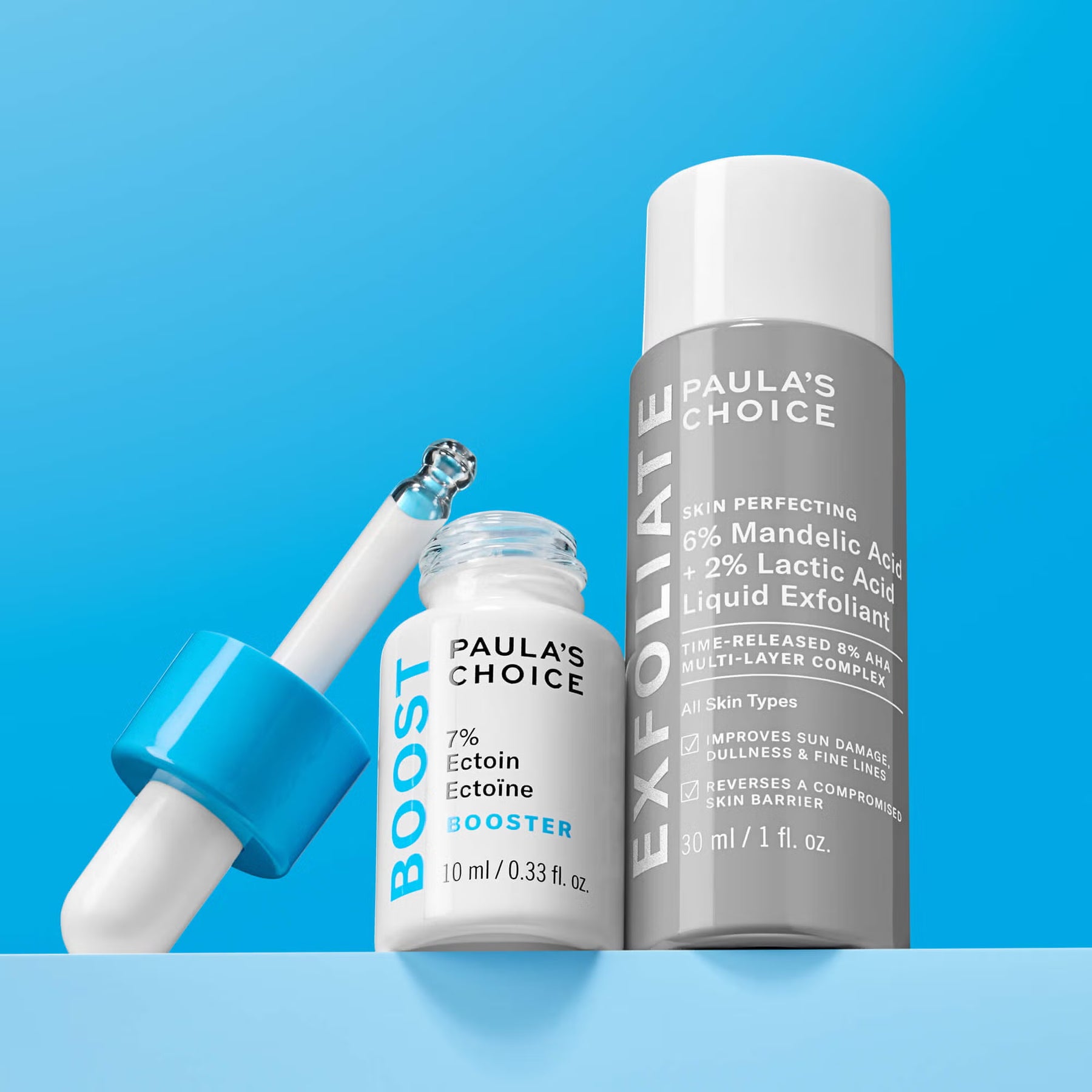 The nourishing 7% Ectoin + Hyaluronic Acid Milky Hydrating Serum attracts and locks in moisture, supporting your skin's barrier for a dewy, soft, and bouncy complexion. Complementing this is the 6% Mandelic and 2% Lactic Acid AHA Liquid Exfoliant, a gentle yet effective formula that sheds dull buildup, refines skin texture, minimizes fine lines, and promotes a more even, radiant glow, suitable for all skin types. Together, these products work to restore, hydrate, and reveal healthier, smoother, and more luminous skin with each use.