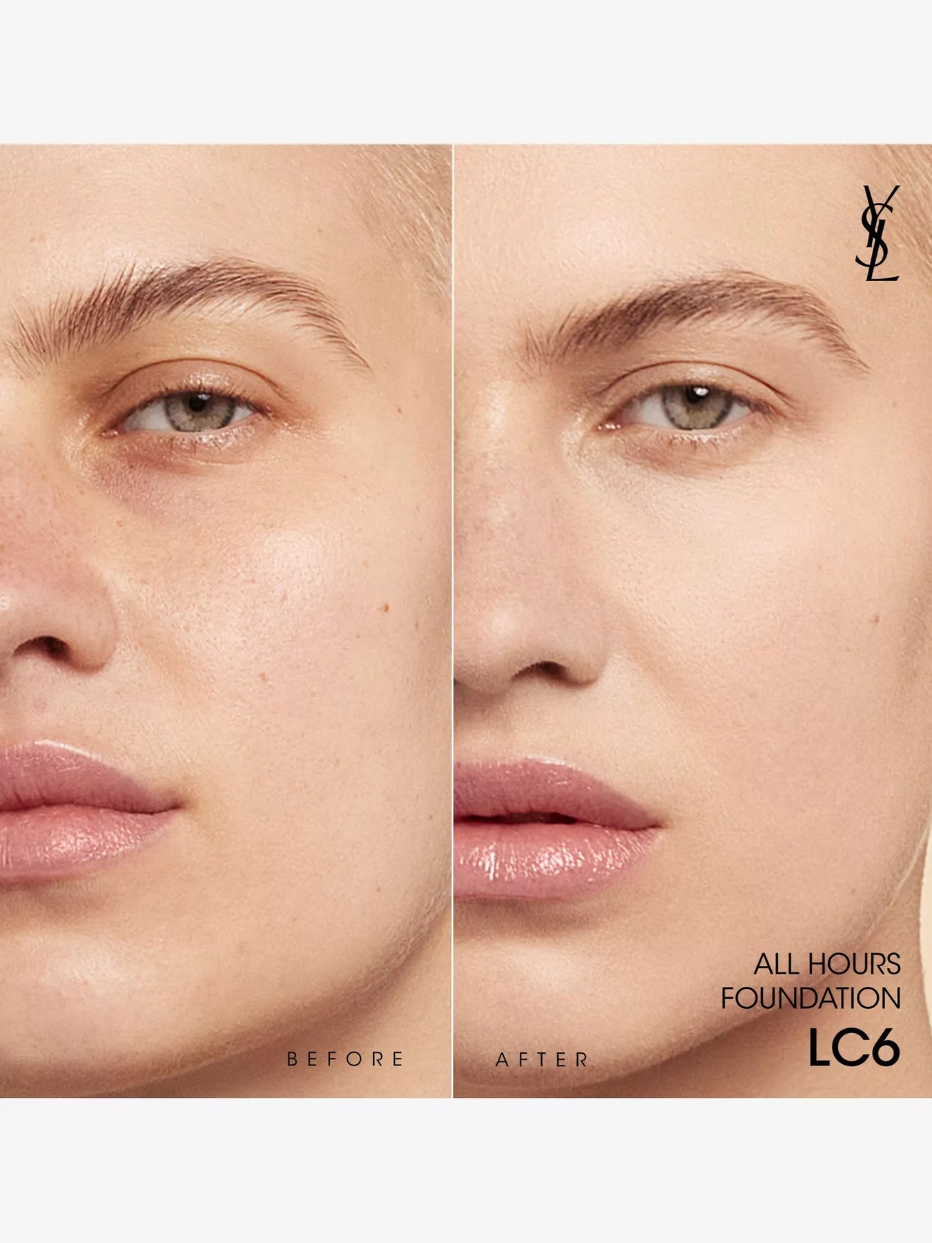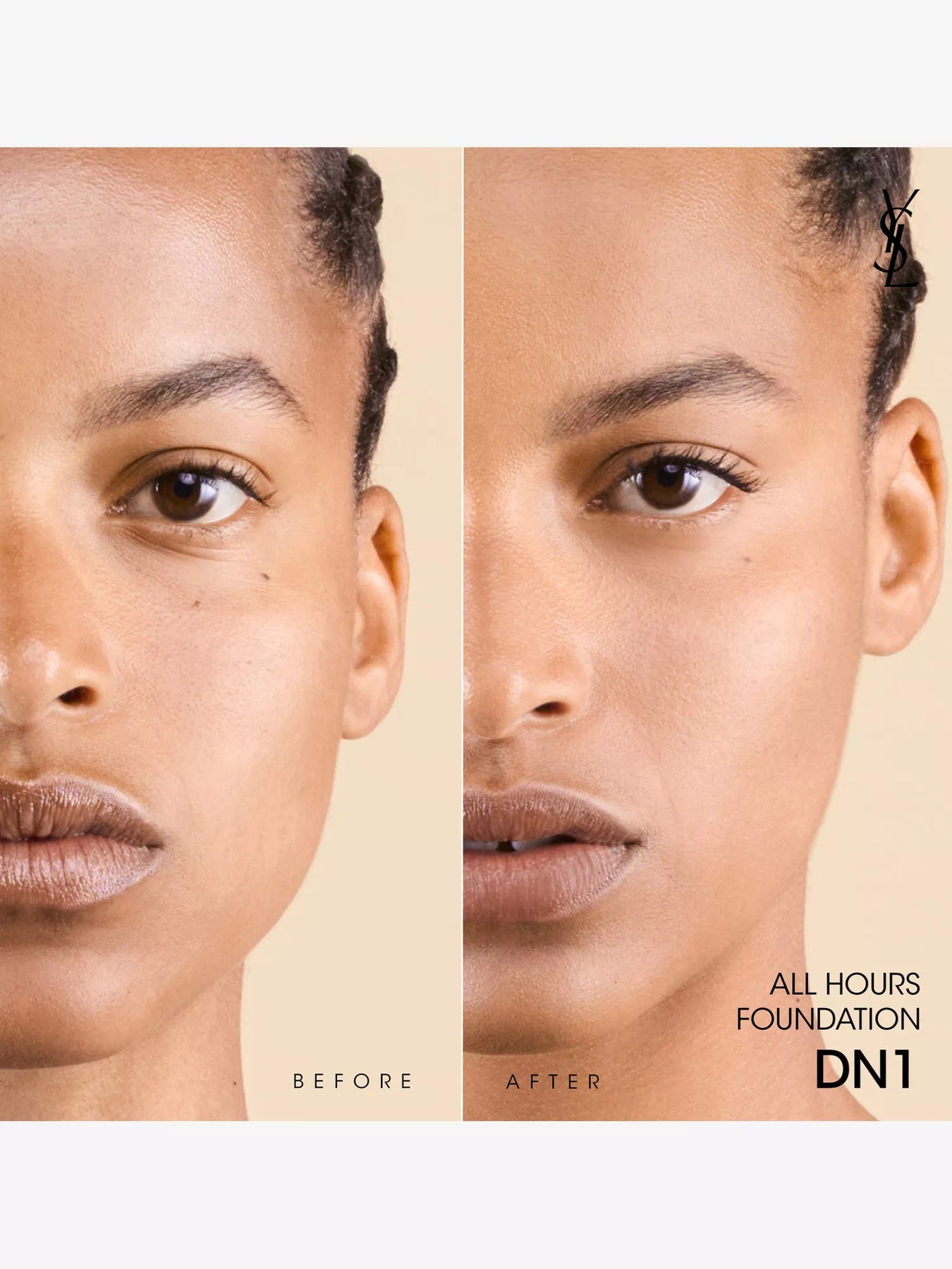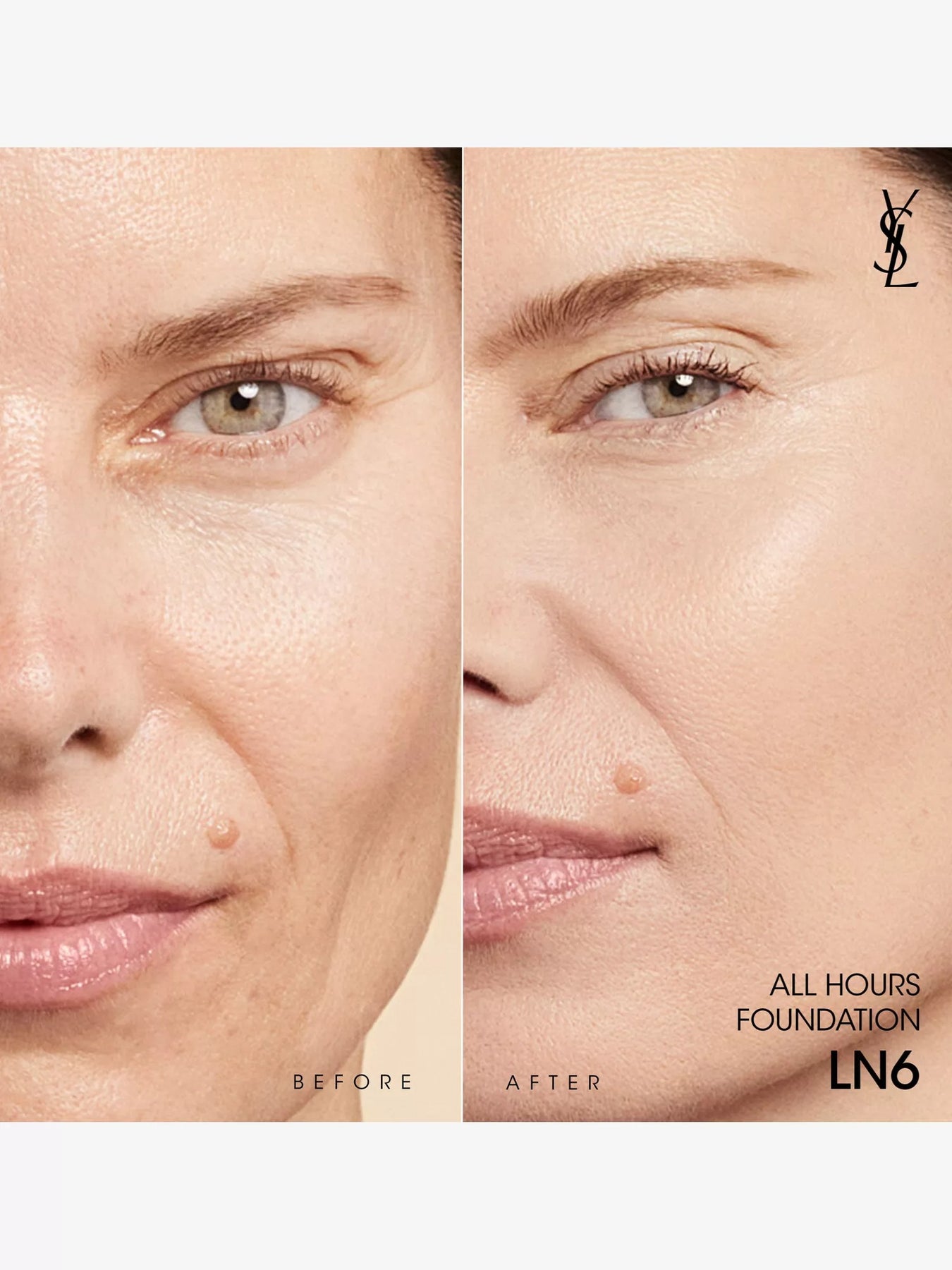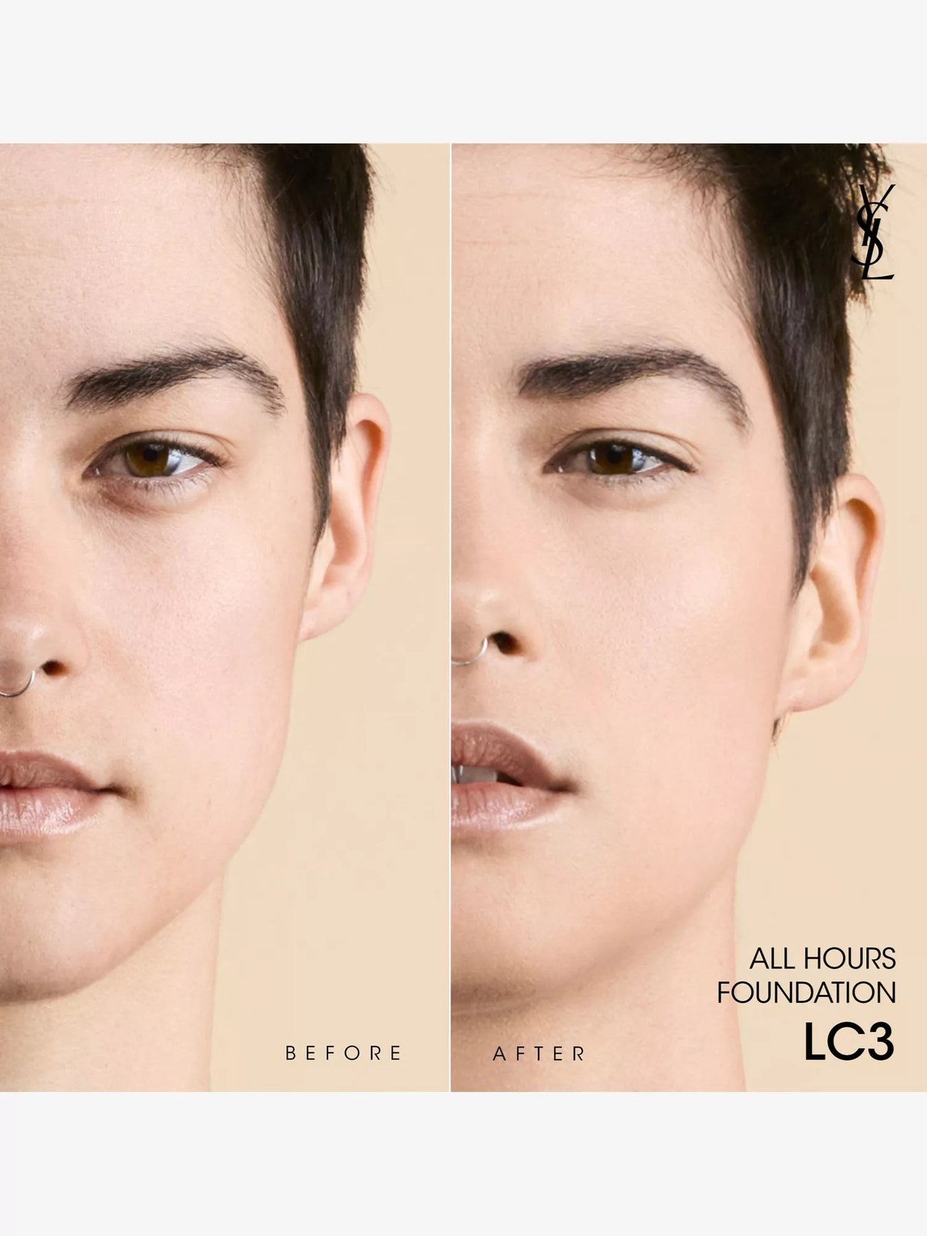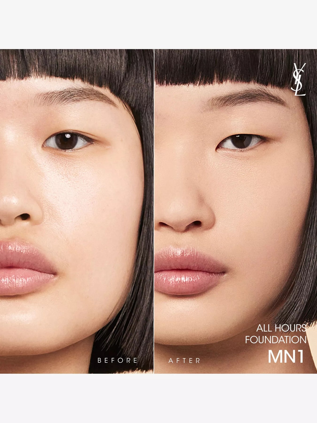 Application: Glide All Hours foundation from the centre of the face outwards to unify the complexion. Using a dabbing gesture, build up coverage where needed.