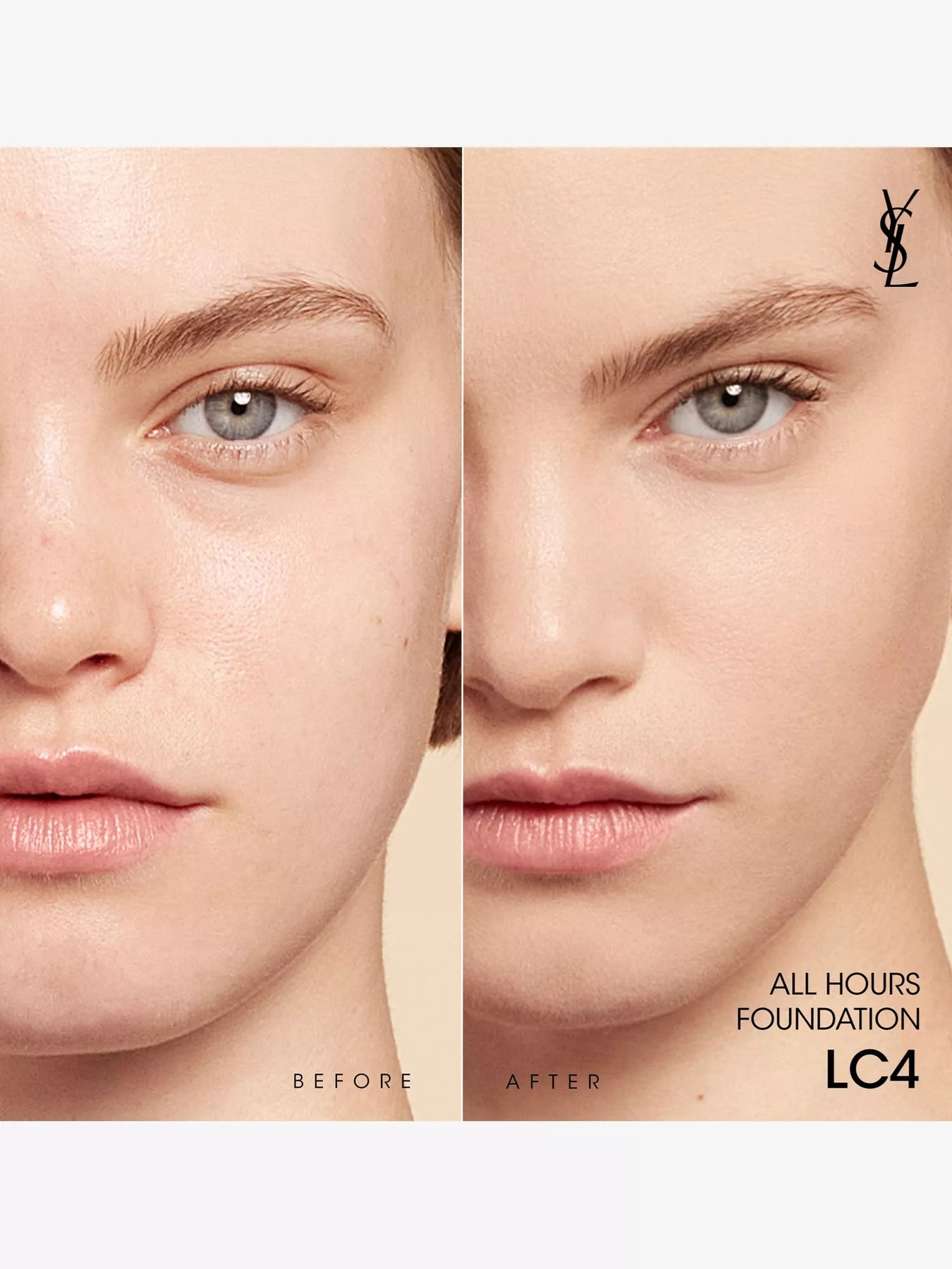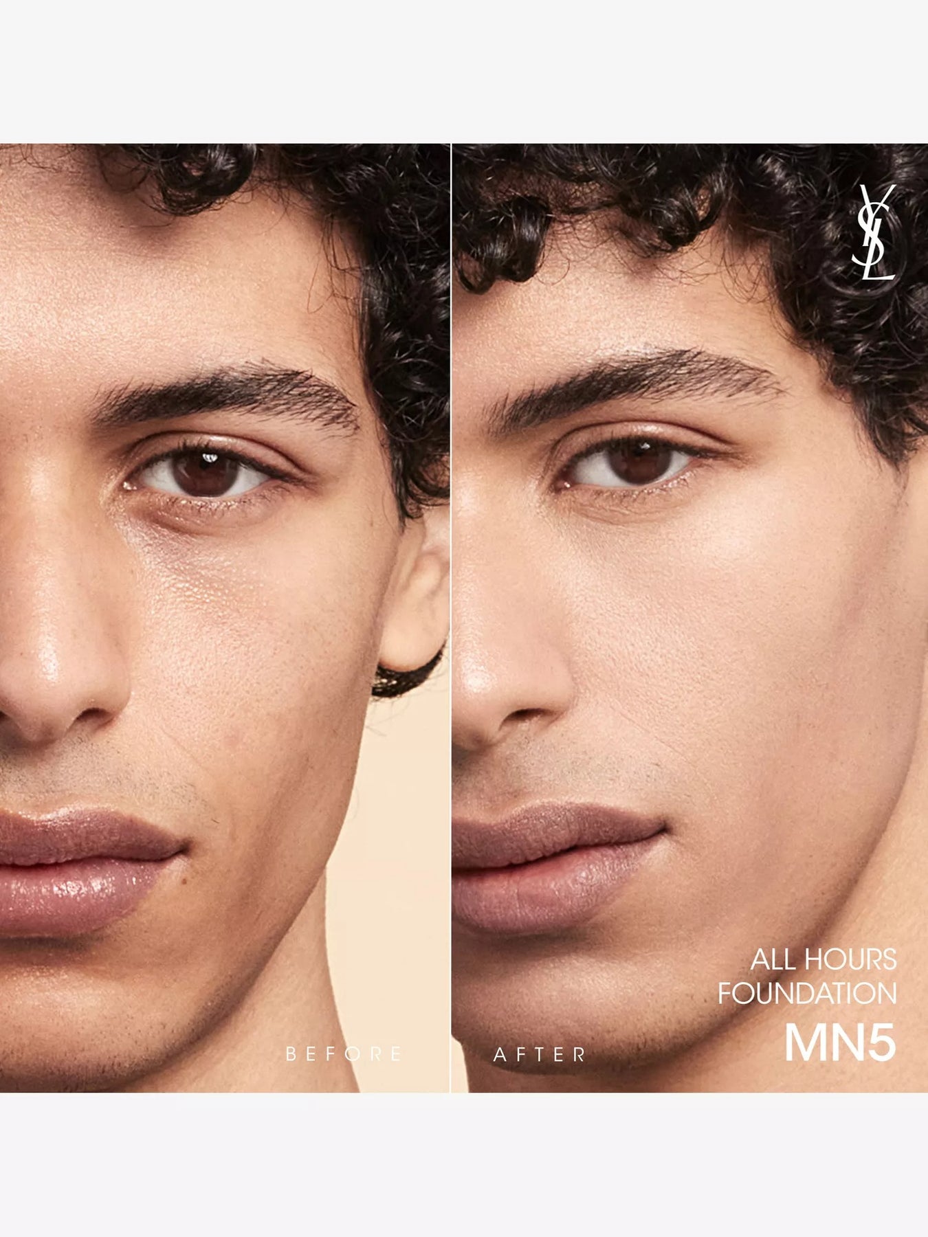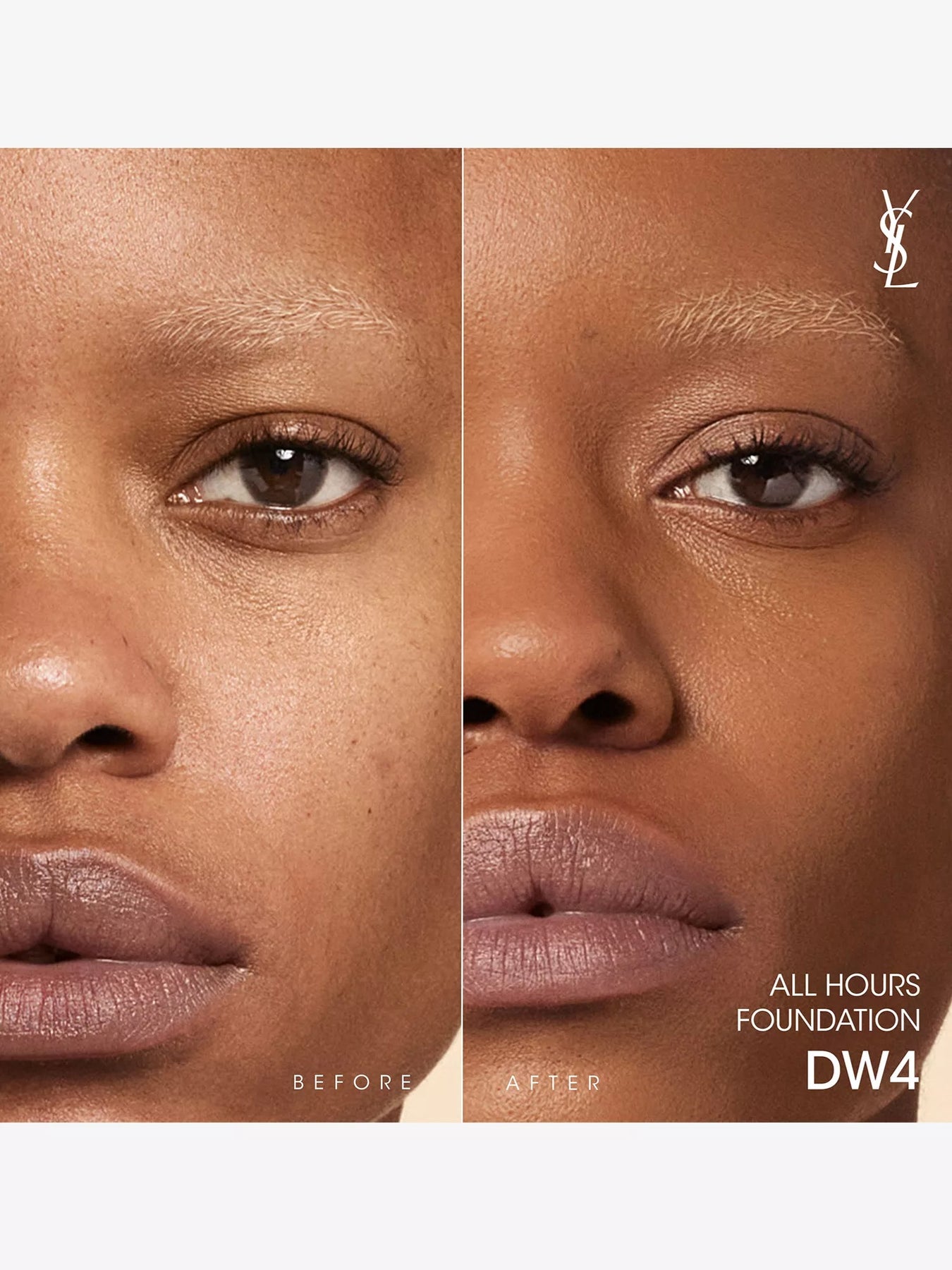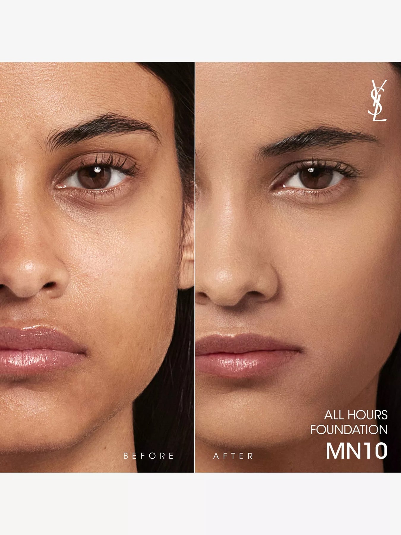 Application: Glide All Hours foundation from the centre of the face outwards to unify the complexion. Using a dabbing gesture, build up coverage where needed.