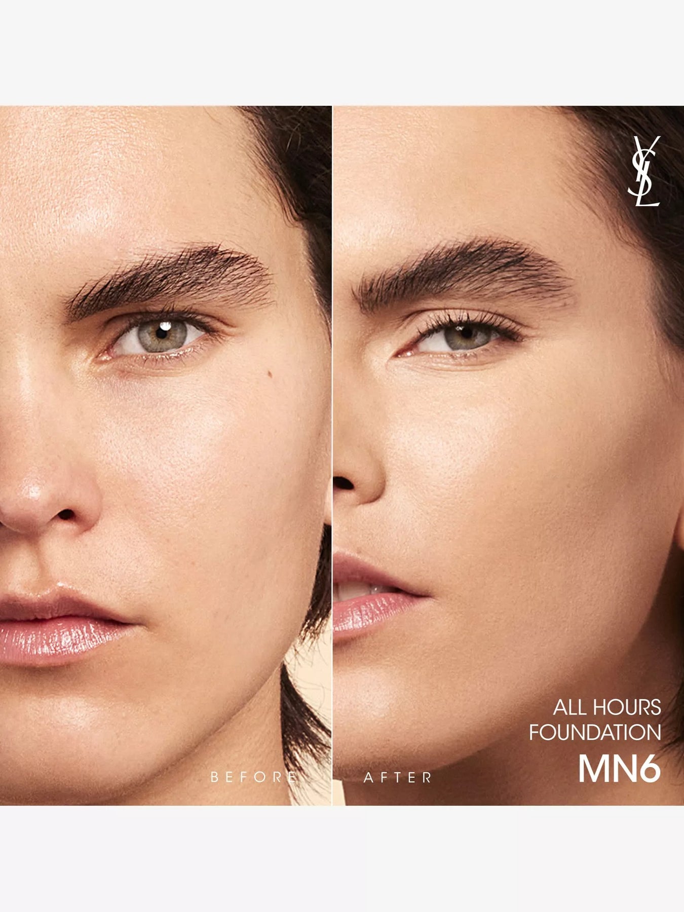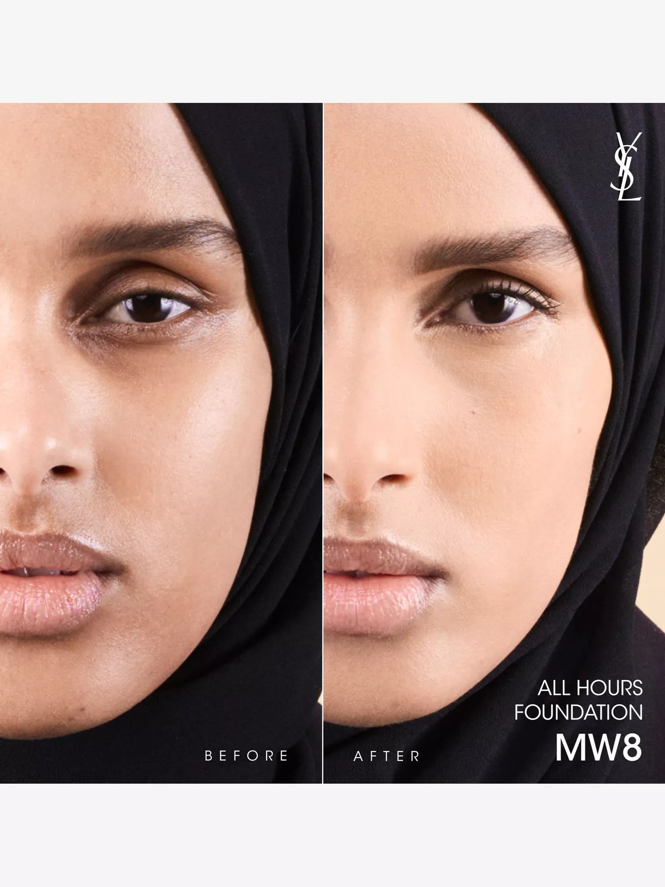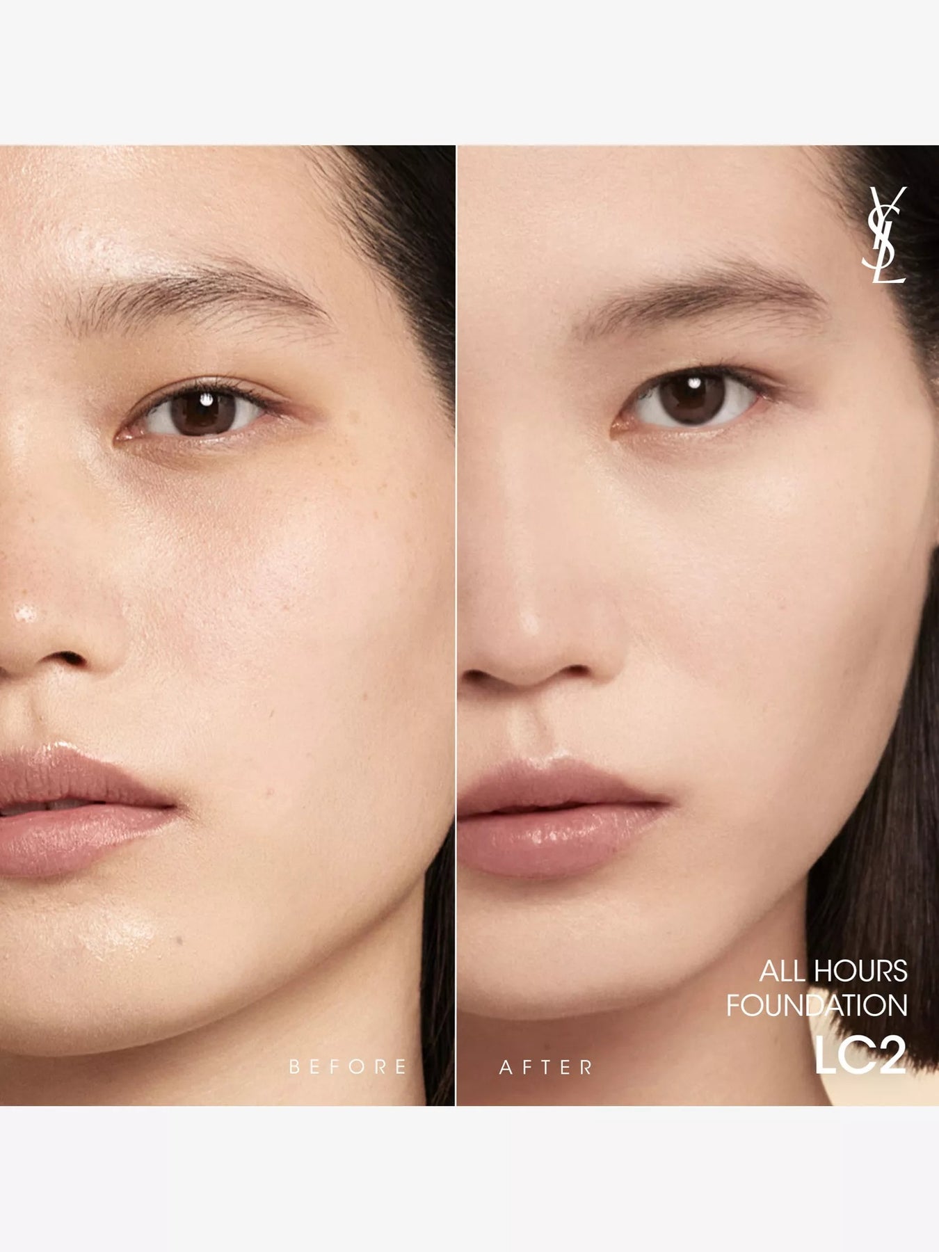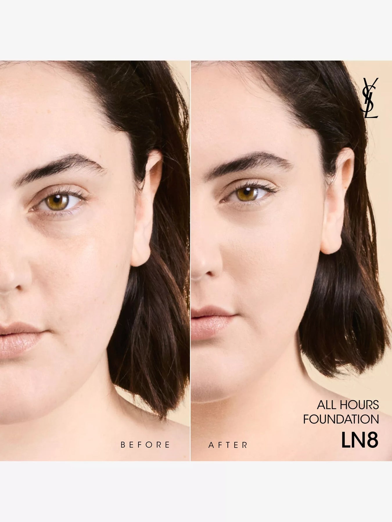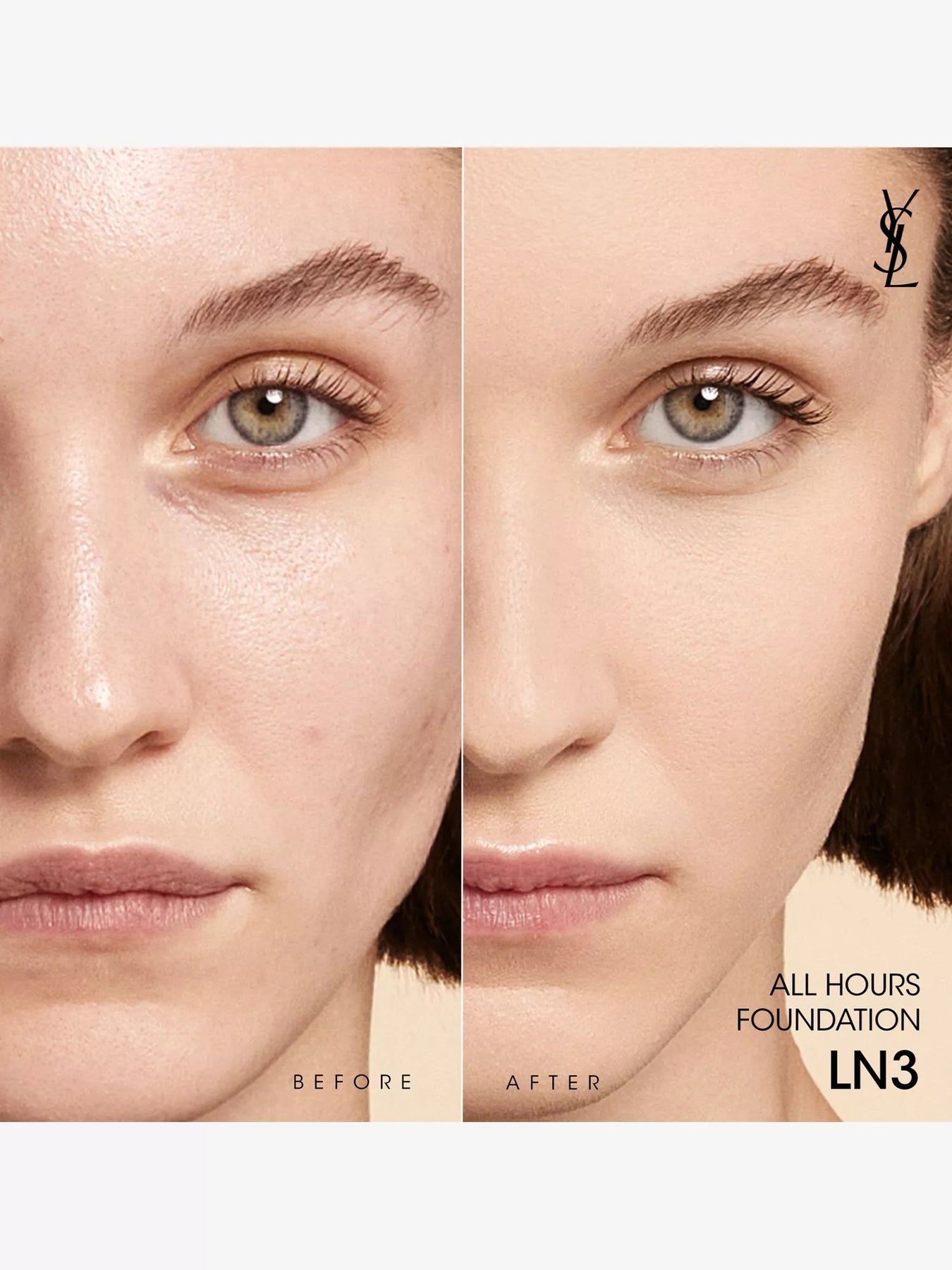 Application: Glide All Hours foundation from the centre of the face outwards to unify the complexion. Using a dabbing gesture, build up coverage where needed.