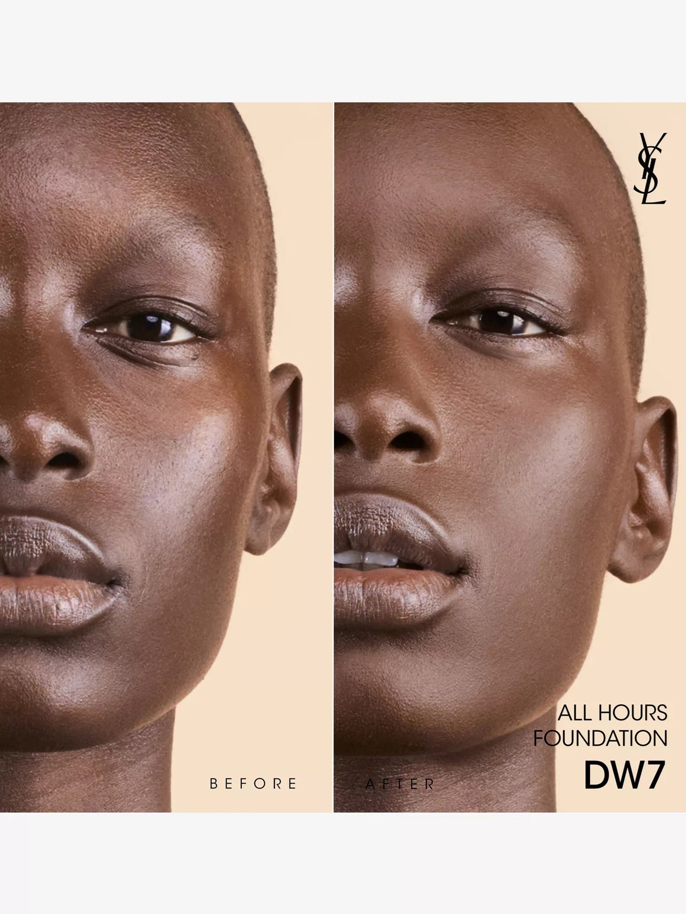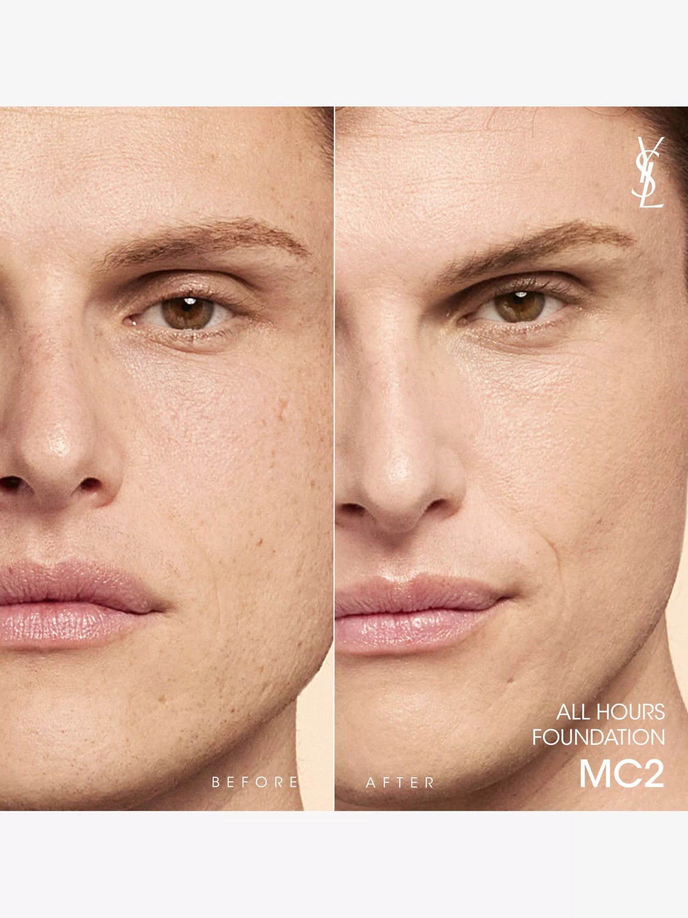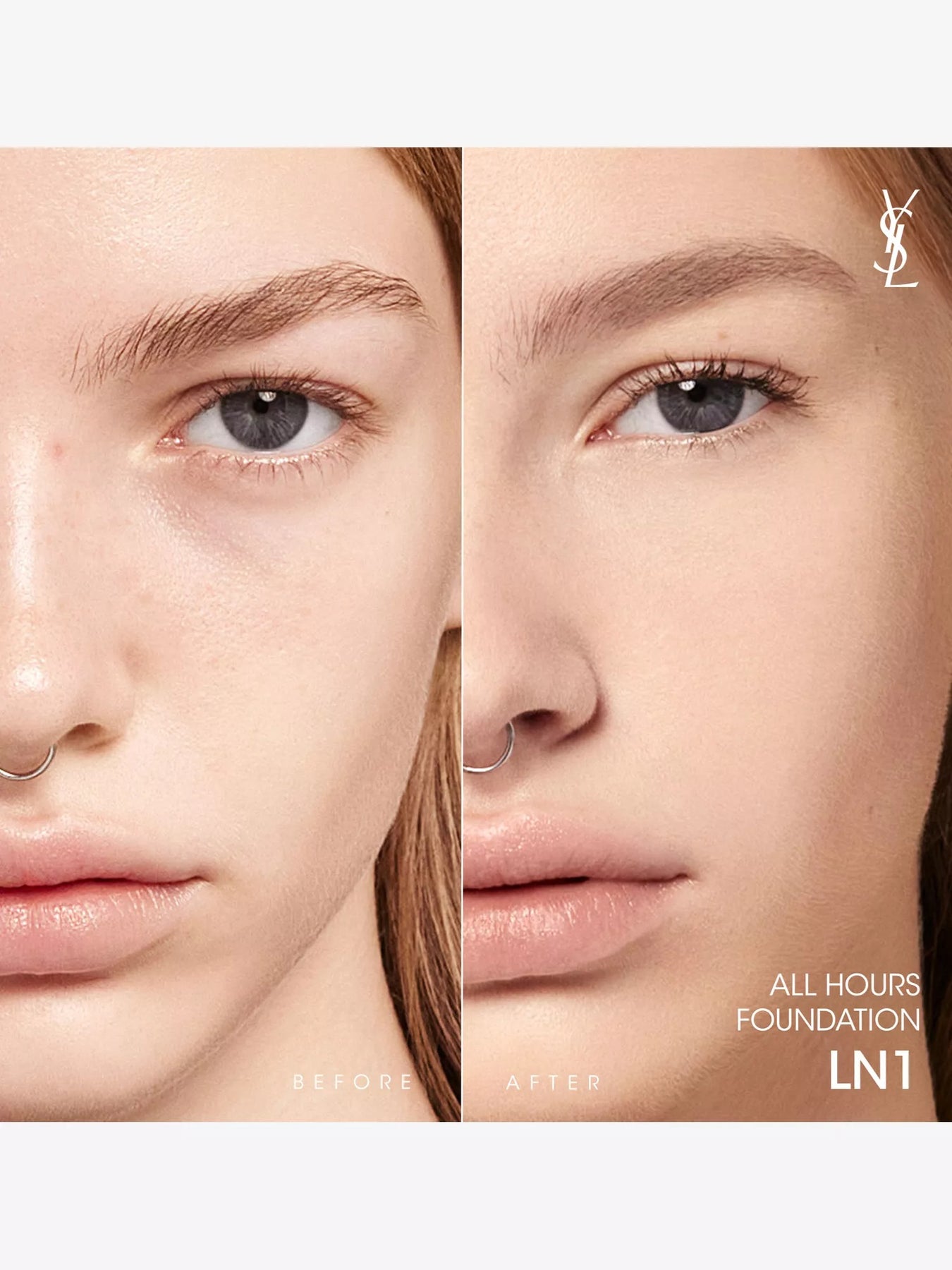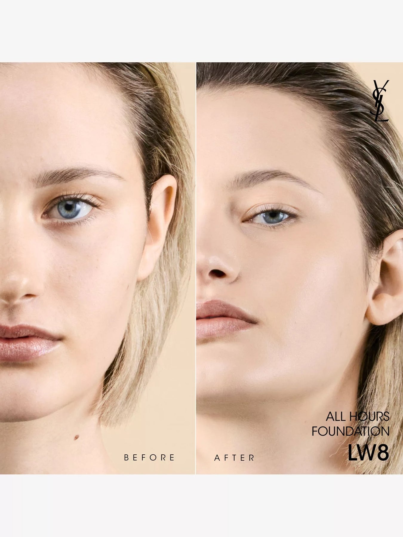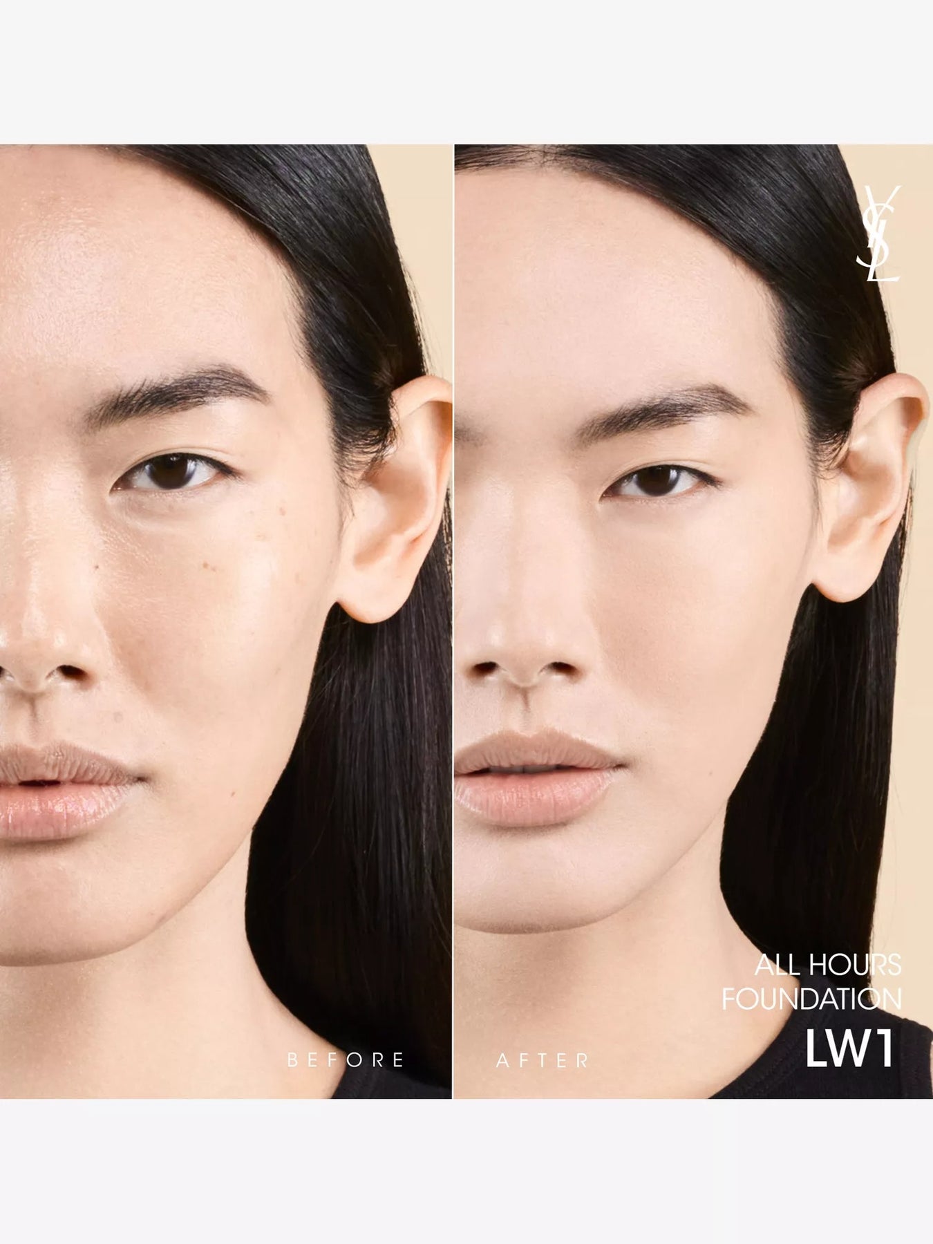 Application: Glide All Hours foundation from the centre of the face outwards to unify the complexion. Using a dabbing gesture, build up coverage where needed.