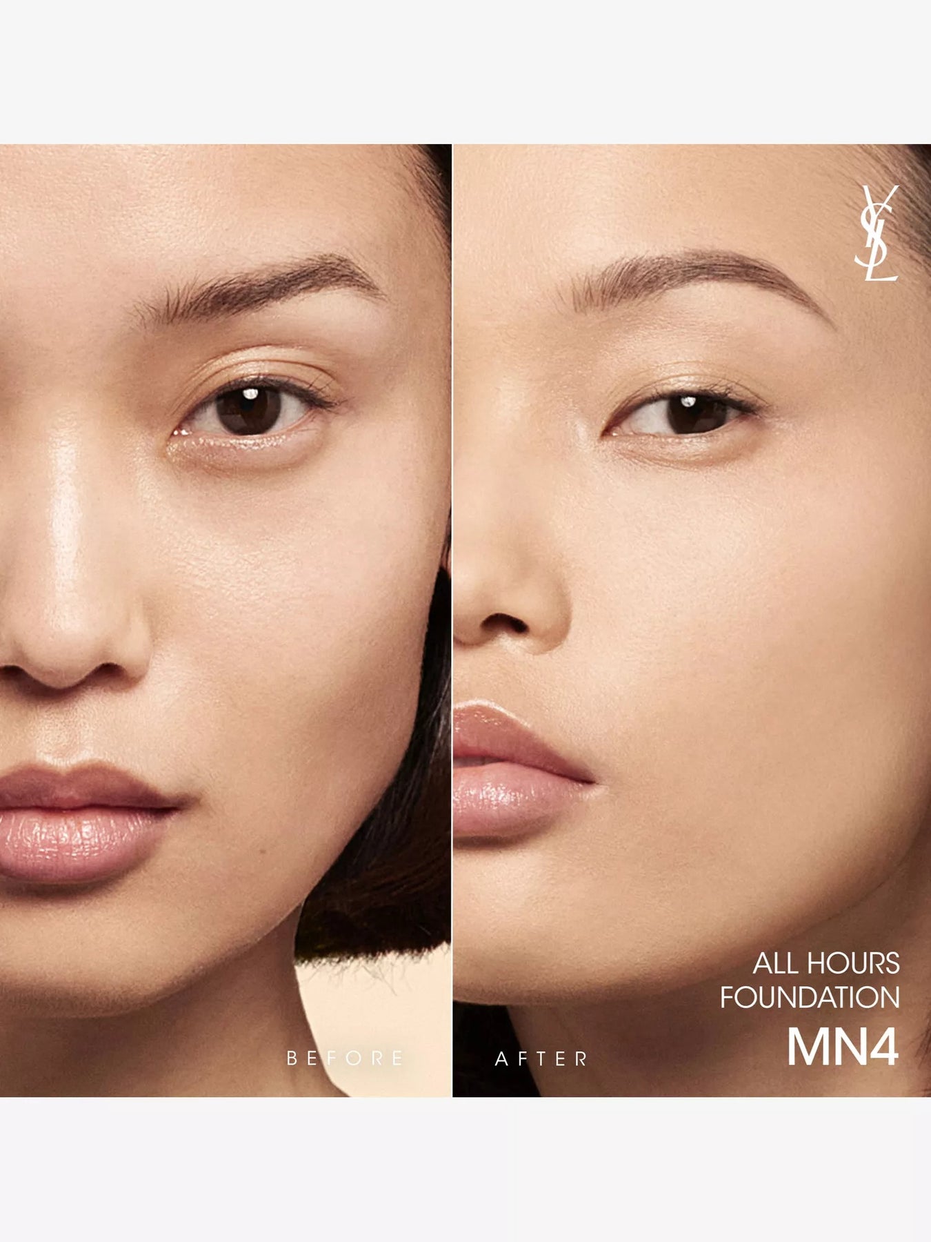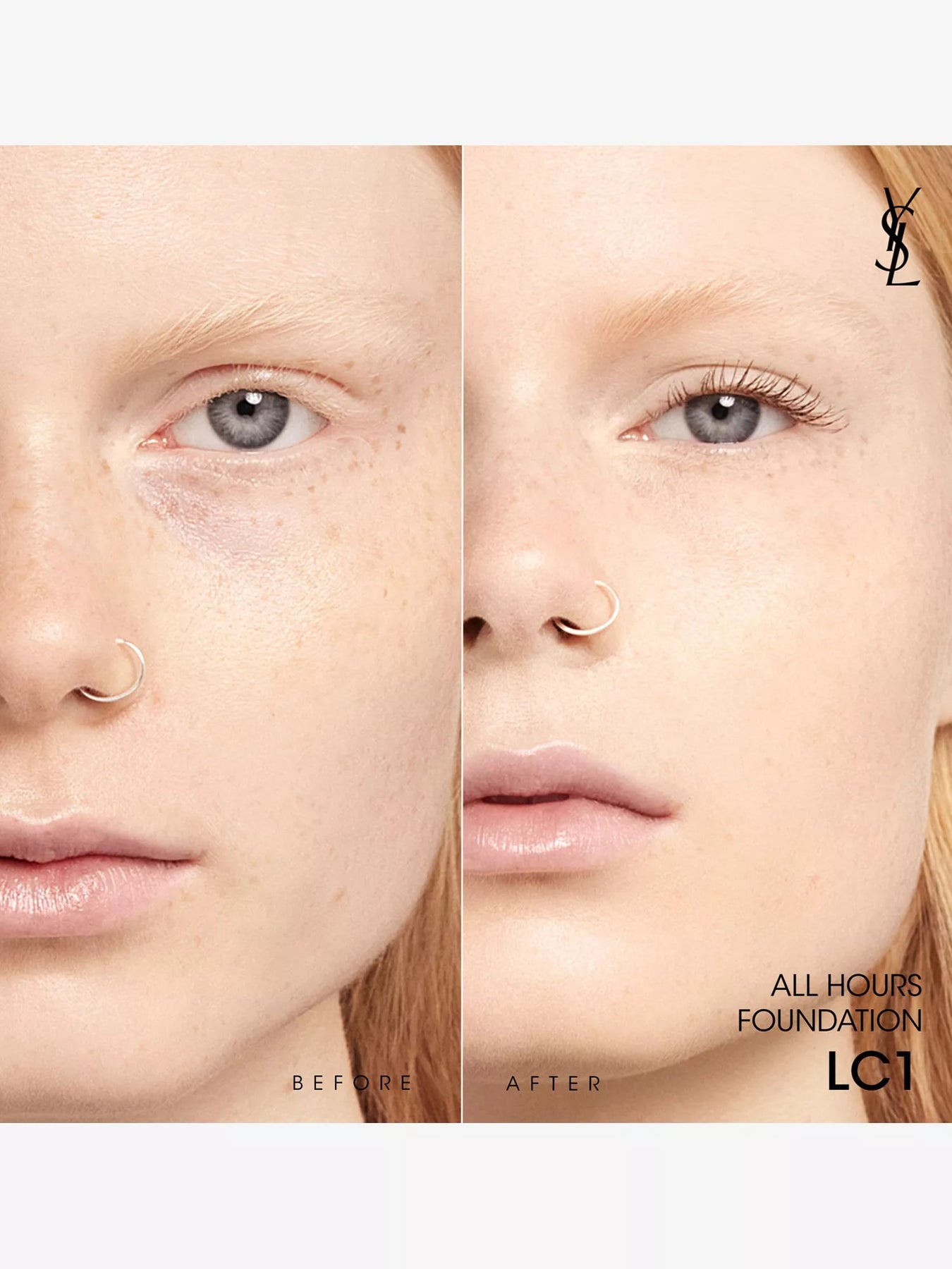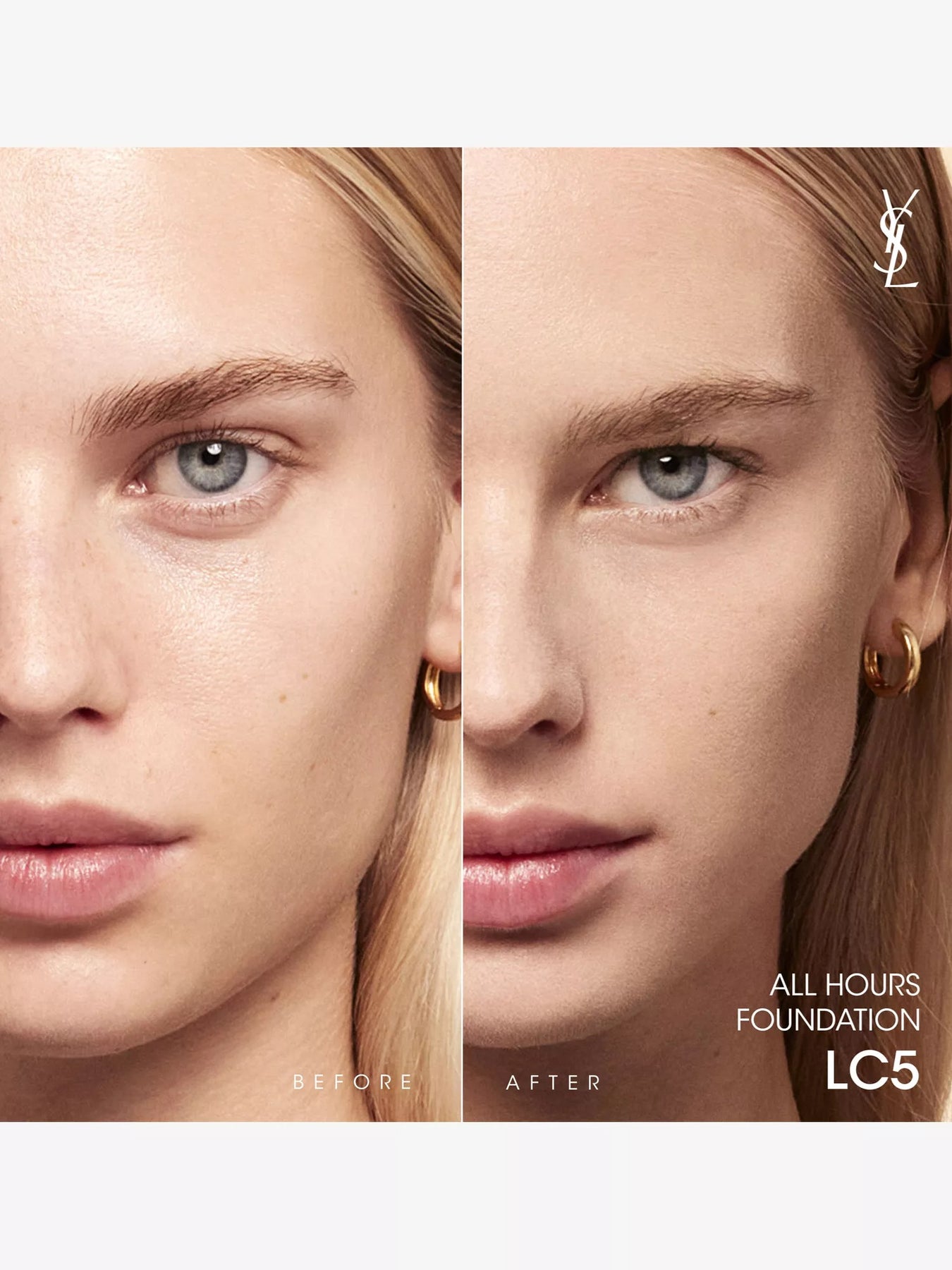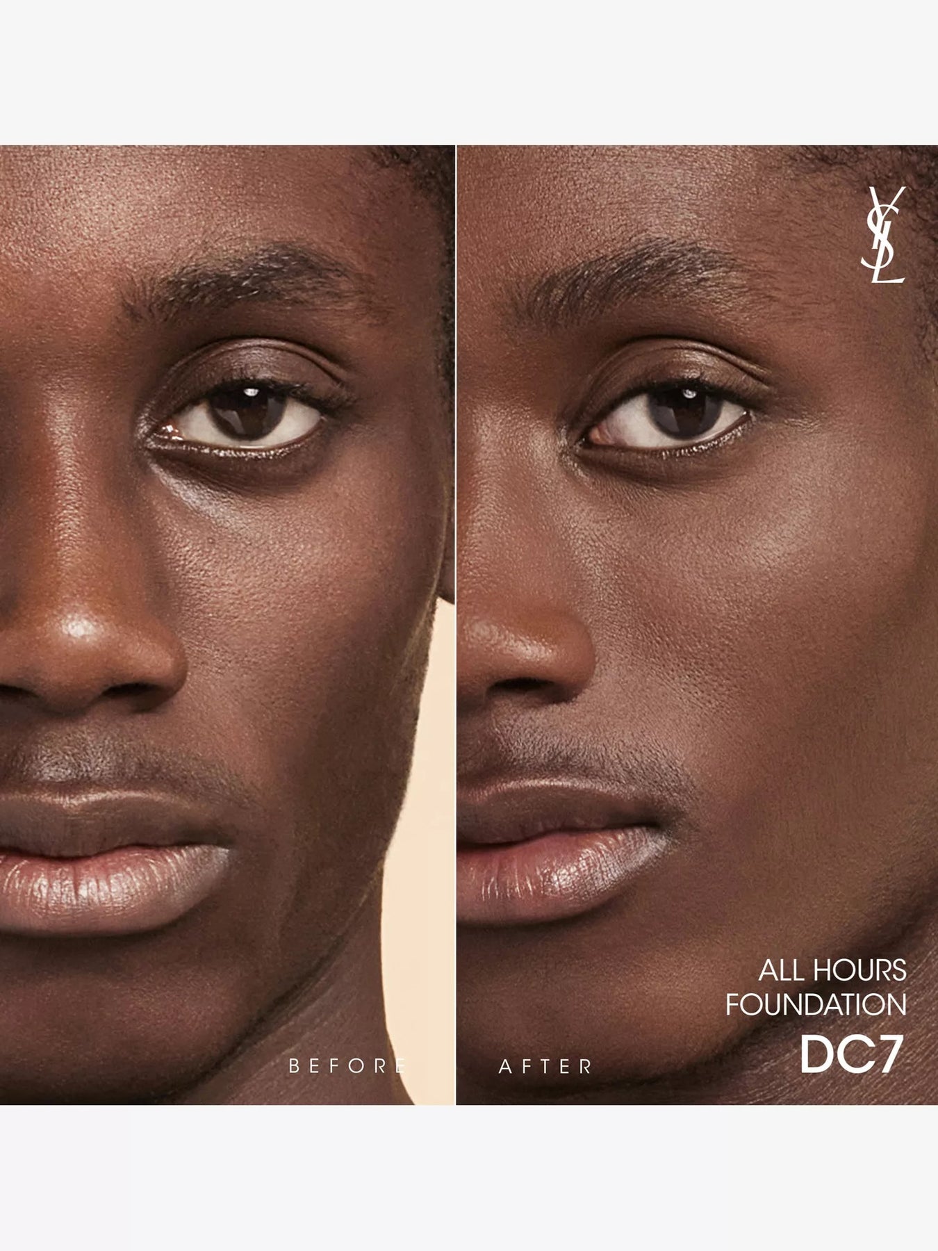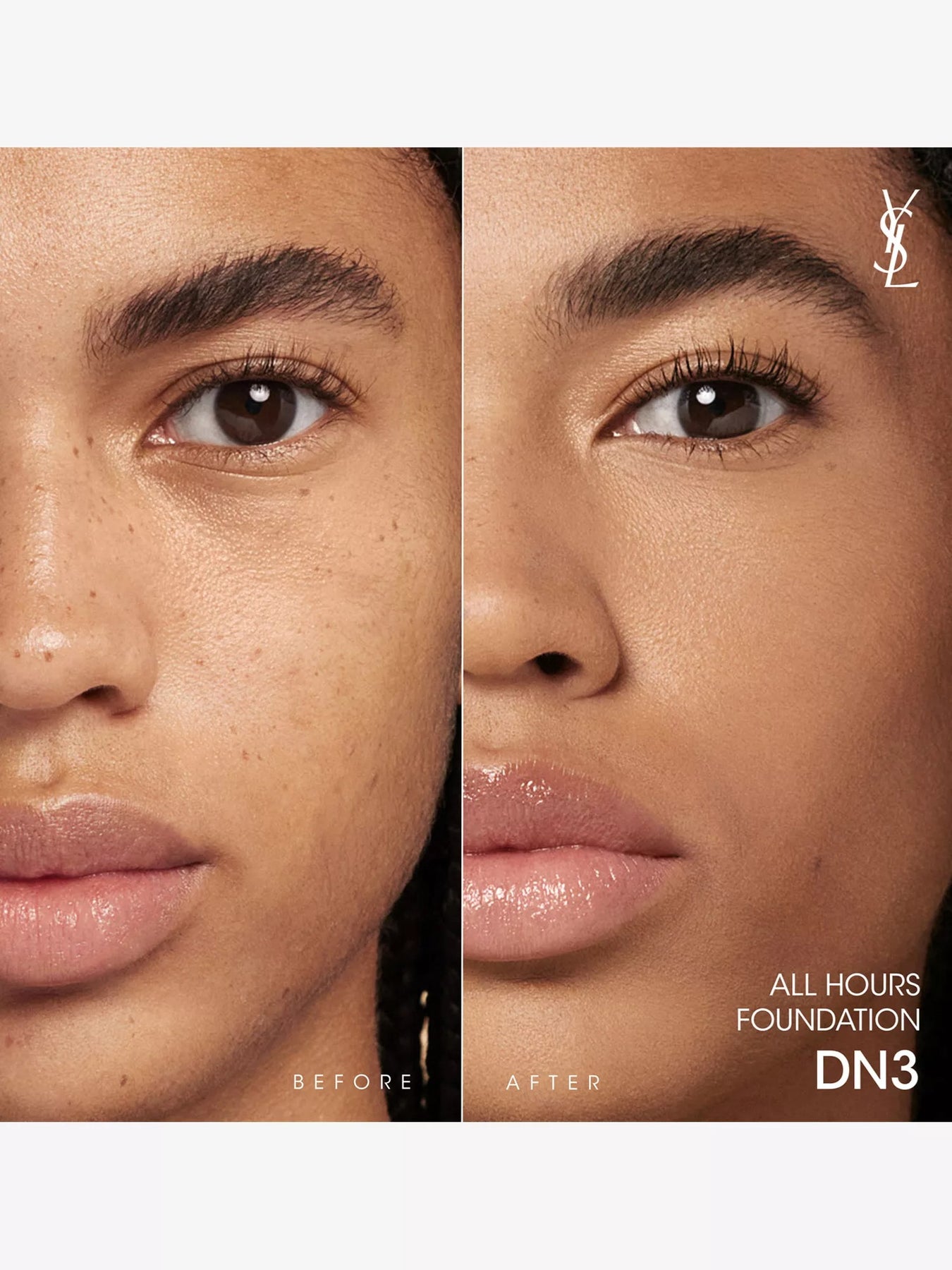 Application: Glide All Hours foundation from the centre of the face outwards to unify the complexion. Using a dabbing gesture, build up coverage where needed.