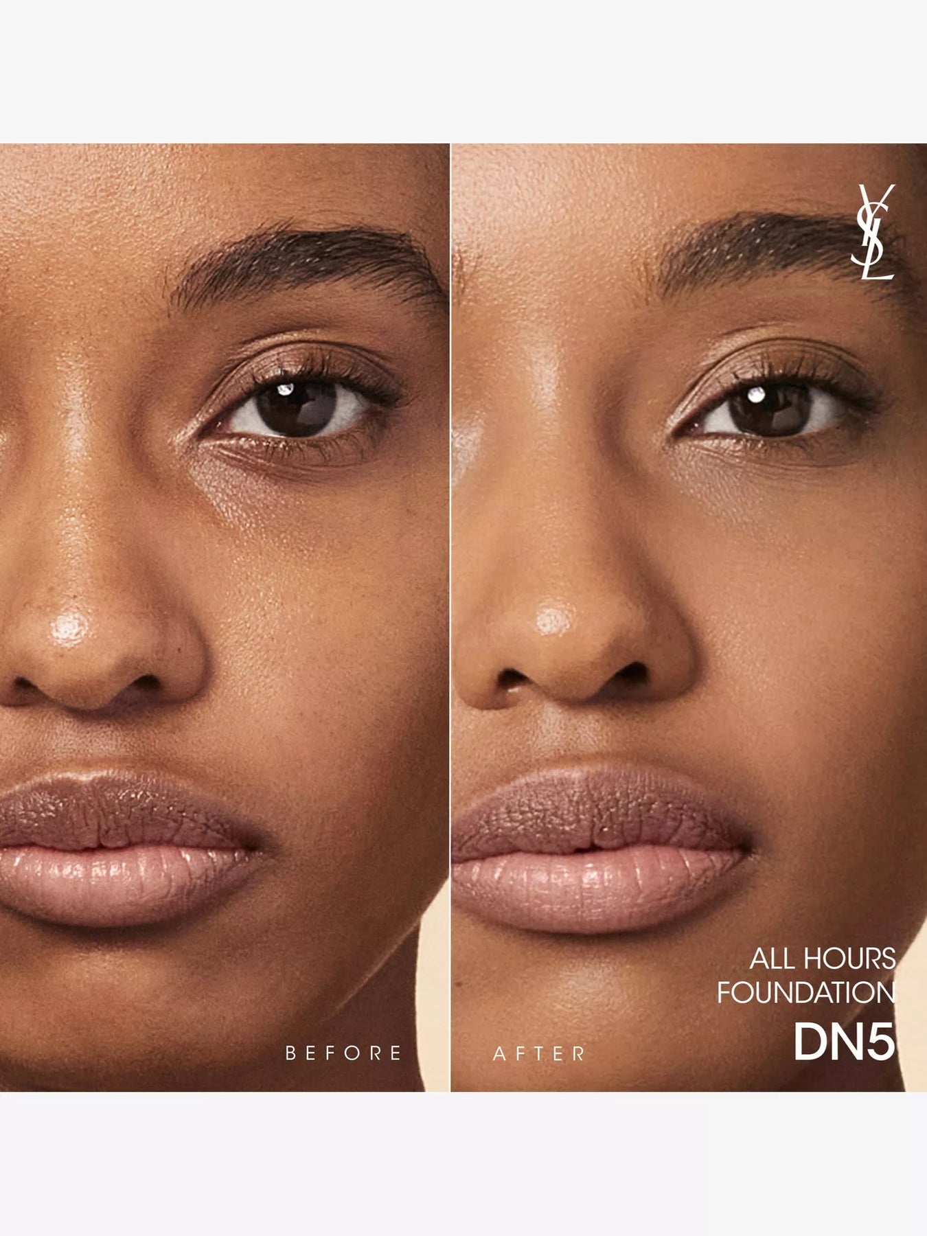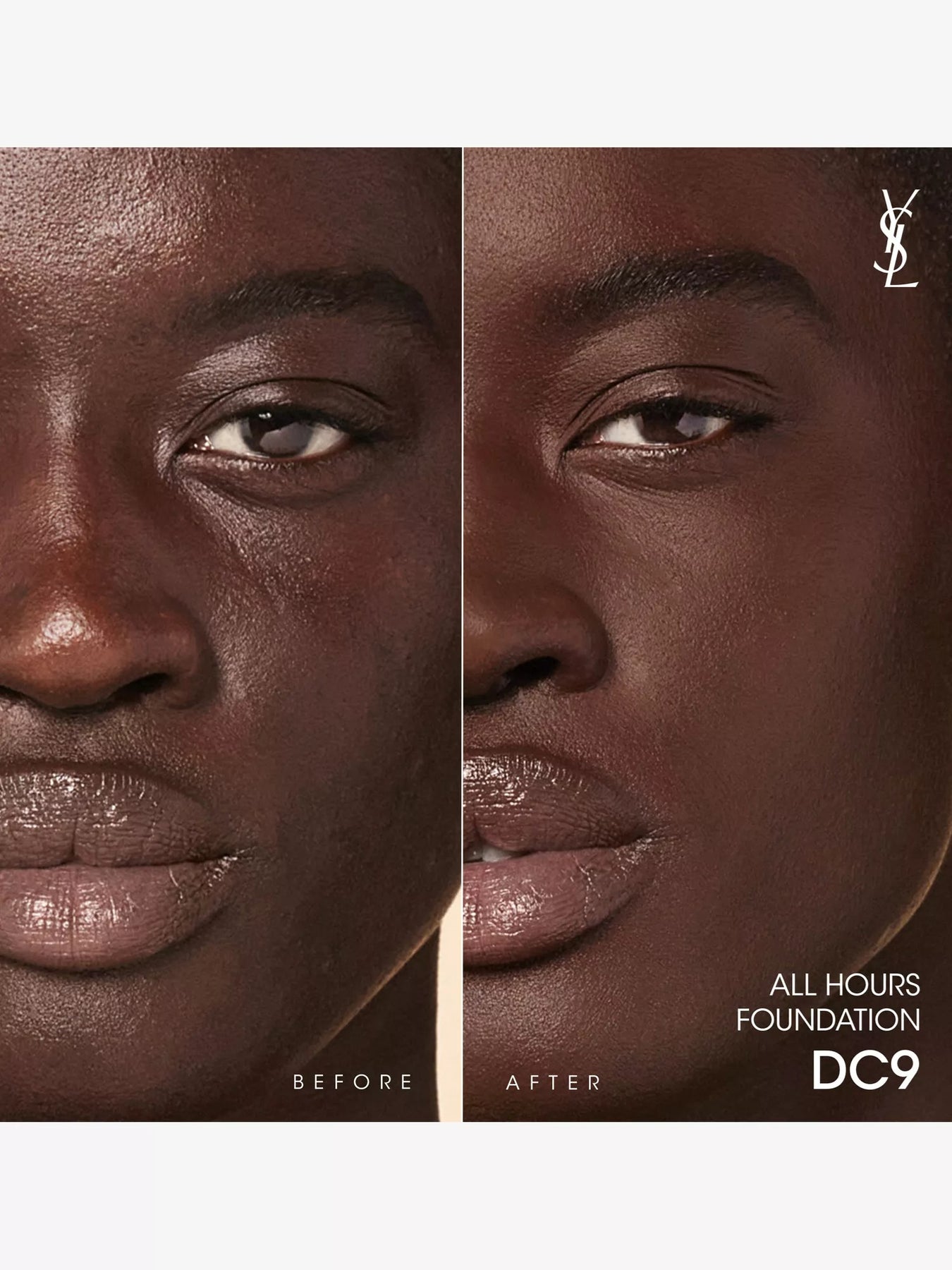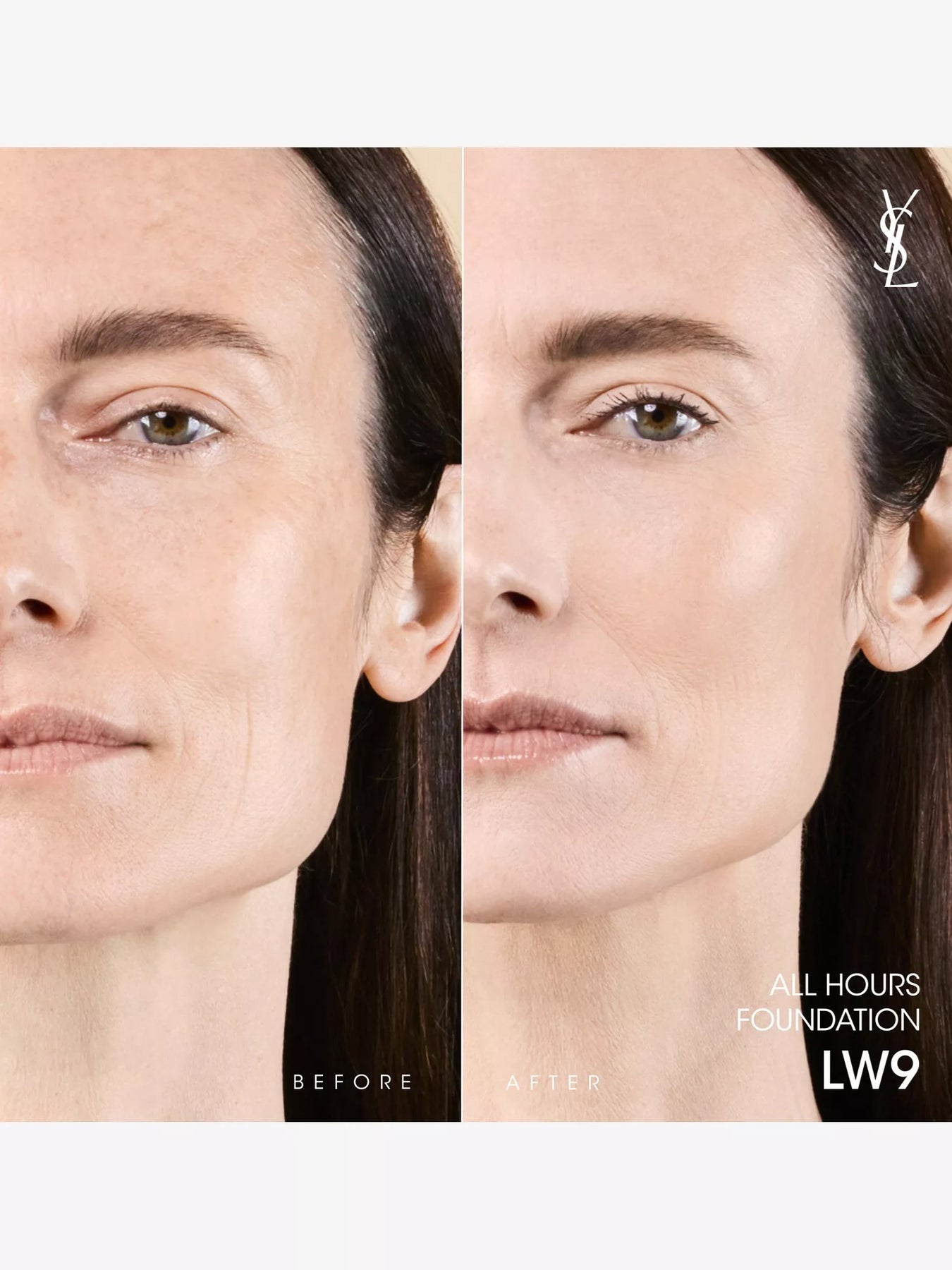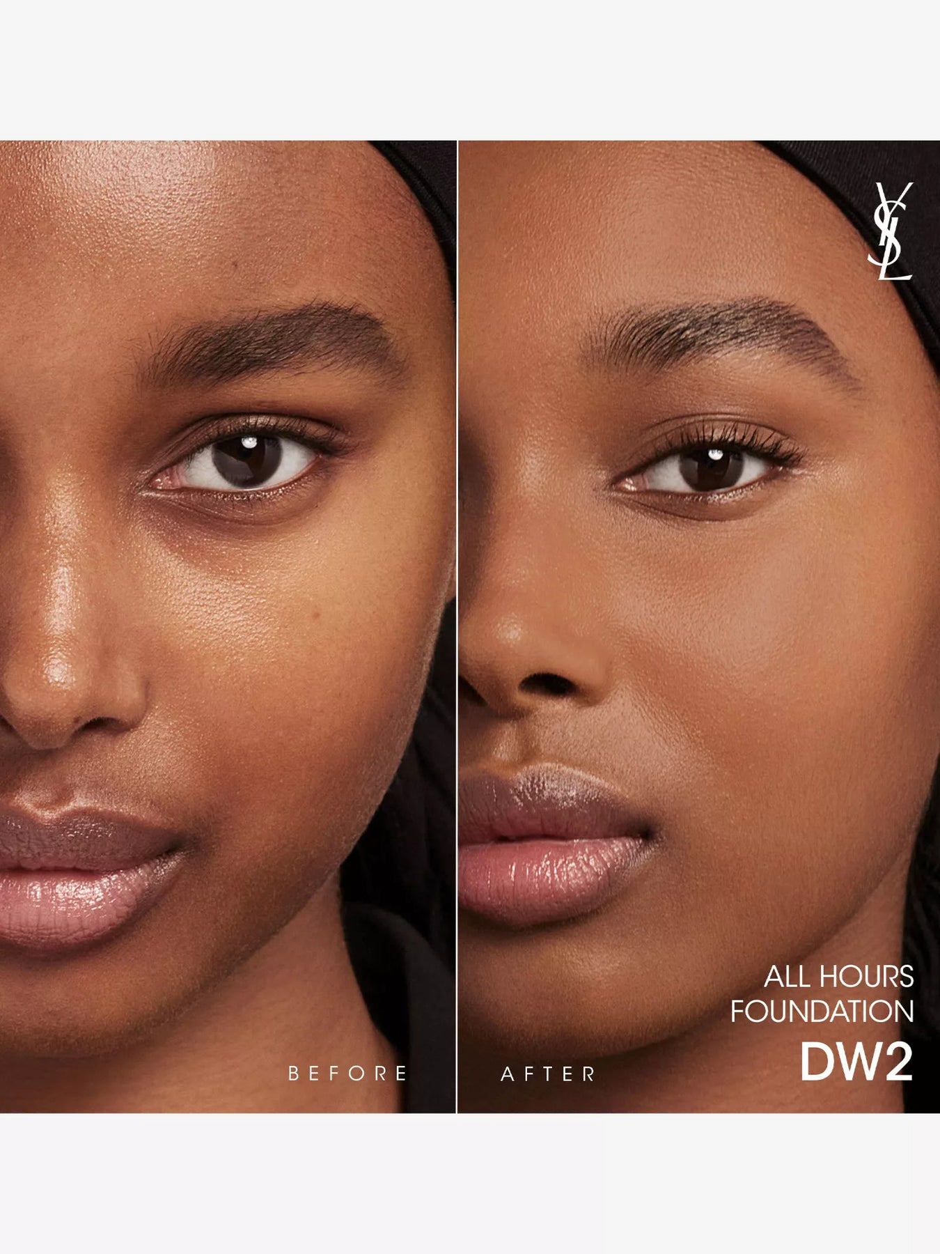 Application: Glide All Hours foundation from the centre of the face outwards to unify the complexion. Using a dabbing gesture, build up coverage where needed.