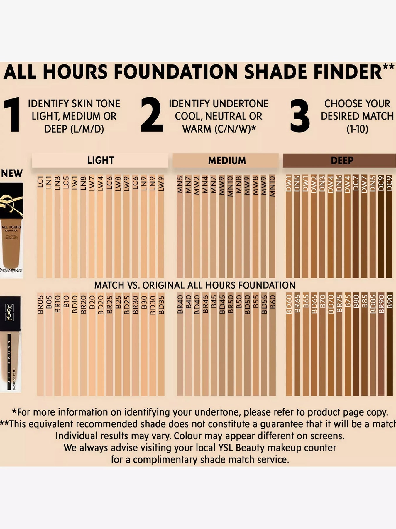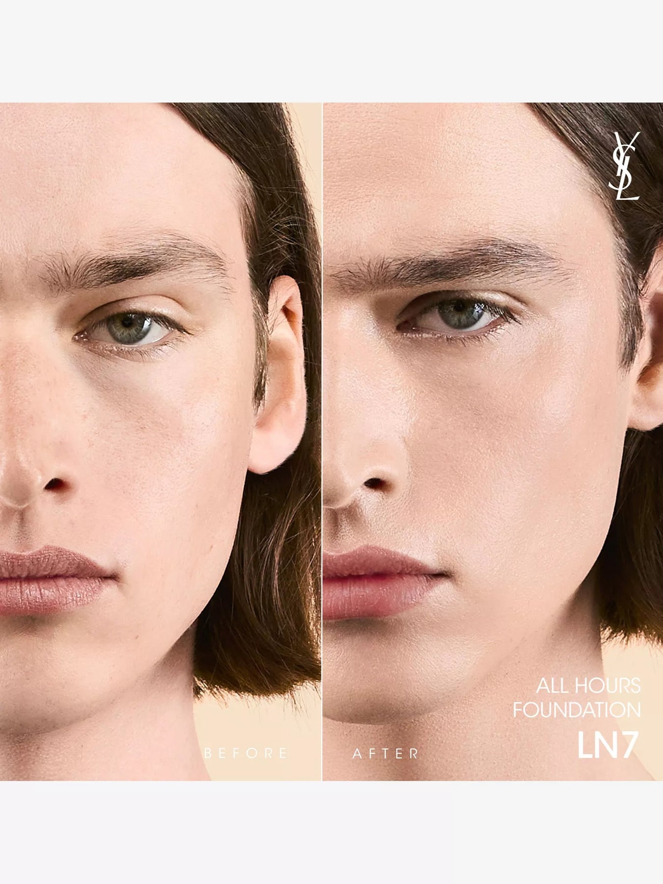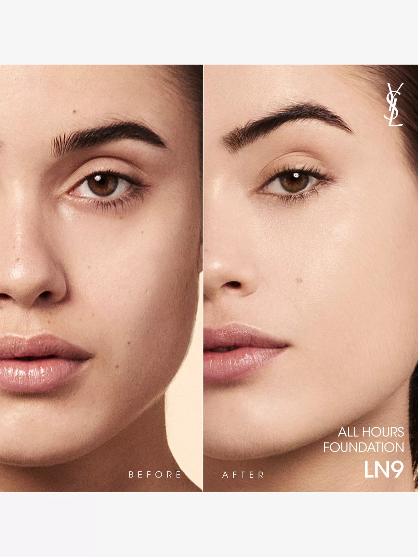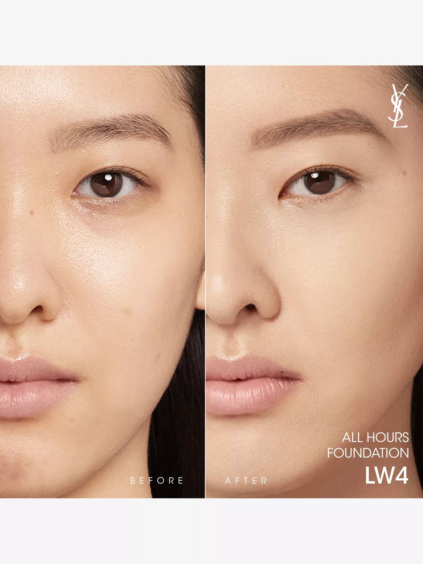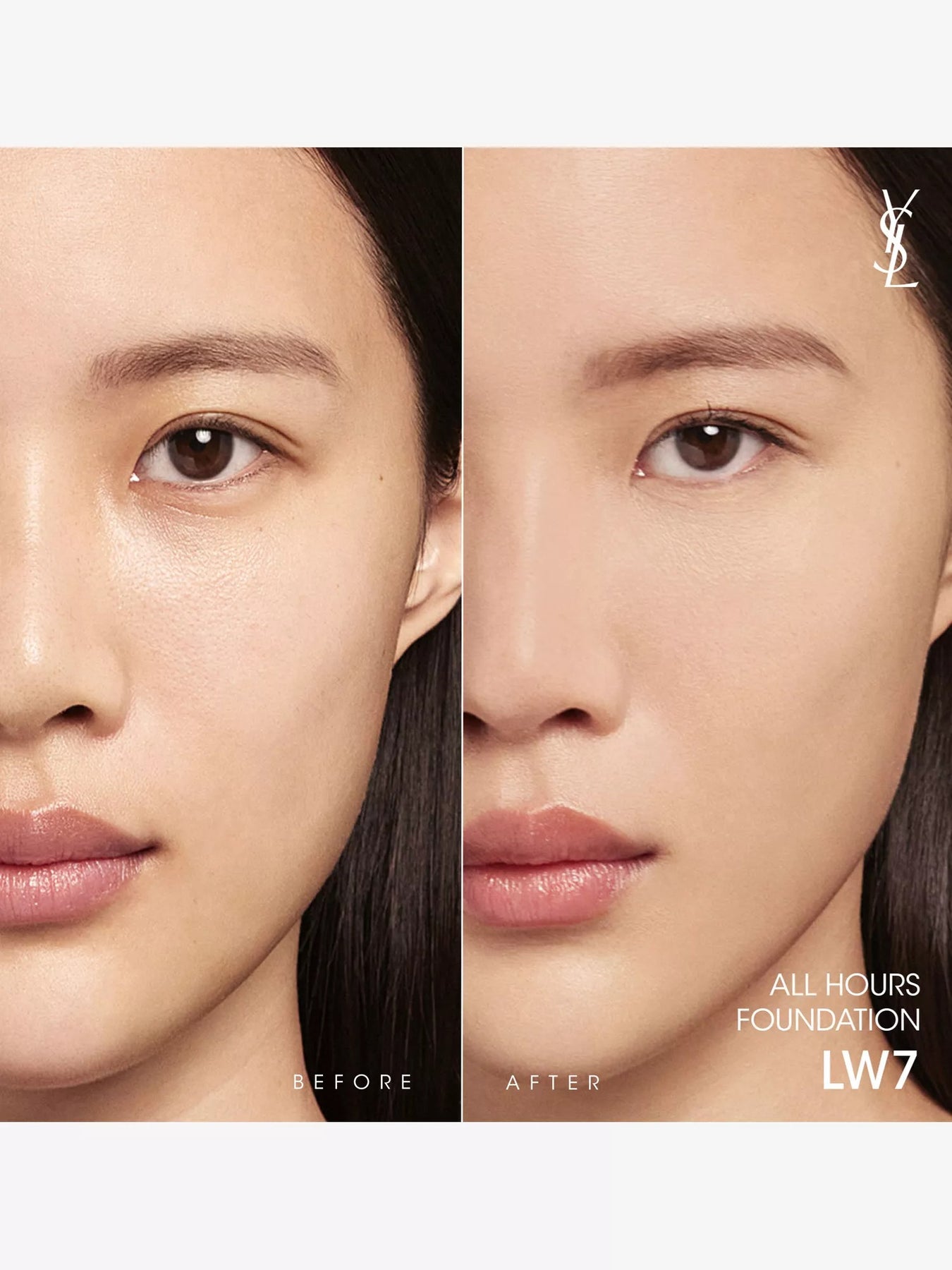 Application: Glide All Hours foundation from the centre of the face outwards to unify the complexion. Using a dabbing gesture, build up coverage where needed.