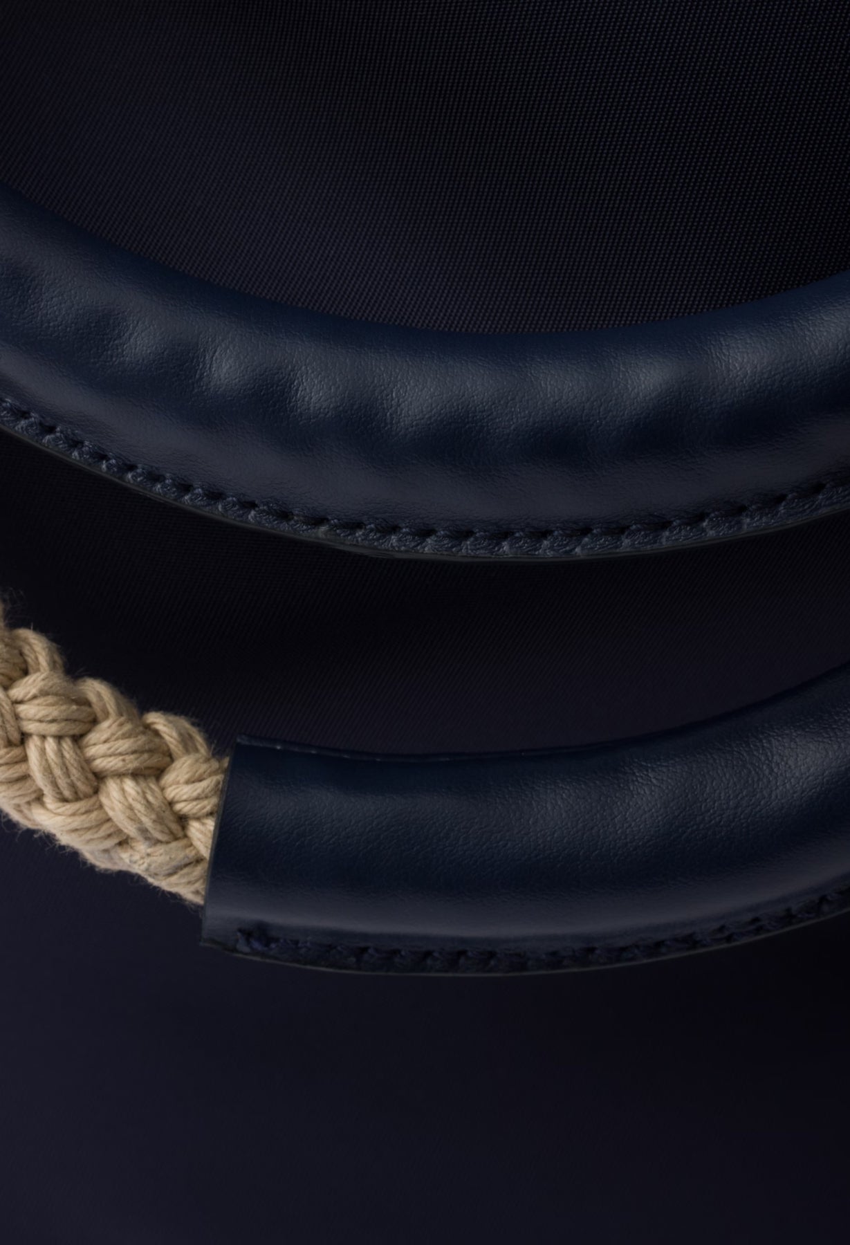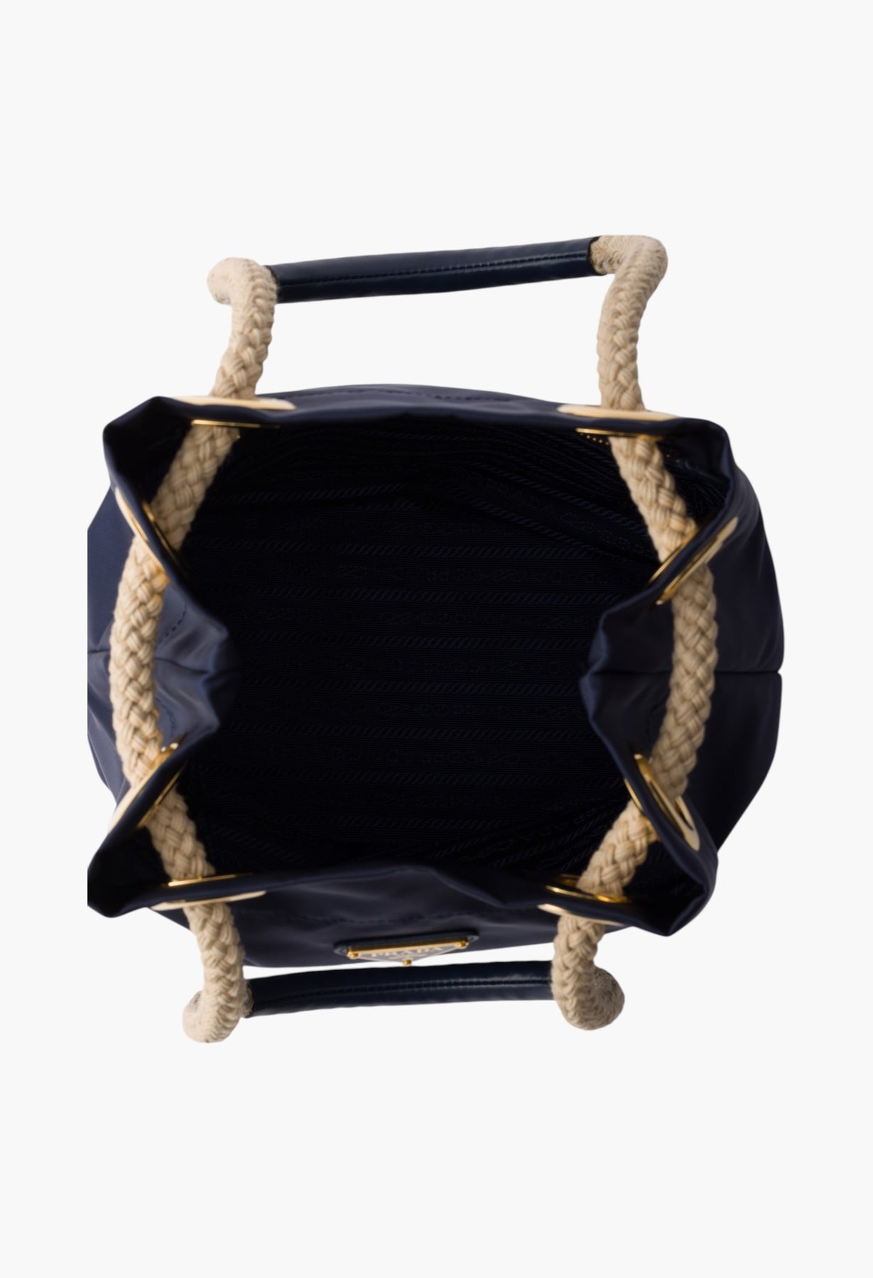 Unusual combinations animate this Re-Nylon bag inspired by the timeless codes of nautical style. Sliding cord handles underline the versatile character of the accessory that can be worn carried by hand or over the shoulder, completed by the enameled metal triangle logo.