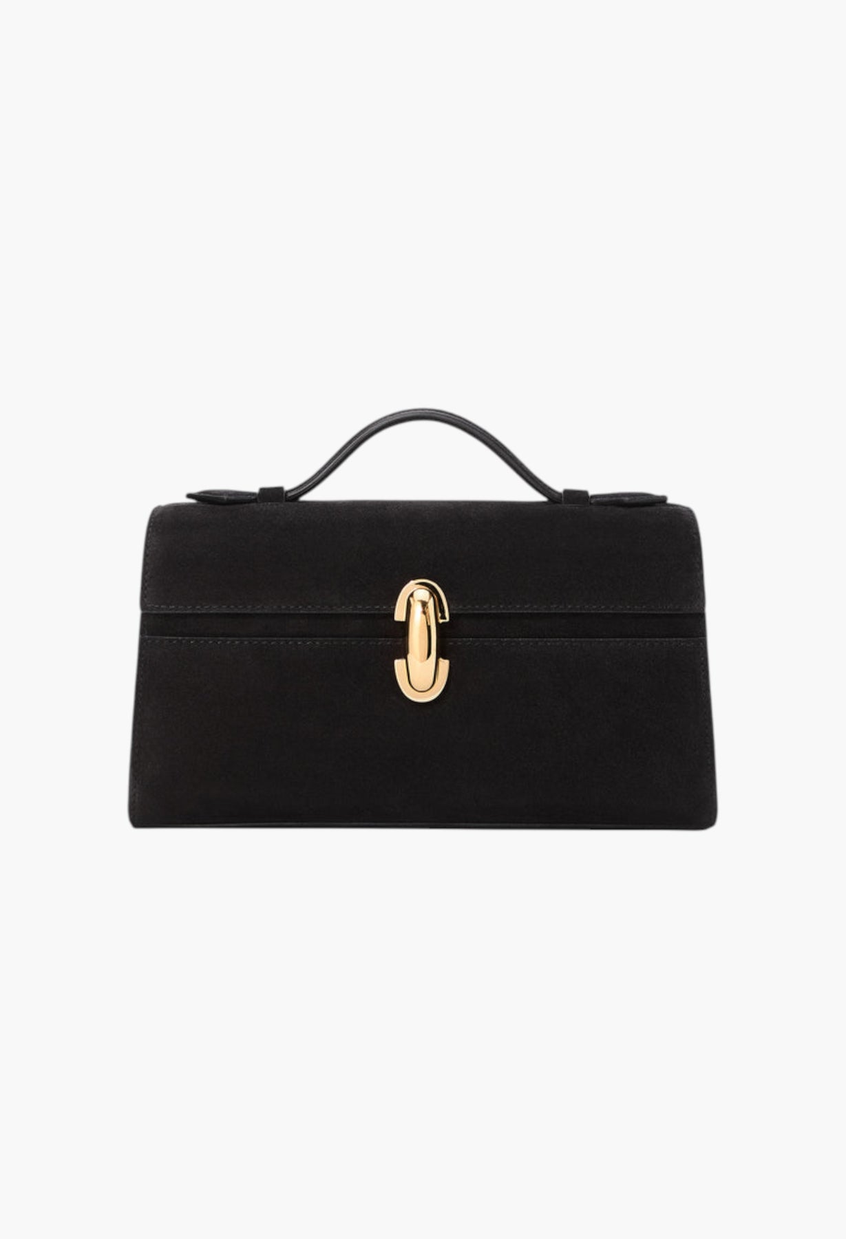 It features our signature Symmetry turnlock, one interior pocket, and a leather handle.