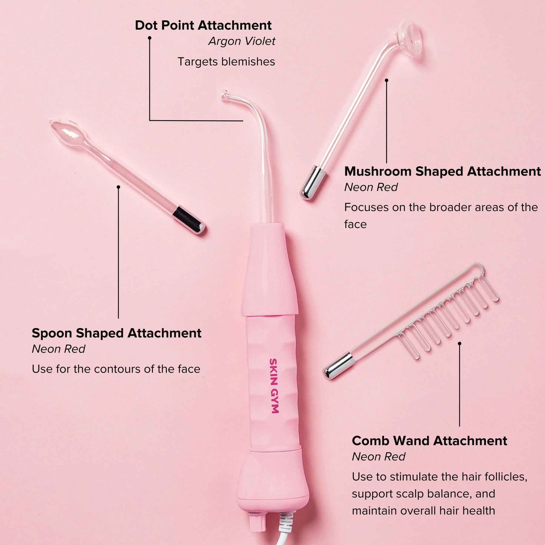 Experience transformative skincare with our High-Frequency Wand. This device features Neon and Argon Gas electrodes that emit a gentle electrical current to help kill acne-causing bacteria and reduce redness and inflammation temporarily for your most radiant skin yet. This versatile tool comes with four specialized attachments to cater to your unique skincare needs: a spoon, dot, and mushroom attachment for targeted facial treatments, plus a comb attachment designed to stimulate the scalp and promote hair health. With an adjustable intensity dial, secure storage case, and our signature Skin Gym pink design, this High-Frequency Wand offers a professional-grade skincare experience you'll look forward to every day.