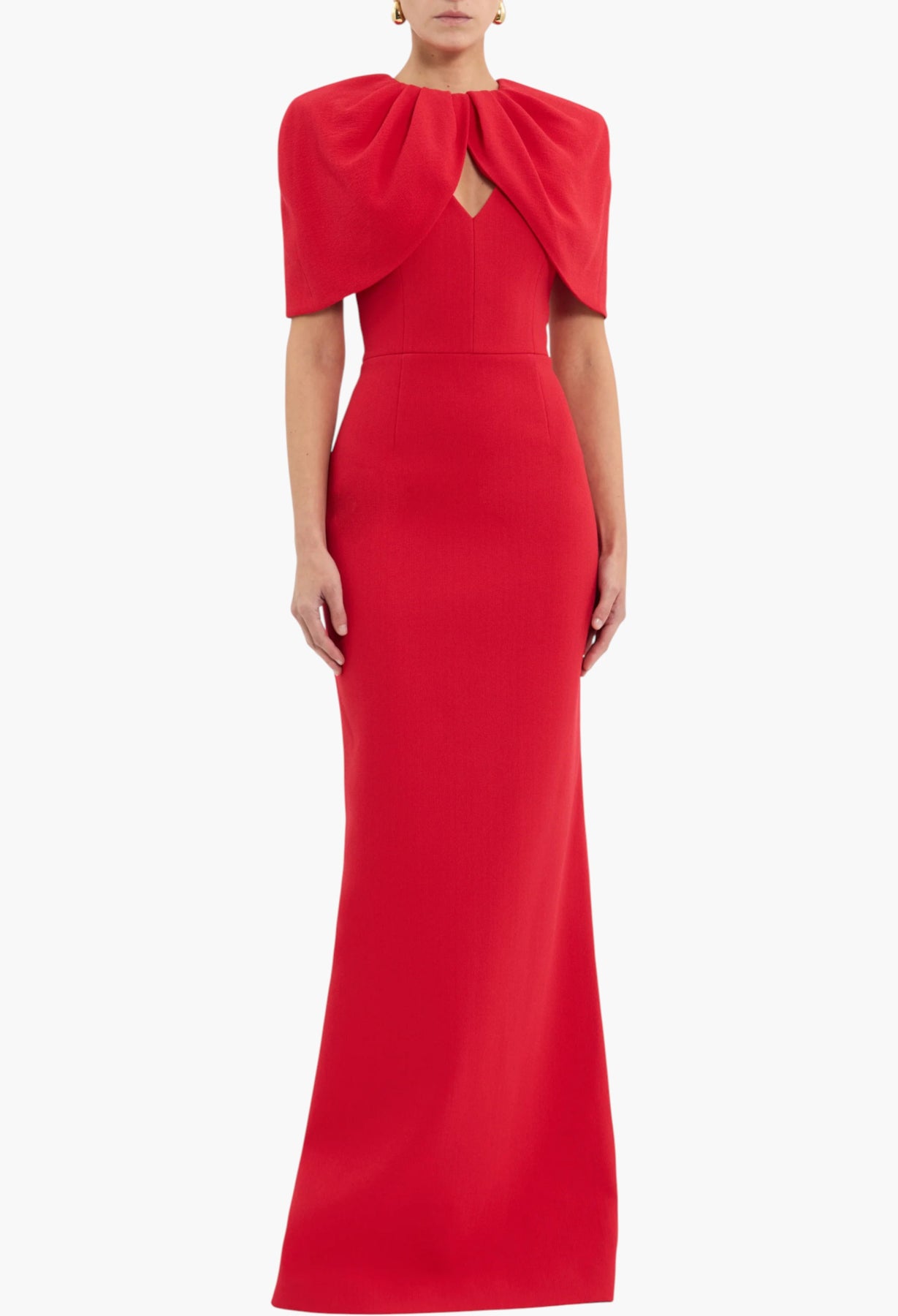 The Cameron Gown is a striking red masterpiece, perfect for anyone searching for elegant ملابس نسائية that blend timeless sophistication with modern design. Tailored from bonded crepe, the gown features a draped cape overlay flowing effortlessly from the V neckline and fitted bodice, while princess seams accentuate the feminine silhouette.