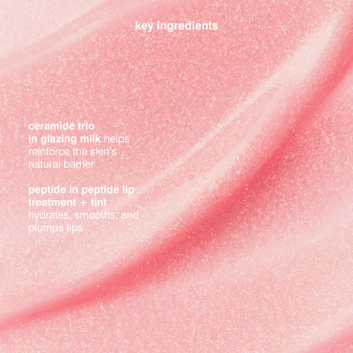 What Else You Need to Know: New glazed skin and lip essentials for nights out. Glazing Milk is a ceramide essence for hydrated, glowy skin. Peptide Lip Treatment in Strawberry Glaze is a nourishing gloss with a fresh strawberry glazed donut scent. Peptide Lip Tint in Jelly Bean has a hint of shimmery baby pink and a sweet jellybean scent.