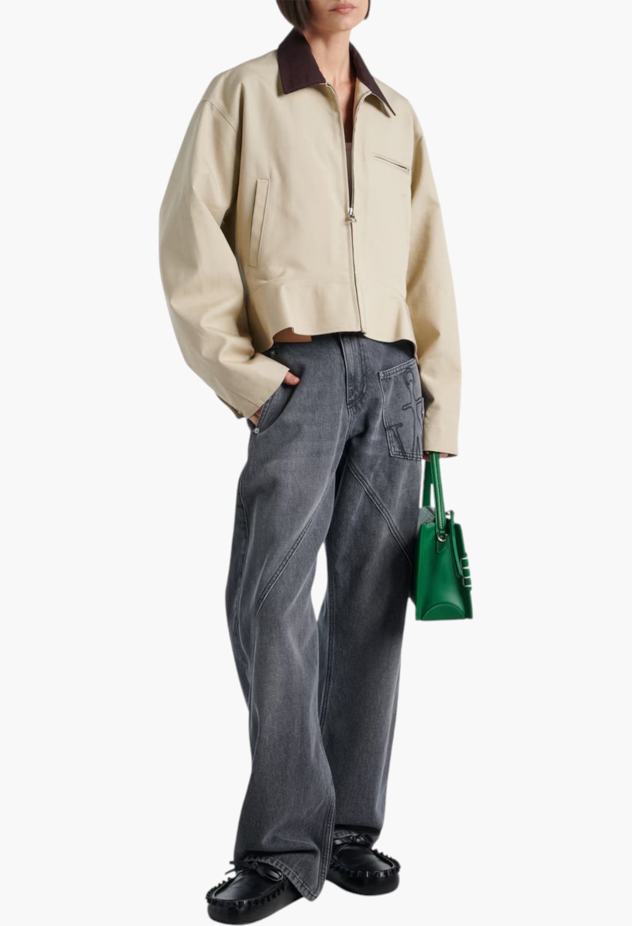 This JW Anderson jacket is the perfect outerwear choice for elevated ملابس كاجوال, designed to carry you through transitional weather with ease. Crafted from 100% cotton, it features a curved hemline, a zipped front, and a contrasting collar that adds a modern, sculptural touch—making it a standout piece for refined ملابس كاجوال styling.