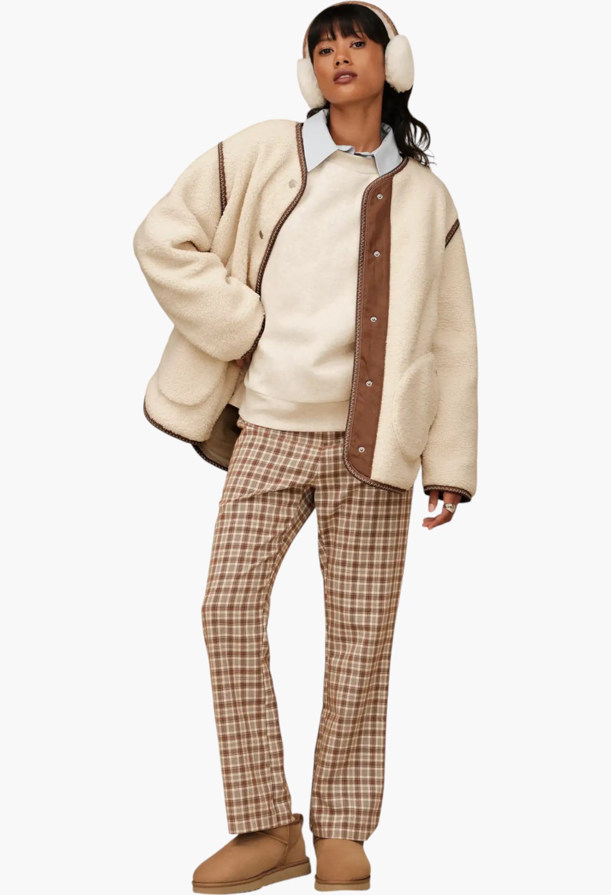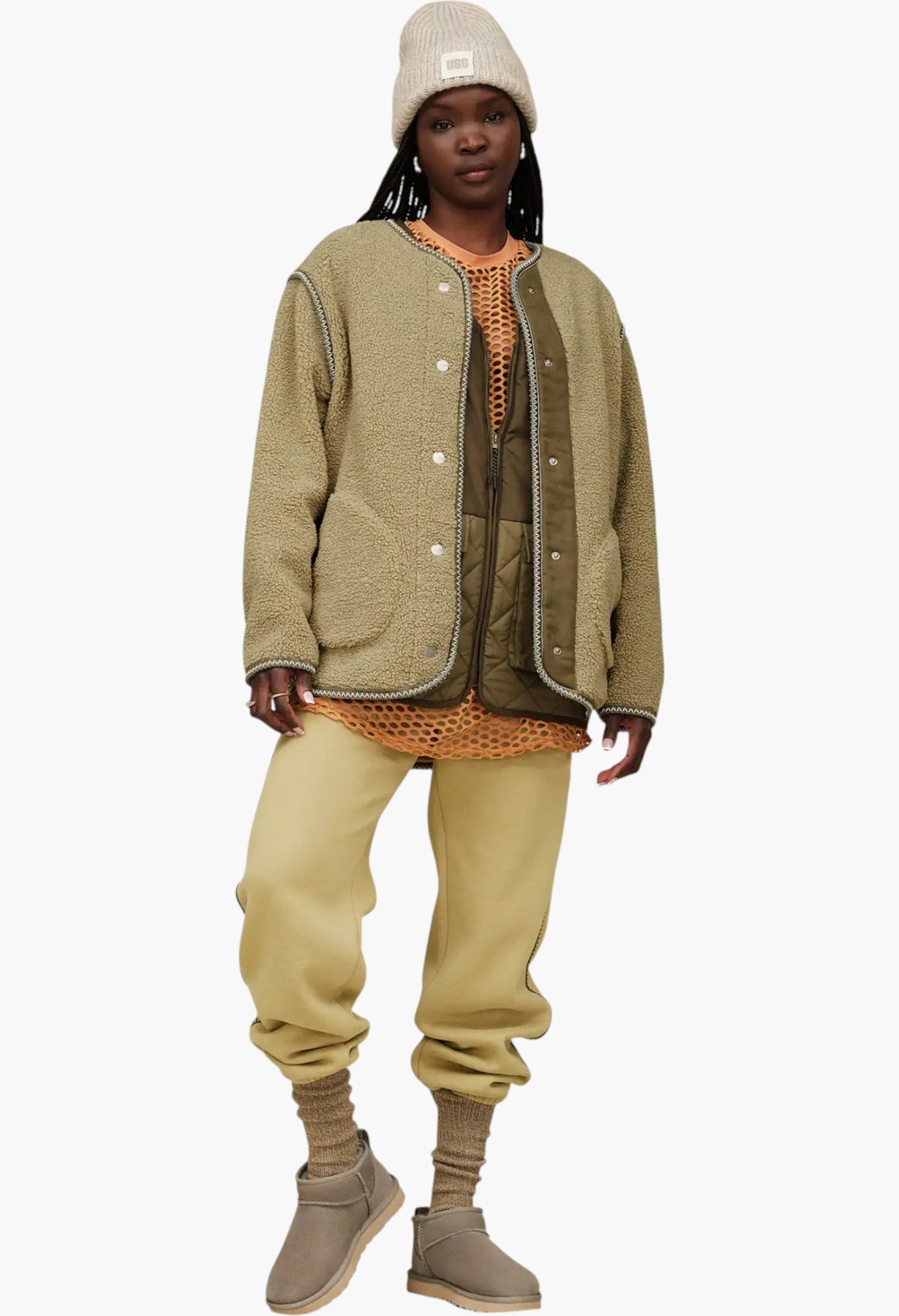 • UGGbraid made with 100% recycled polyester fibers, Suede heel counter, Suede vamp, Padded collar, 10mm curly sheepskin shaft