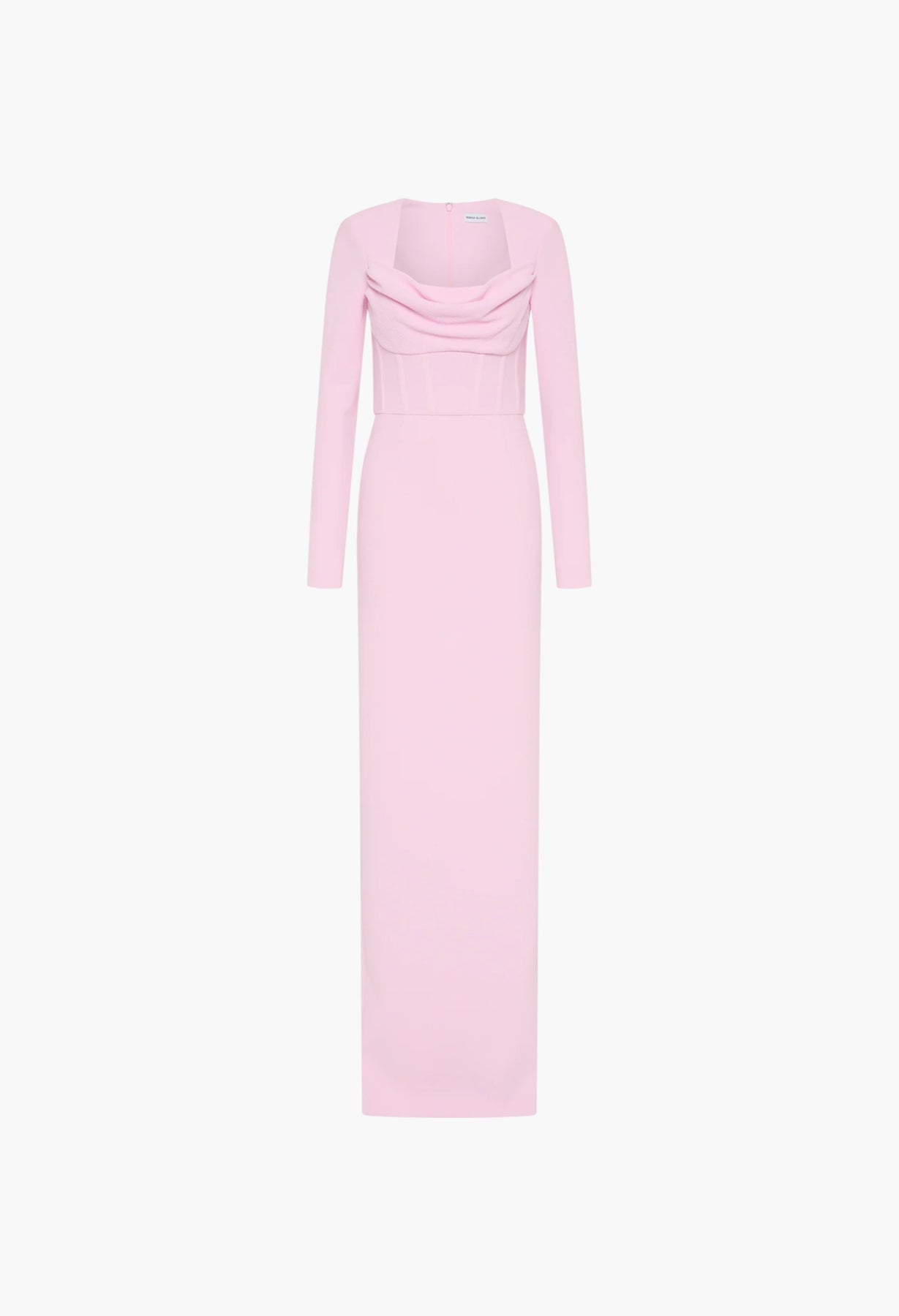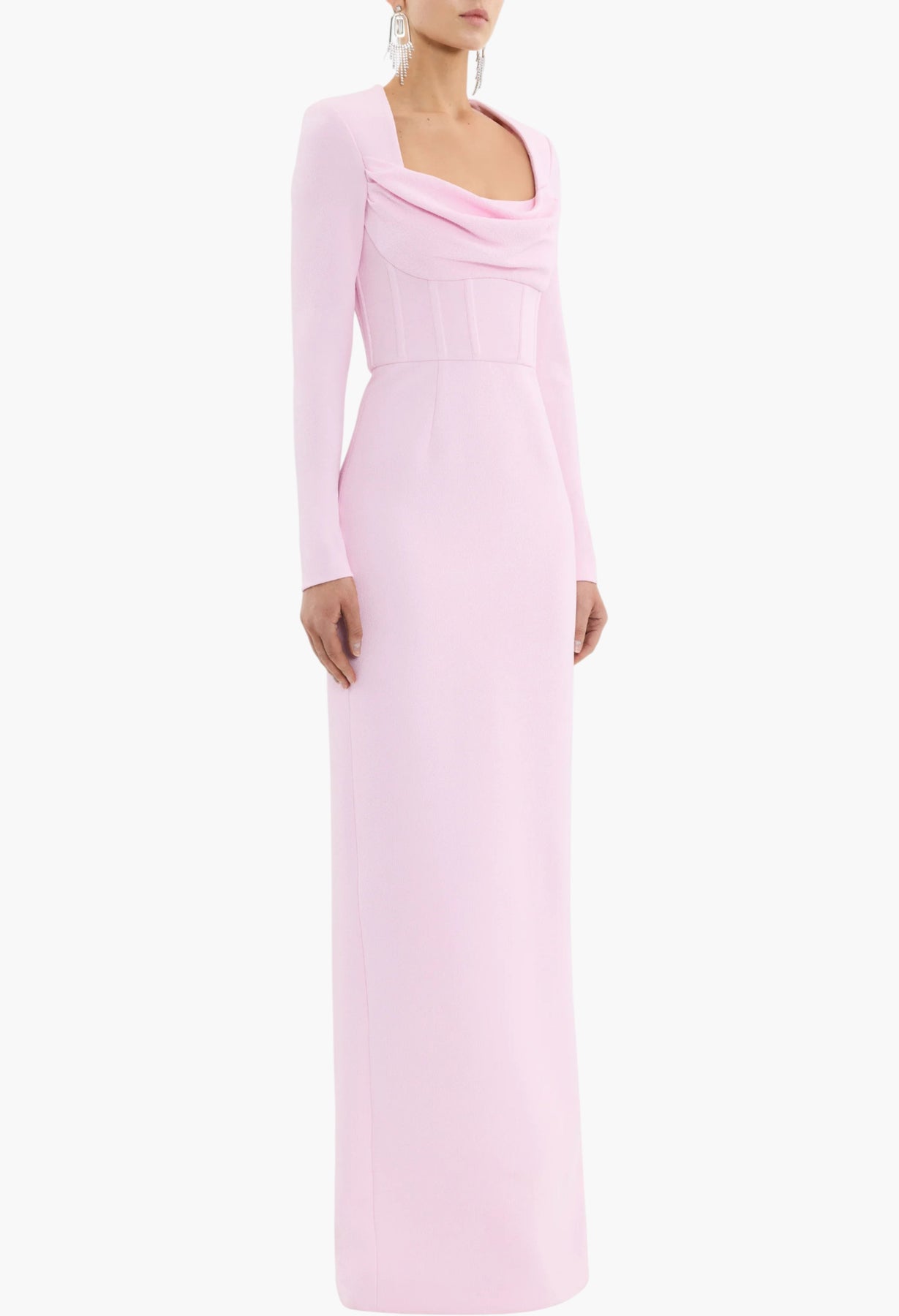 The Nemy Gown in pink epitomises sophistication and refined style, tailored from bonded crepe. Highlighting a graceful cowl neckline, its long sleeves and structured fitted bodice with internal bonding create an elegant silhouette, cinched at the waist to accentuate the feminine figure. The column maxi skirt features a back split for ease of movement, while lining ensures comfort. Secured with a zip fastening at the back, this gown is a timeless choice for your next special occasion.
