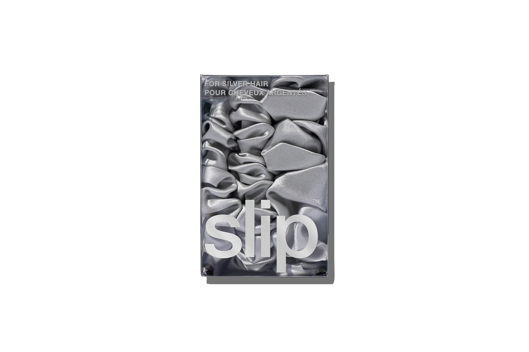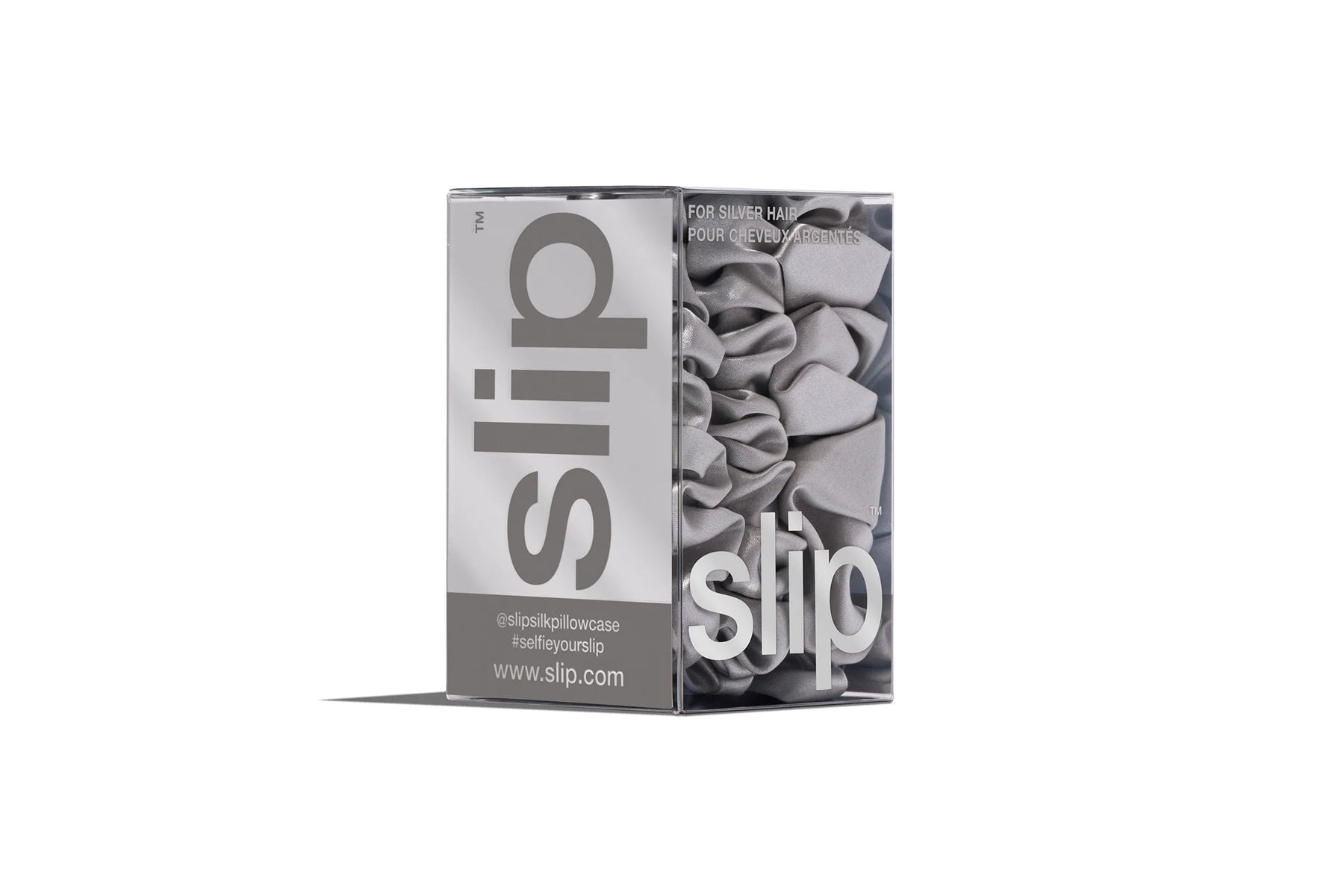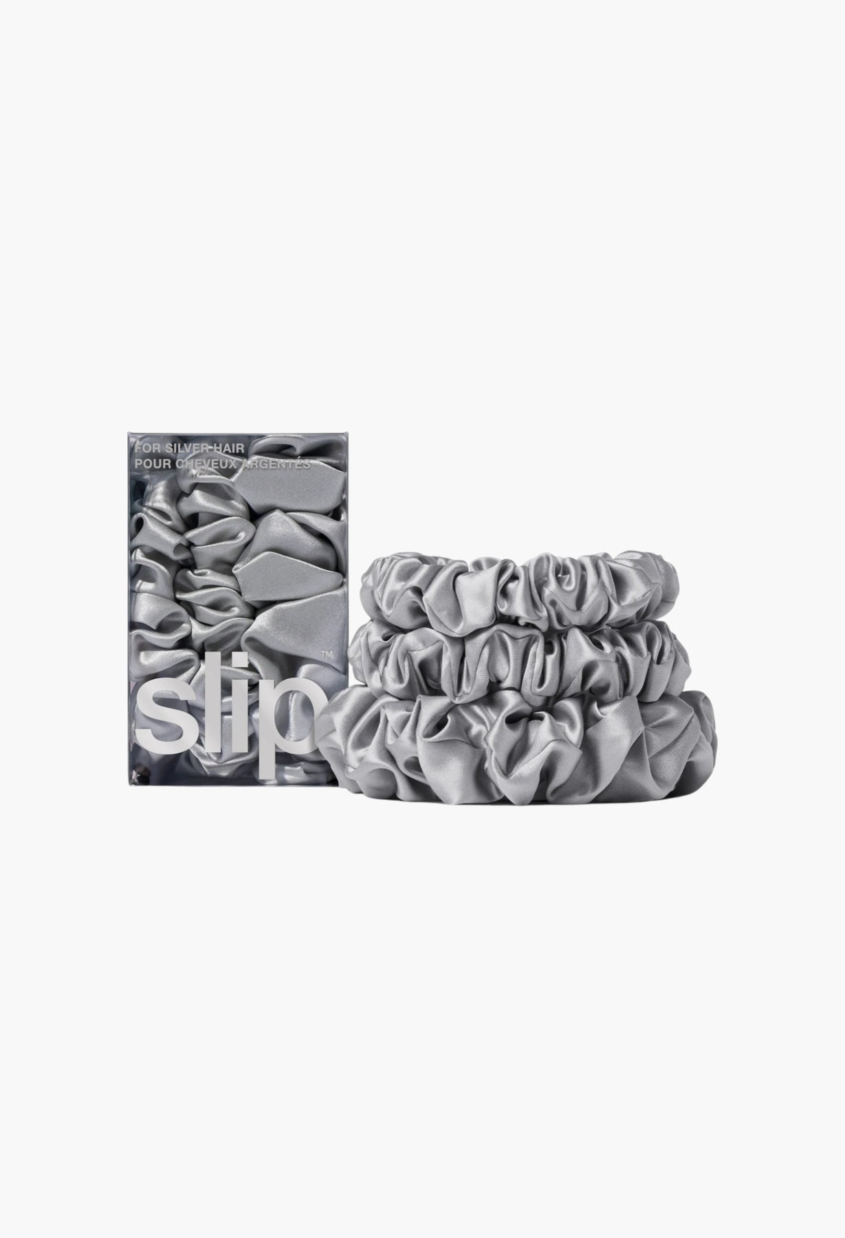 This set includes: 2 x silver slipsilk™ midi scrunchies and 1 x silver slipsilk™ large scrunchie.