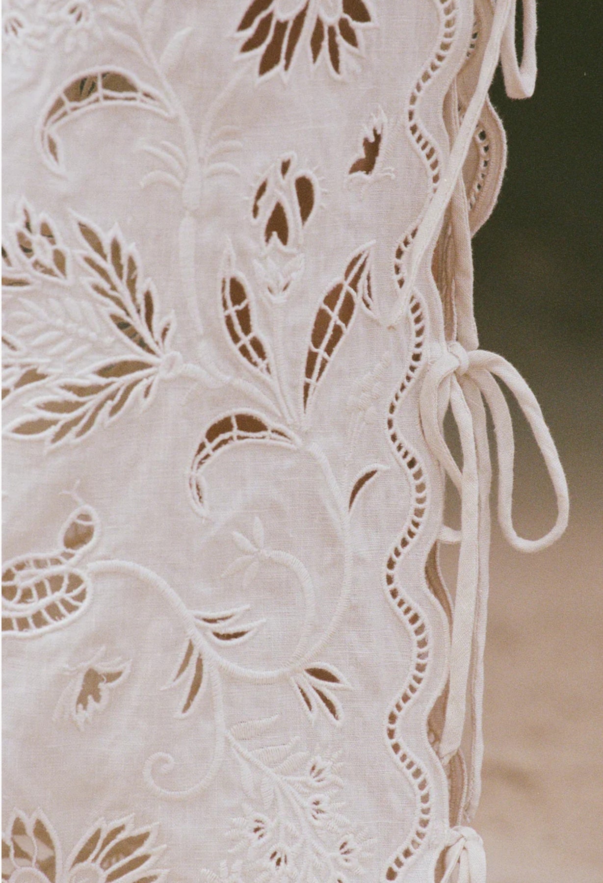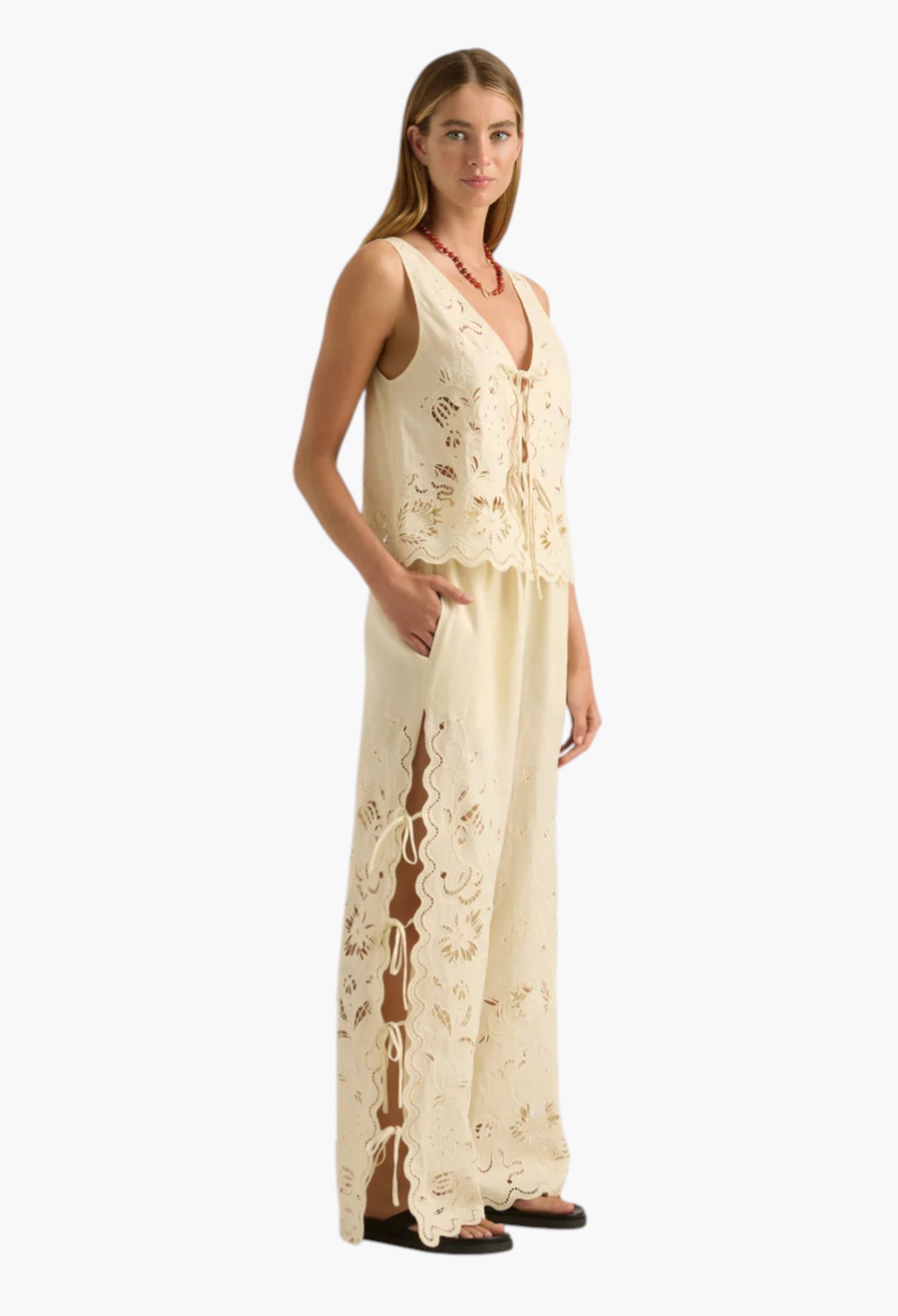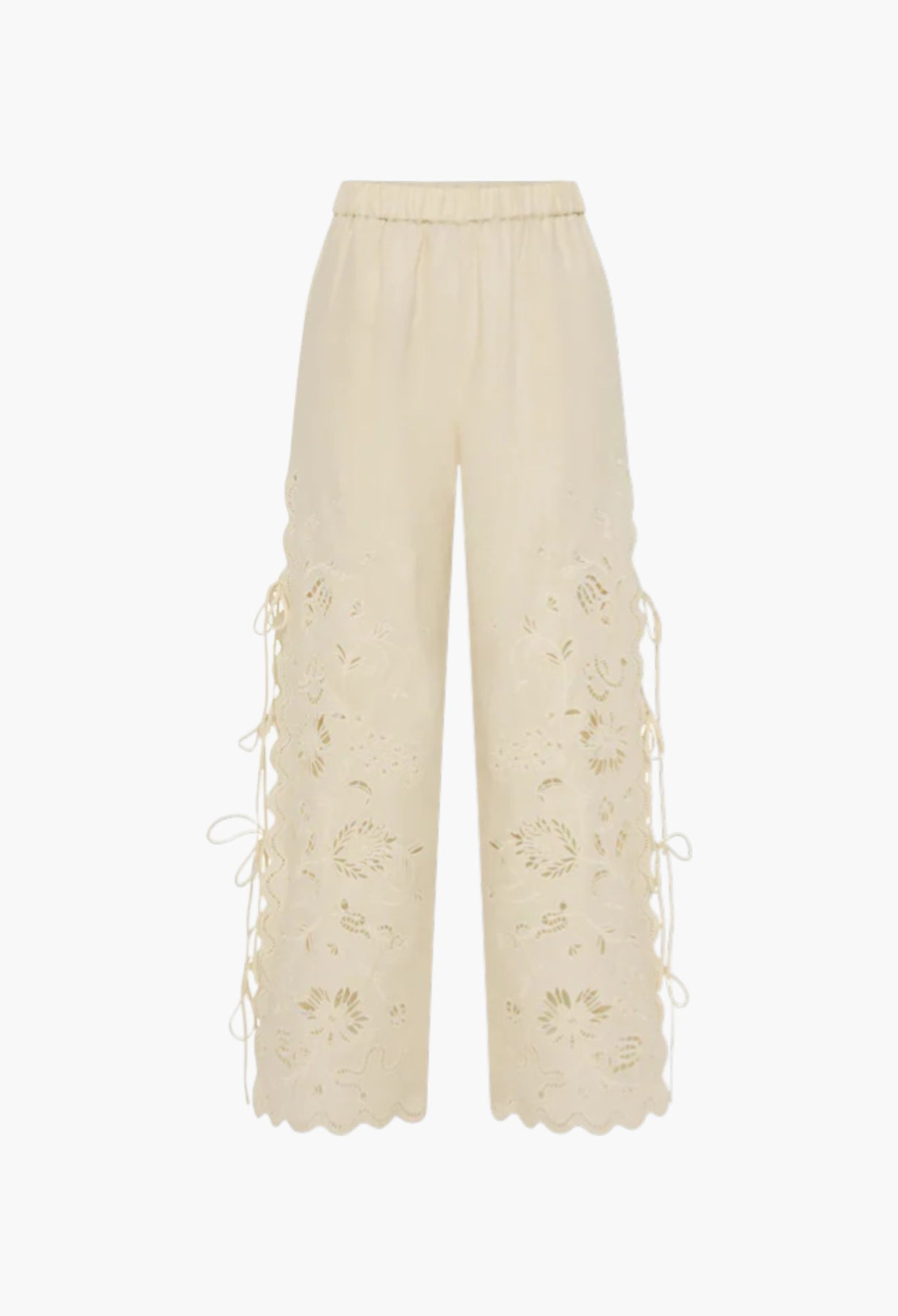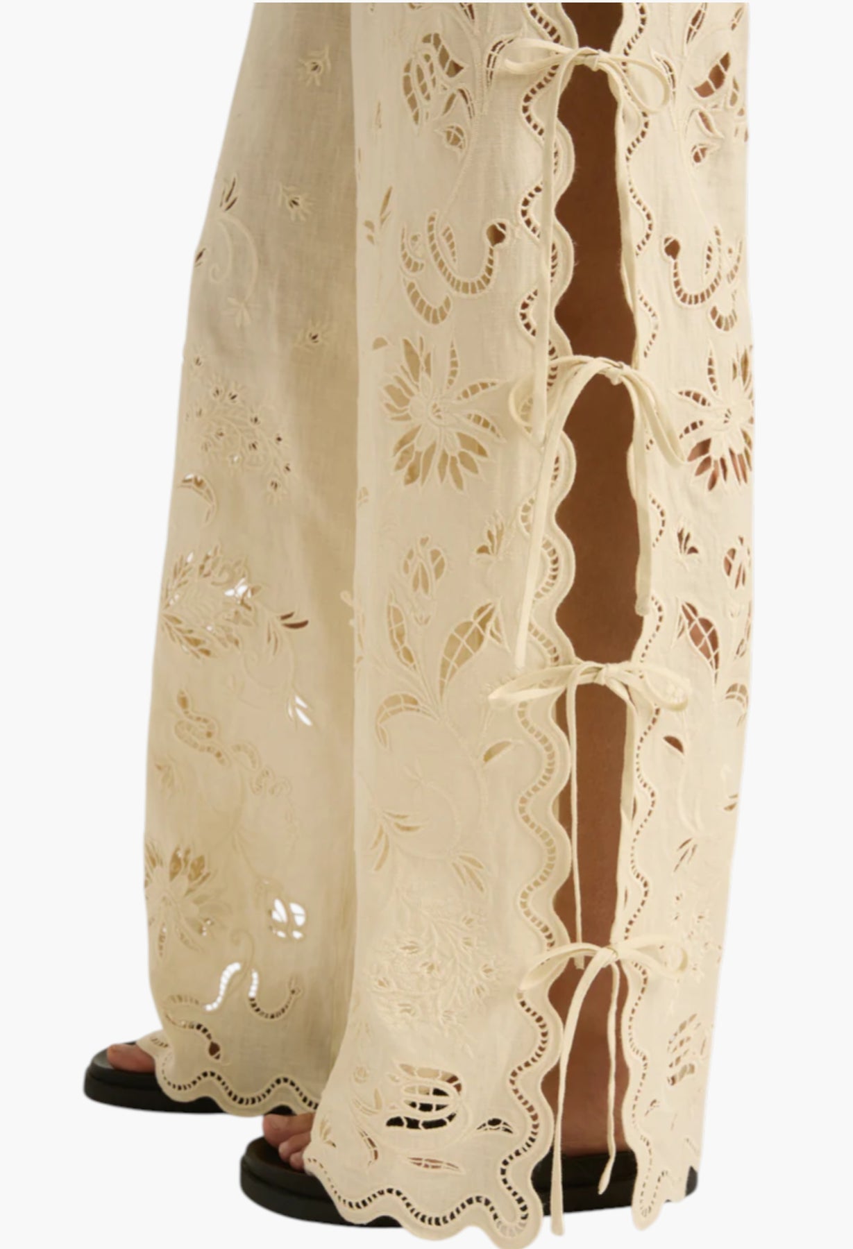 The Sadie Pants feature open sides with tie closures and a custom broderie anglaise design