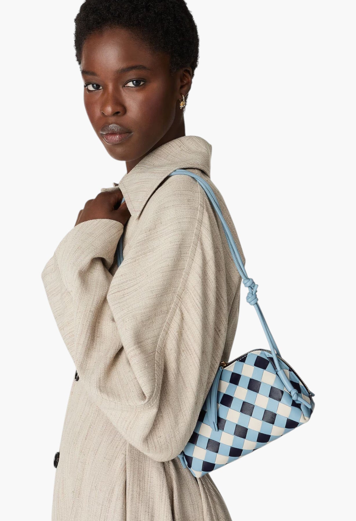 Pouch in Intrecciato nappa leather with vichy pattern and adjustable tubular strap featuring sliding knot details.