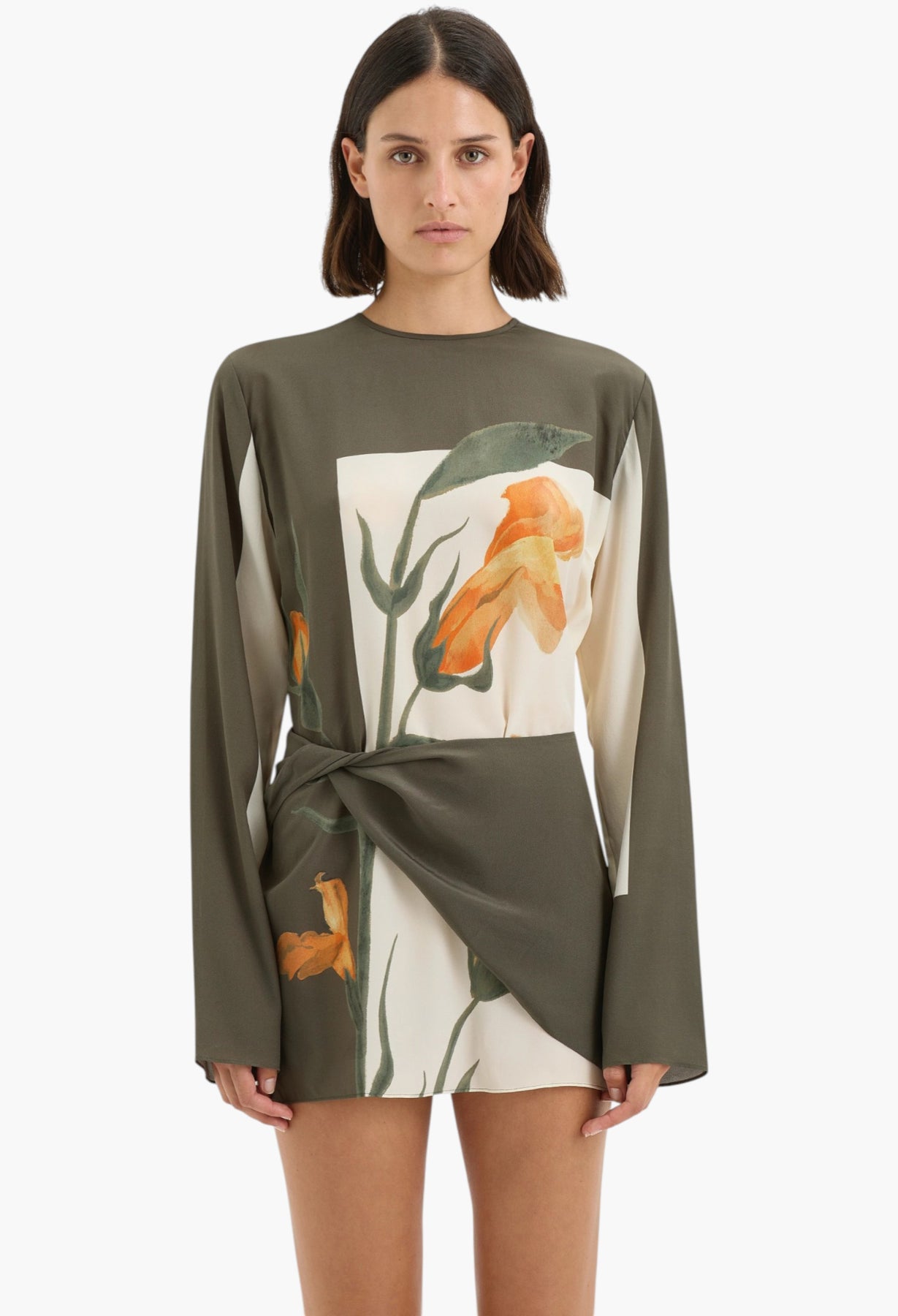The Constance Twist Mini Dress is crafted from lightweight silk crepe, patterned with painterly florals and statement borders. Designed for a relaxed fit, it features long sleeves with a soft flare and a contrasting overlayer with a twist detail at the waist.
