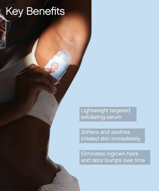 A targeted exfoliating serum that eliminates ingrown hairs and razor bumps while soothing and softening irritated skin, discouraging the formation of visible bumps in the armpits, bikini area, face, and neck.